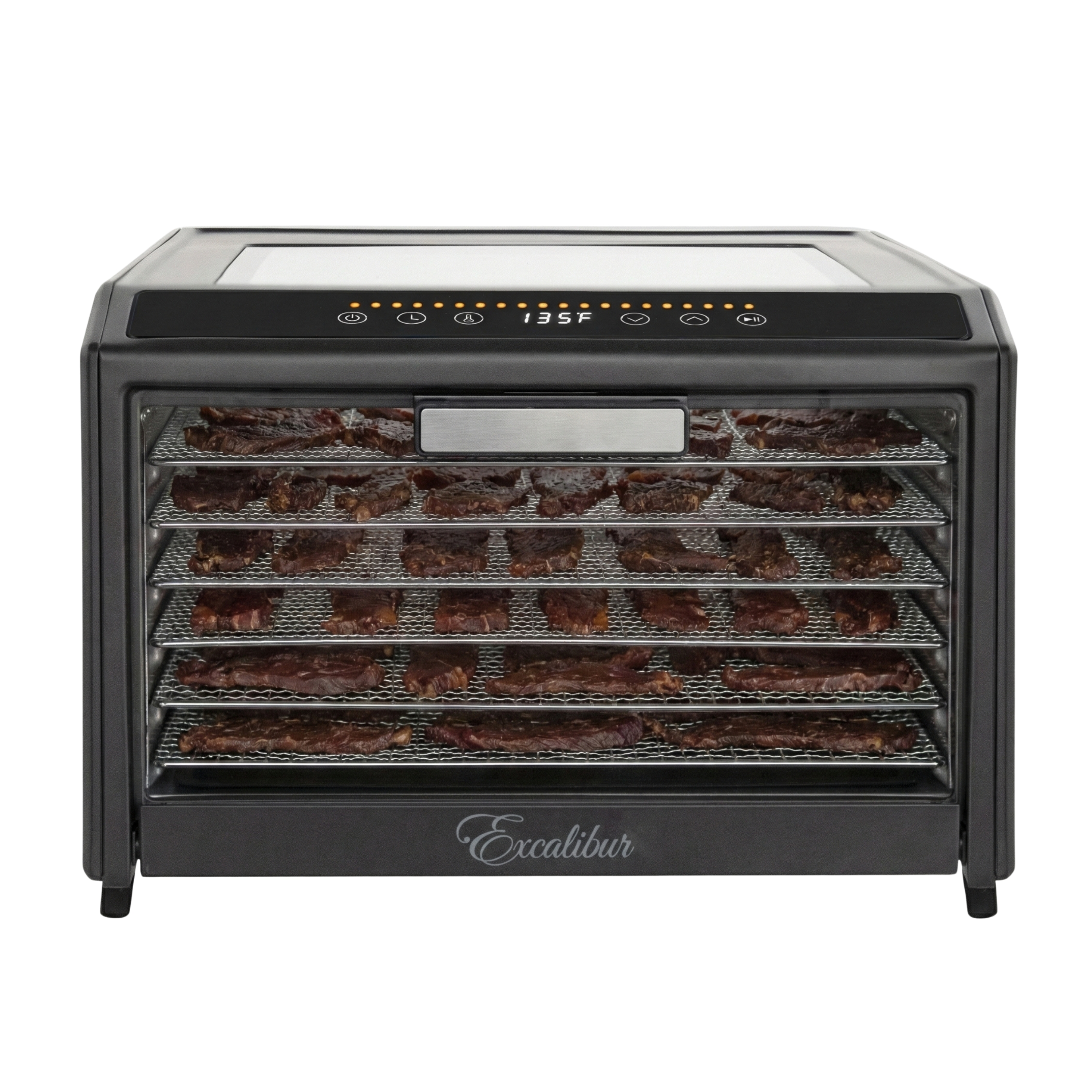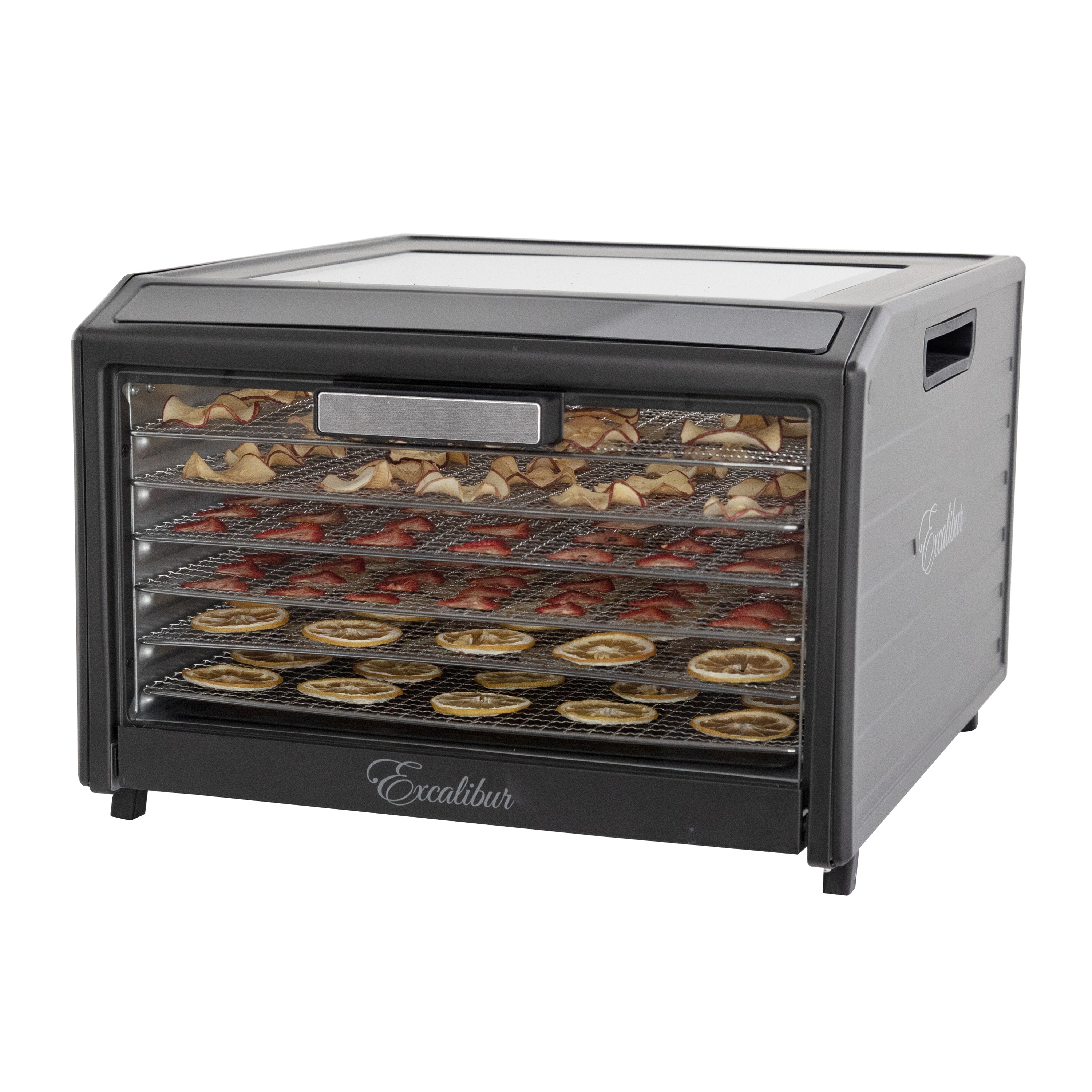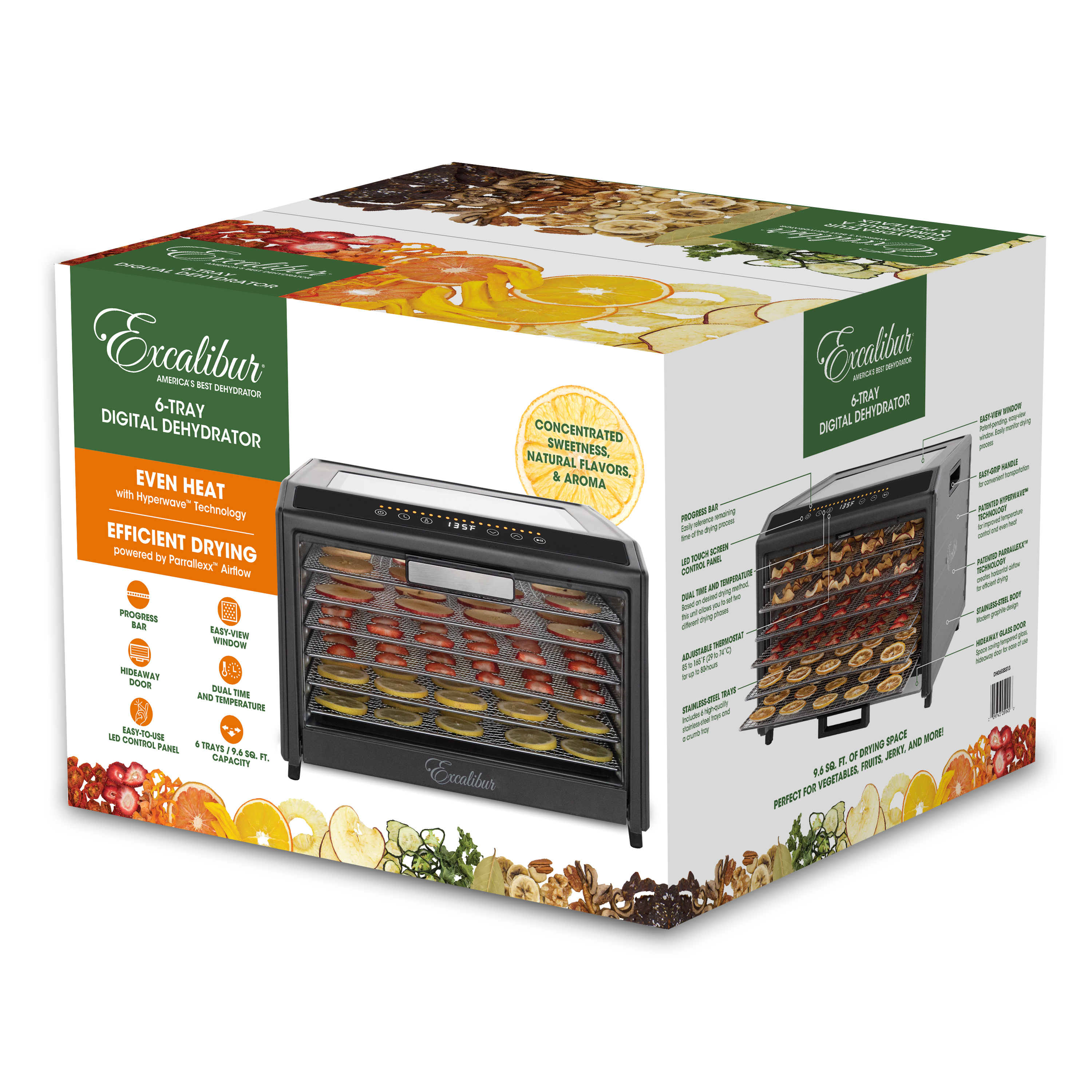 | Long Description | Preserve your food with the Excalibur 6 Tray Performance Digital Dehydrator. This expertly crafted stainless-steel dehydrator features 9.6 square feet of drying space and includes six stainless steel trays, offering plenty of space to meet all your dehydrating needs. The patented Hyperwave Technology along with the Horizontal Parallex Air Flow fluctuates the temperature to remove water from food with a continuous circulation of thermostatically controlled warm air for even drying without tray rotation. Set precise time and temperature with the easy-to-use LED control panel with temperature ranging from 85°F to 165°F for up to 80 hours. To accommodate various drying methods, this premium dehydrator also allows you to set 2 different drying phases at different times and temperatures. In addition, the control panel also features a progress bar that provides a visual representation of drying progress and the unit will automatically shut off when drying is complete. Monitor the drying process without opening the door through the top clear glass window. When drying is complete, slide the hideaway door under the unit for easy access to your dehydrated goods. This unit is perfect for you, whether you are drying vegetables, fruits, herbs, meat, flowers and more. Preserve your seasonal harvest or fresh catch, create healthier treats or simply get crafty with this high-quality Excalibur dehydrator. Explore the world of preservation and get creative with the included digital book, "Preserve it Naturally.” Covered by the Excalibur Three-Year Limited Warranty. |
