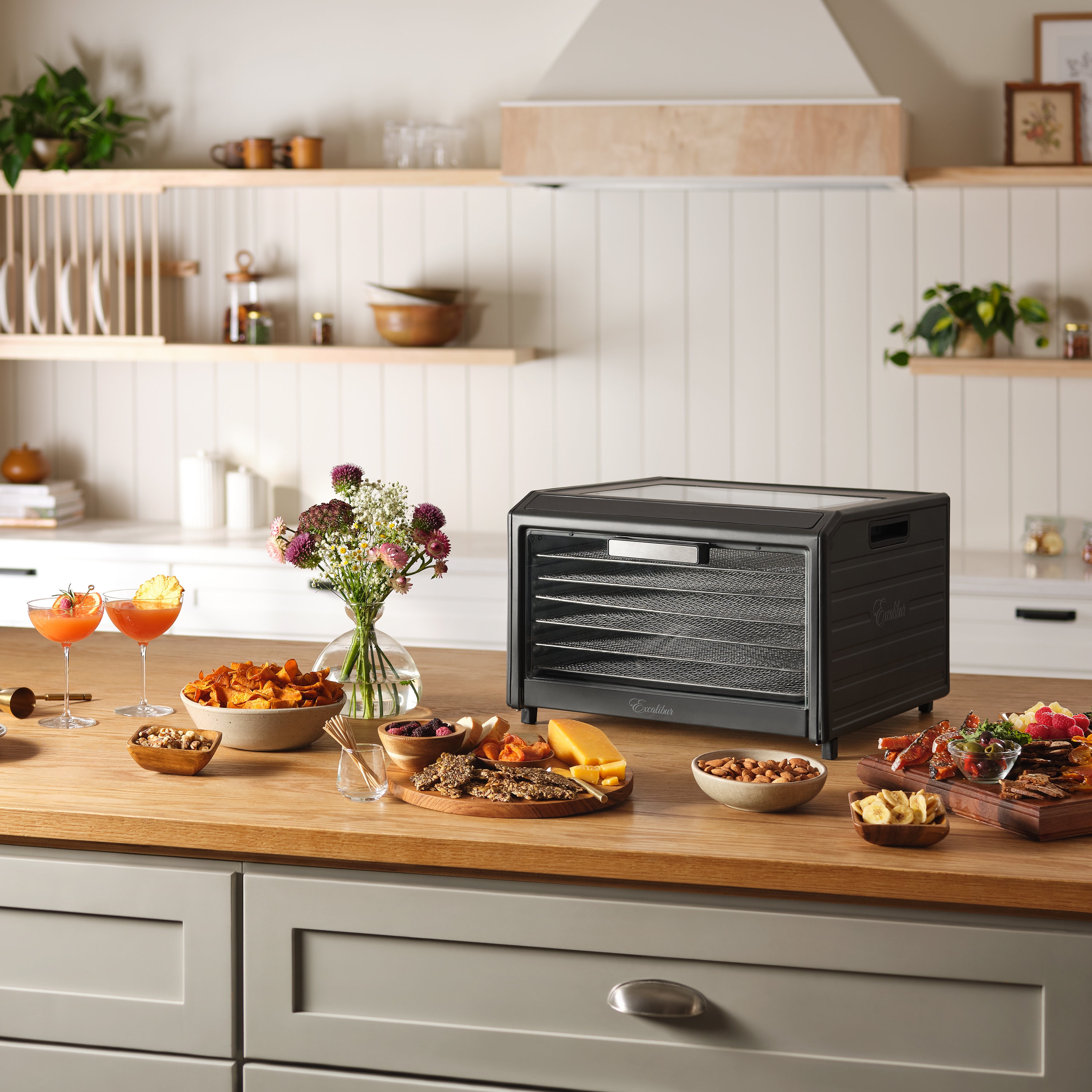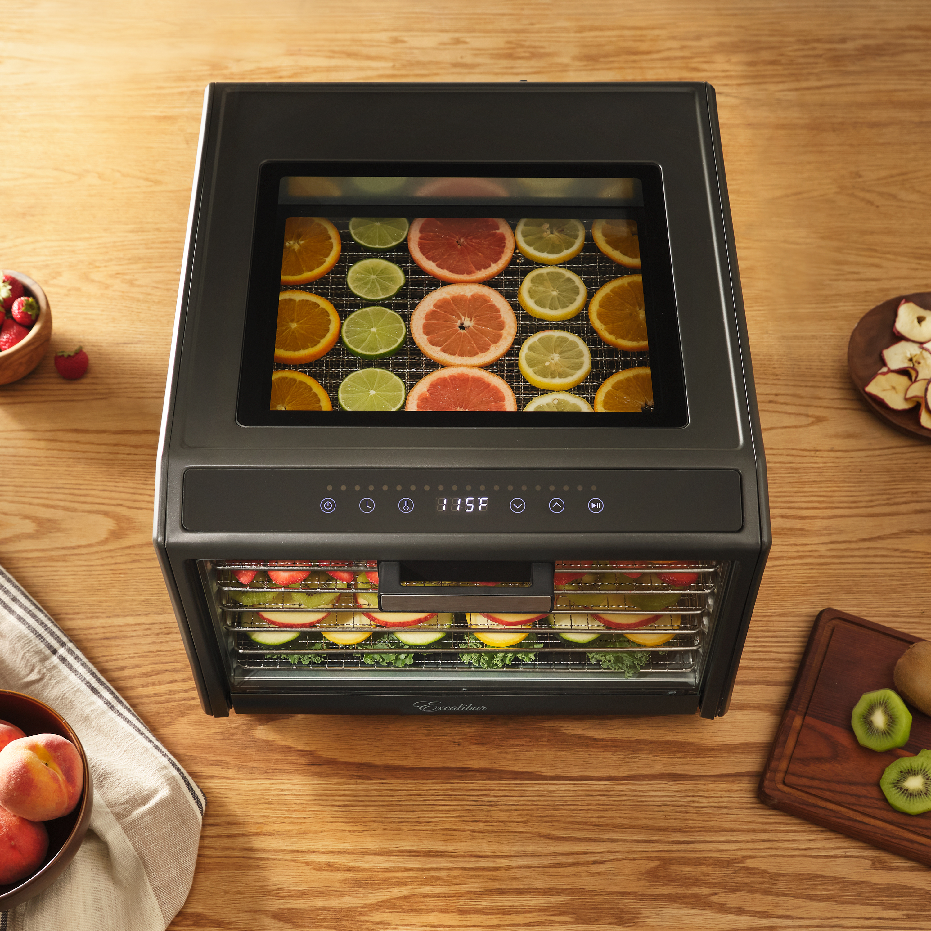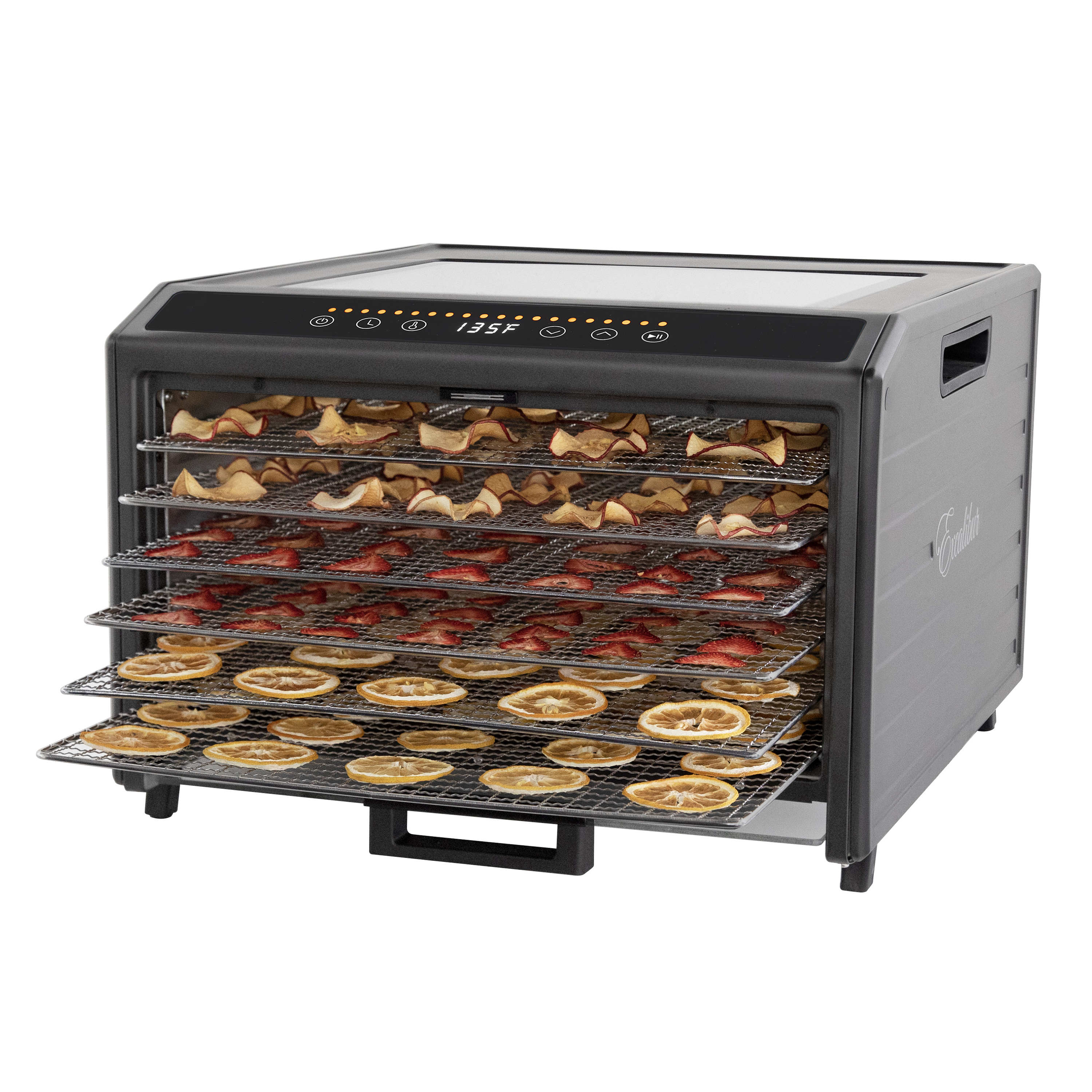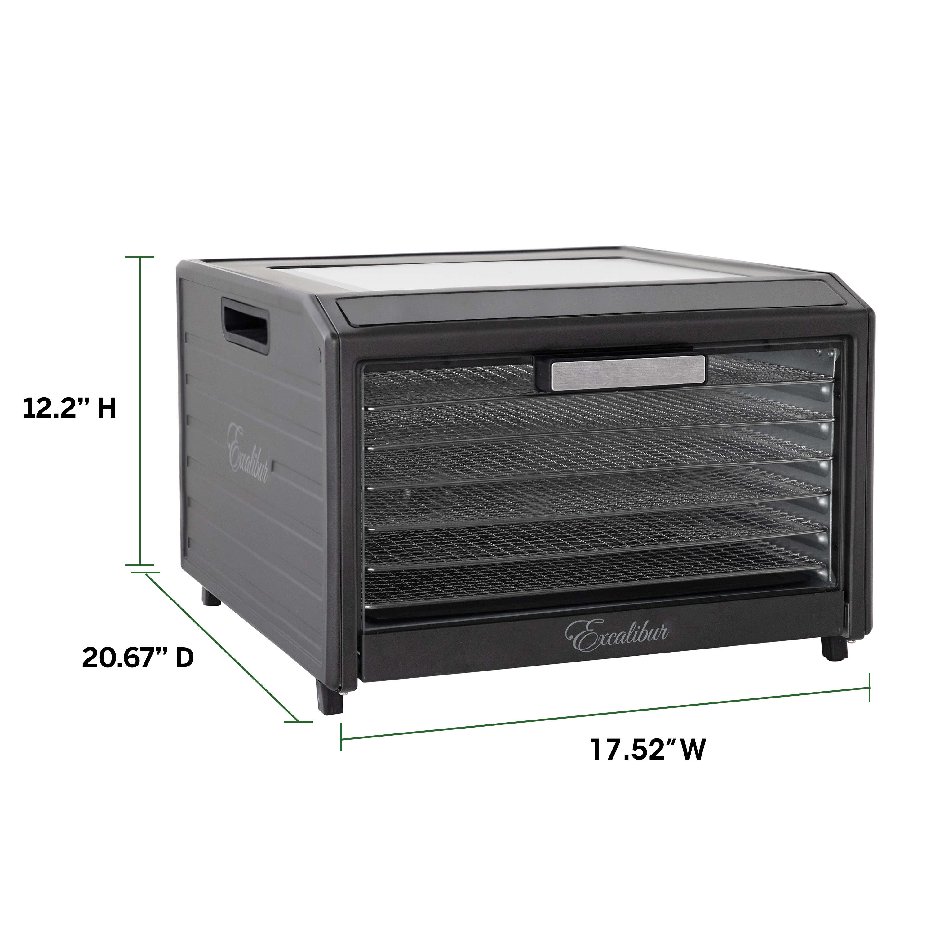 | Long Description | Preserve your food with the Excalibur 6 Tray Performance Digital Dehydrator. This expertly crafted stainless-steel dehydrator features 9.6 square feet of drying space and includes six stainless steel trays, offering plenty of space to meet all your dehydrating needs. The patented Hyperwave Technology along with the Horizontal Parallex Air Flow fluctuates the temperature to remove water from food with a continuous circulation of thermostatically controlled warm air for even drying without tray rotation. Set precise time and temperature with the easy-to-use LED control panel with temperature ranging from 85°F to 165°F for up to 80 hours. To accommodate various drying methods, this premium dehydrator also allows you to set 2 different drying phases at different times and temperatures. In addition, the control panel also features a progress bar that provides a visual representation of drying progress and the unit will automatically shut off when drying is complete. Monitor the drying process without opening the door through the top clear glass window. When drying is complete, slide the hideaway door under the unit for easy access to your dehydrated goods. This unit is perfect for you, whether you are drying vegetables, fruits, herbs, meat, flowers and more. Preserve your seasonal harvest or fresh catch, create healthier treats or simply get crafty with this high-quality Excalibur dehydrator. Explore the world of preservation and get creative with the included digital book, "Preserve it Naturally.” Covered by the Excalibur Three-Year Limited Warranty. |