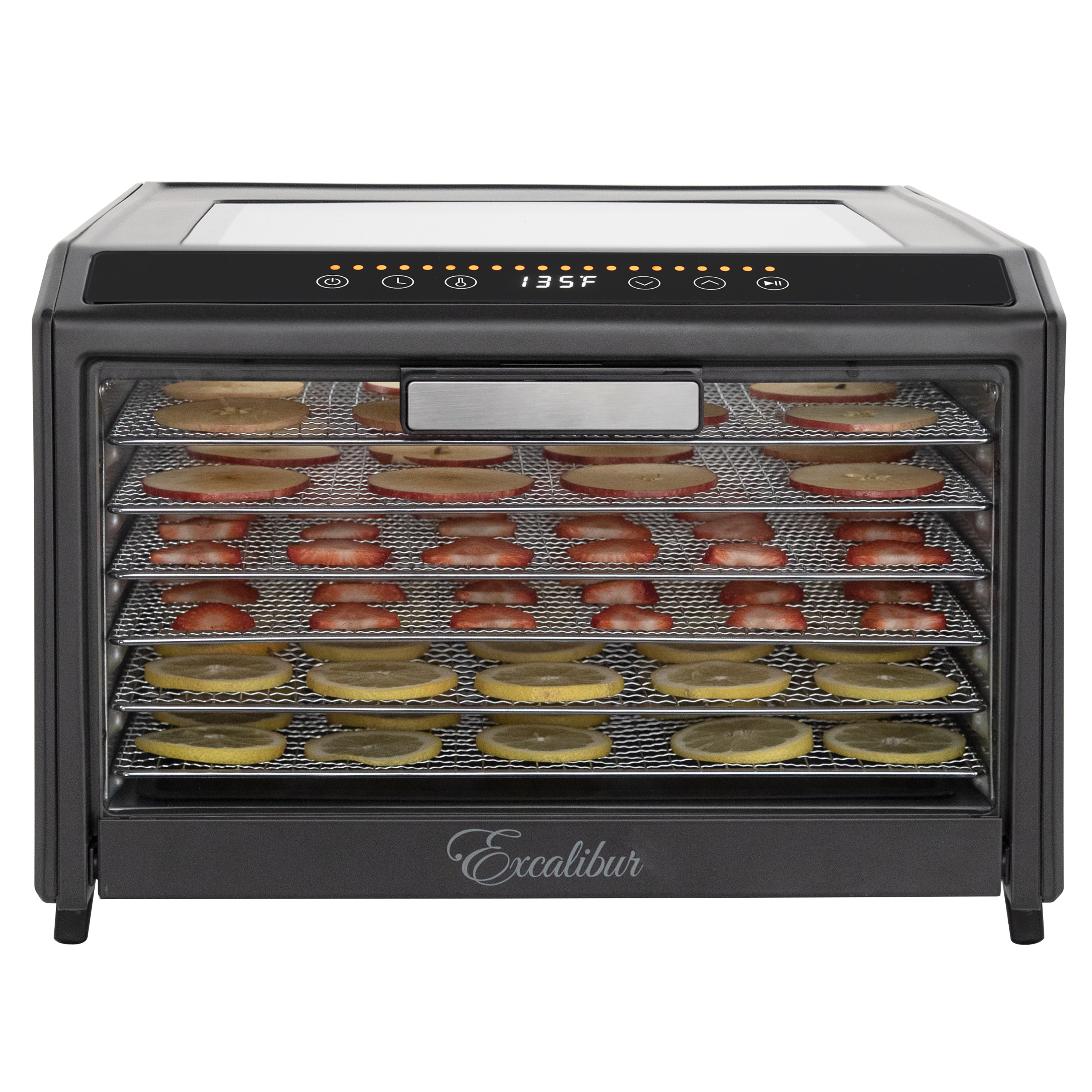 | Long Description | Preserve your food with the Excalibur 6 Tray Performance Digital Dehydrator. This expertly crafted stainless-steel dehydrator features 9.6 square feet of drying space and includes six stainless steel trays, offering plenty of space to meet all your dehydrating needs. The patented Hyperwave Technology along with the Horizontal Parallex Air Flow fluctuates the temperature to remove water from food with a continuous circulation of thermostatically controlled warm air for even drying without tray rotation. Set precise time and temperature with the easy-to-use LED control panel with temperature ranging from 85°F to 165°F for up to 80 hours. To accommodate various drying methods, this premium dehydrator also allows you to set 2 different drying phases at different times and temperatures. In addition, the control panel also features a progress bar that provides a visual representation of drying progress and the unit will automatically shut off when drying is complete. Monitor the drying process without opening the door through the top clear glass window. When drying is complete, slide the hideaway door under the unit for easy access to your dehydrated goods. This unit is perfect for you, whether you are drying vegetables, fruits, herbs, meat, flowers and more. Preserve your seasonal harvest or fresh catch, create healthier treats or simply get crafty with this high-quality Excalibur dehydrator. Explore the world of preservation and get creative with the included digital book, "Preserve it Naturally.” Covered by the Excalibur Three-Year Limited Warranty. |