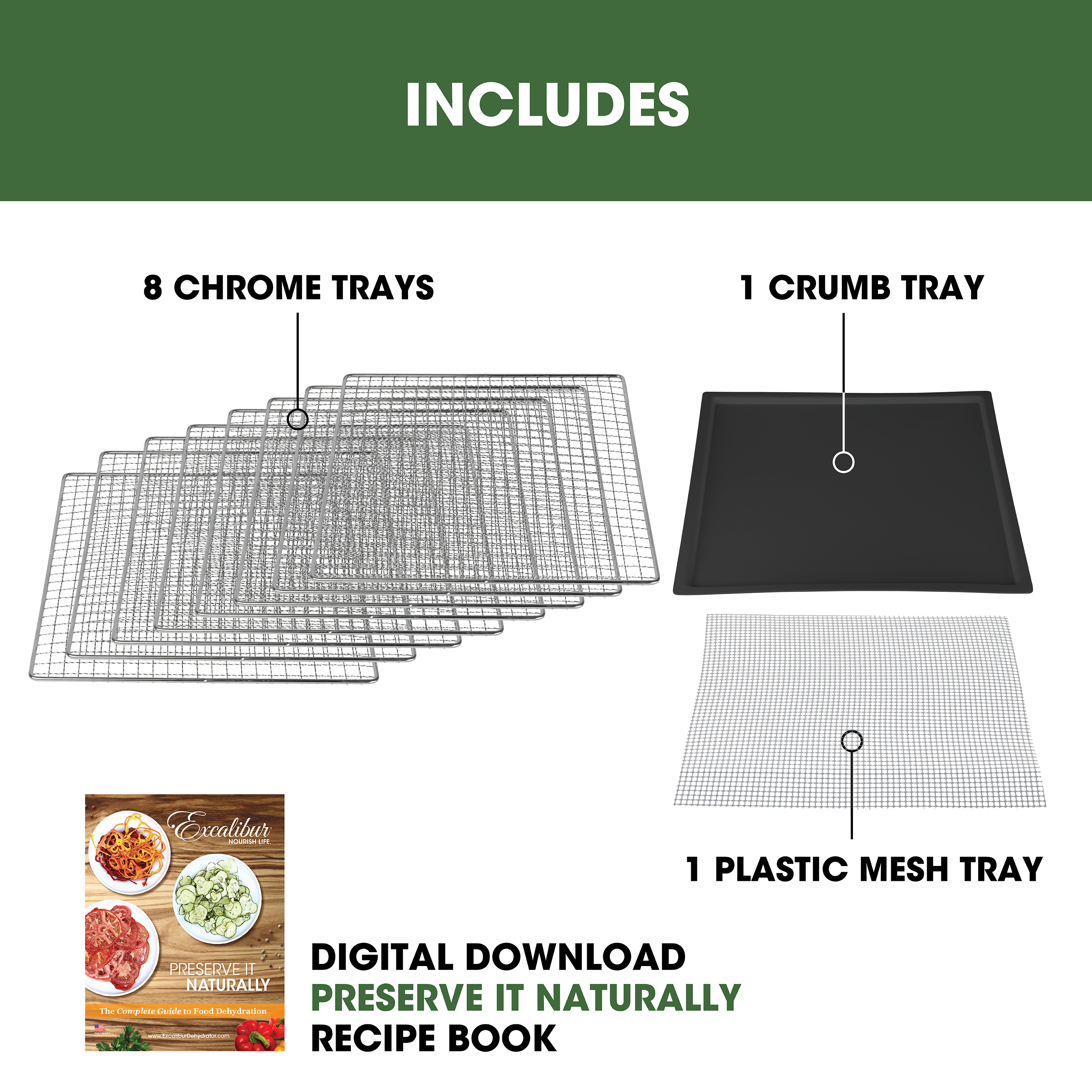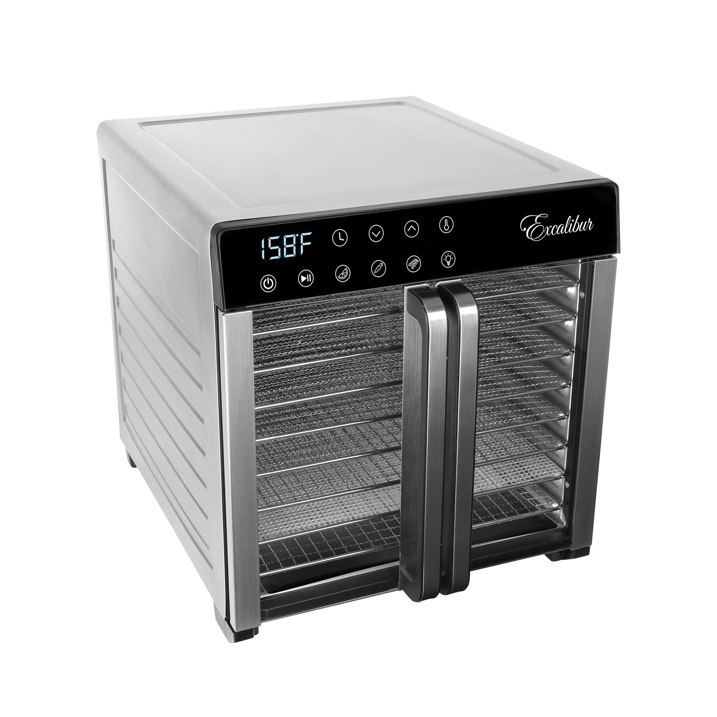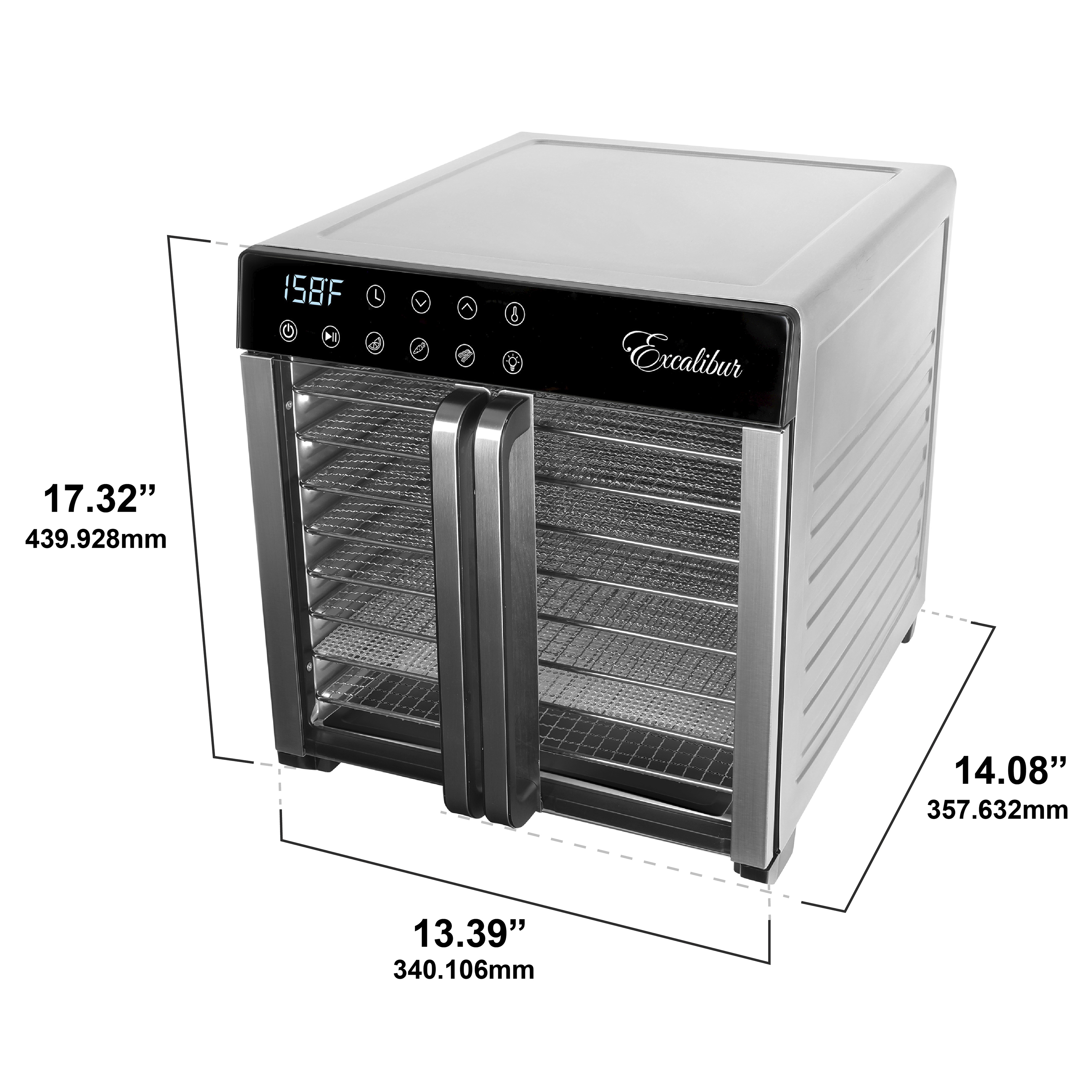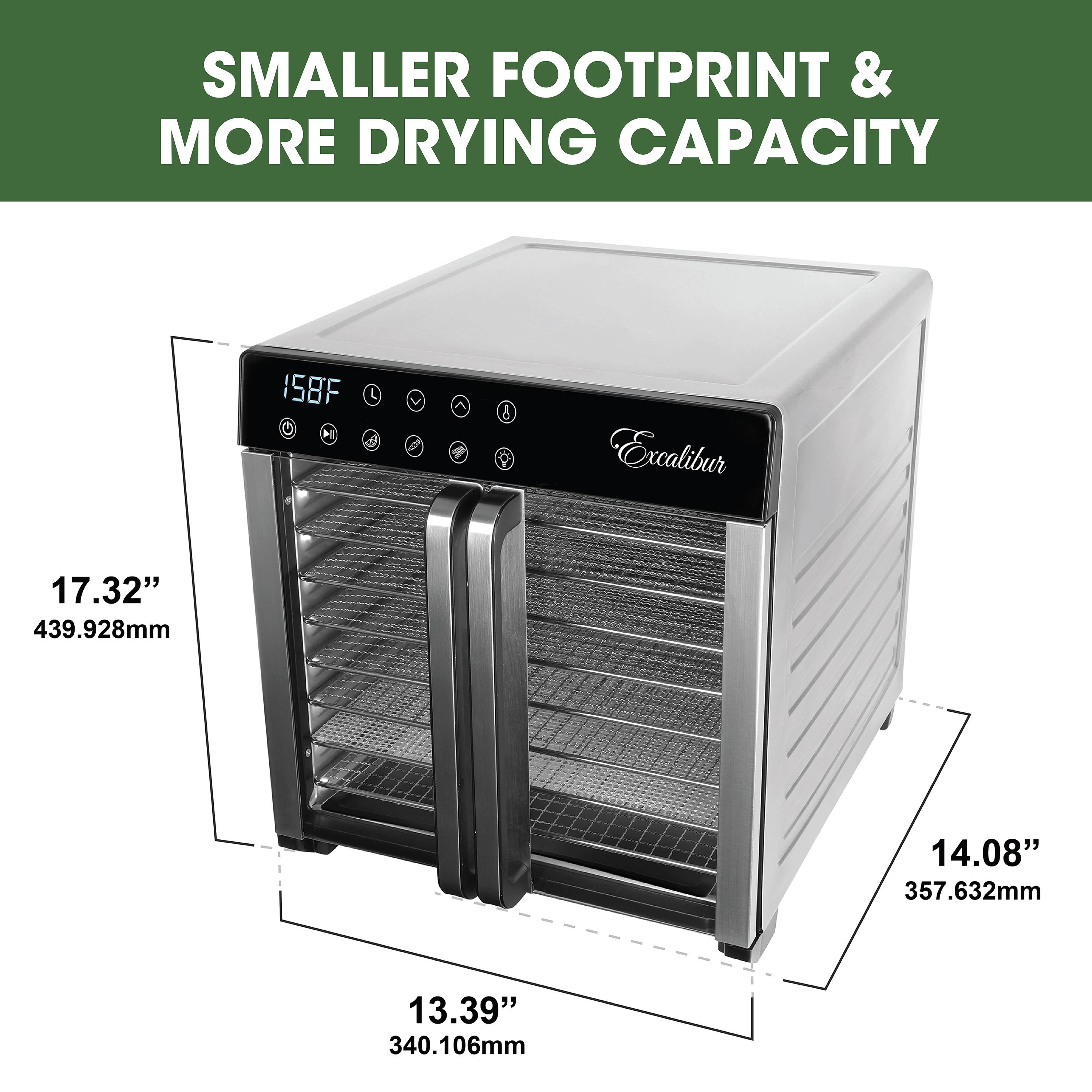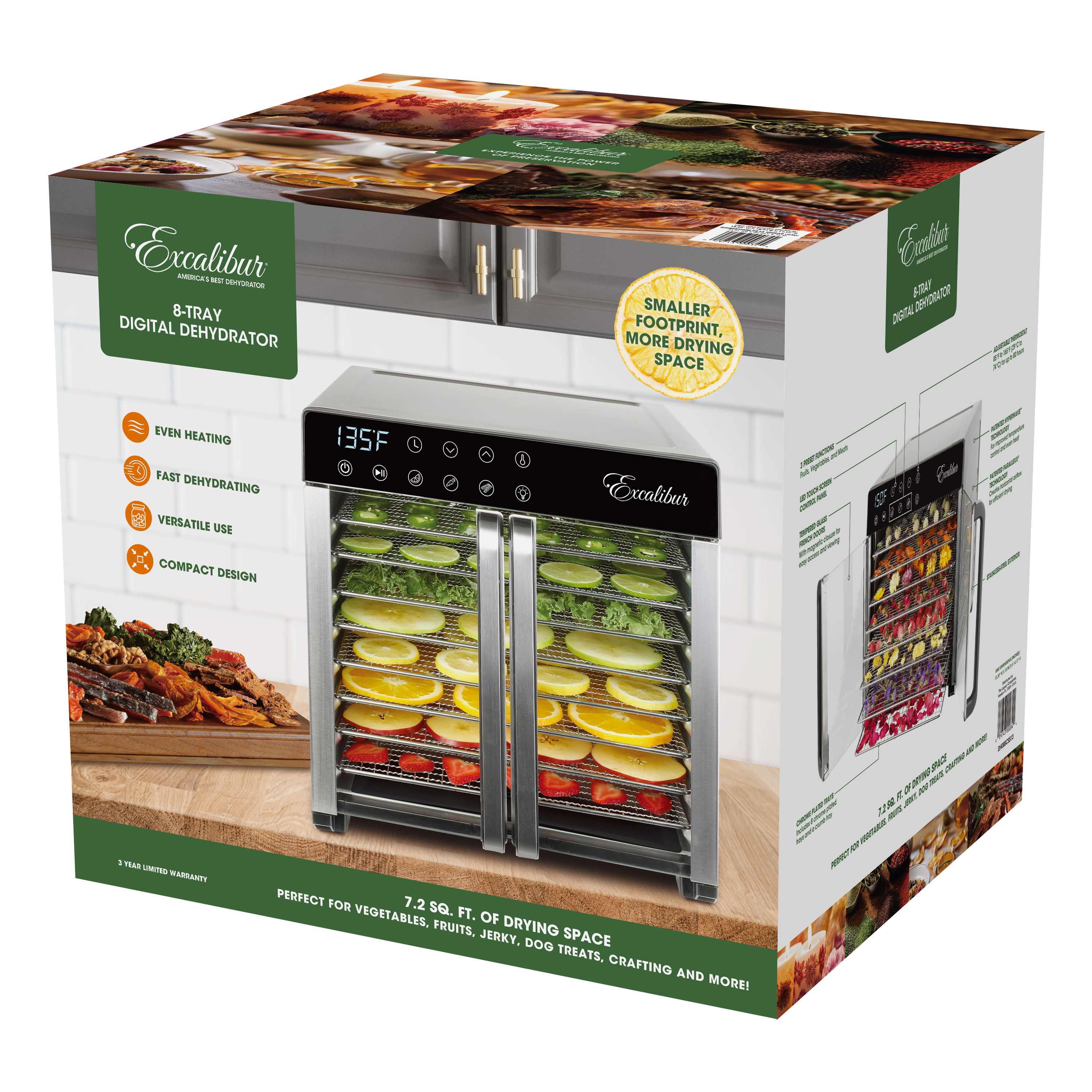 | Long Description | Experience the power of preservation with the Excalibur Compact 8 Tray dehydrator. Designed for both style and efficiency, this expertly crafted stainless-steel dehydrator offers 7.2 square feet of drying space and comes equipped with eight chrome trays, providing plenty of room to meet all your preservation needs. Whether you are preserving your seasonal harvest, your fresh catch or simply geting crafty and experimenting with creative, nutritious snacks, this compact dehydrator delivers great results with ease and precision. Combined, the Hyperwave Technology along with the Horizontal Parallex Air Flow ensure superior performance by delivering faster, more even drying without the need to rotate the trays. Set precise time and temperature with the easy-to-use LED control panel which offer a temperature range from 85°F to 165°F and dehydrating time for up to 80 hours. When in use, the countdown timer is conveniently displayed on the screen and the unit will automatically shut off when drying is complete. Monitor the drying process through the clear easy-view glass French door. Explore the world of preservation with a dehydrator that is deserving of your countertop space. A digital copy of the "Preserve it Naturally"book is included to inspire your dehydrating journey. Discover the world of preservation with your new dehydrator. Covered by the Excalibur Three-Year Limited Warranty. |