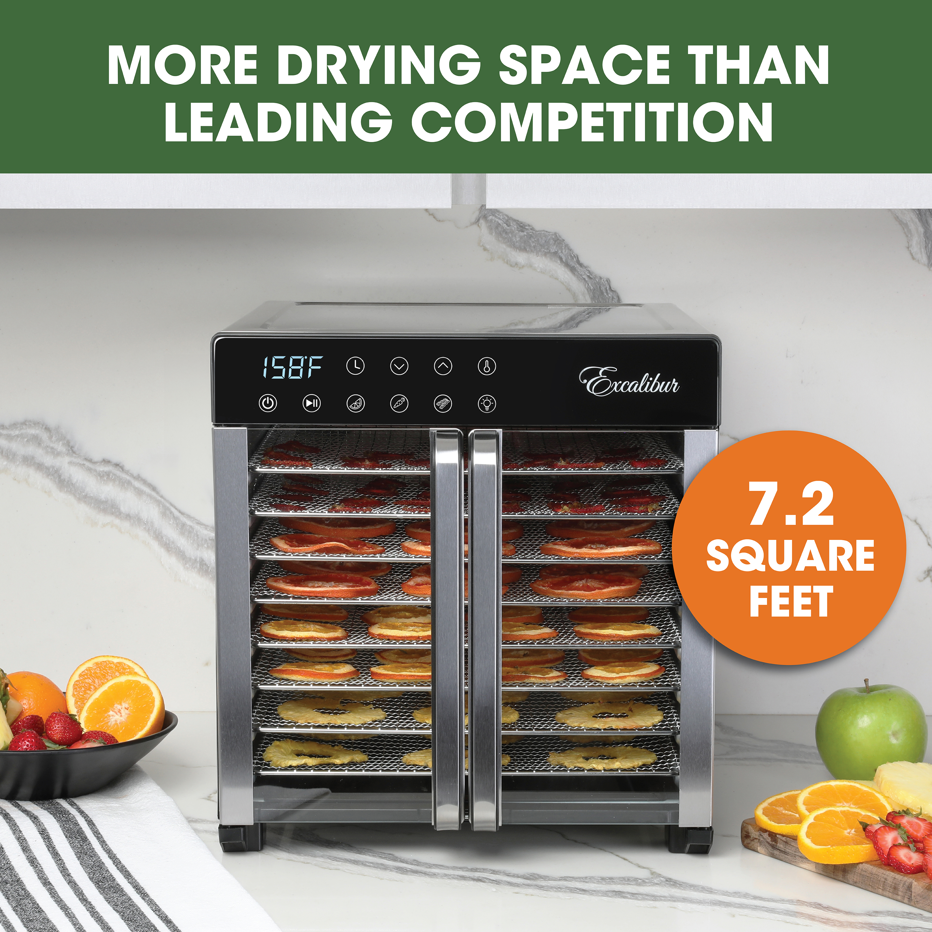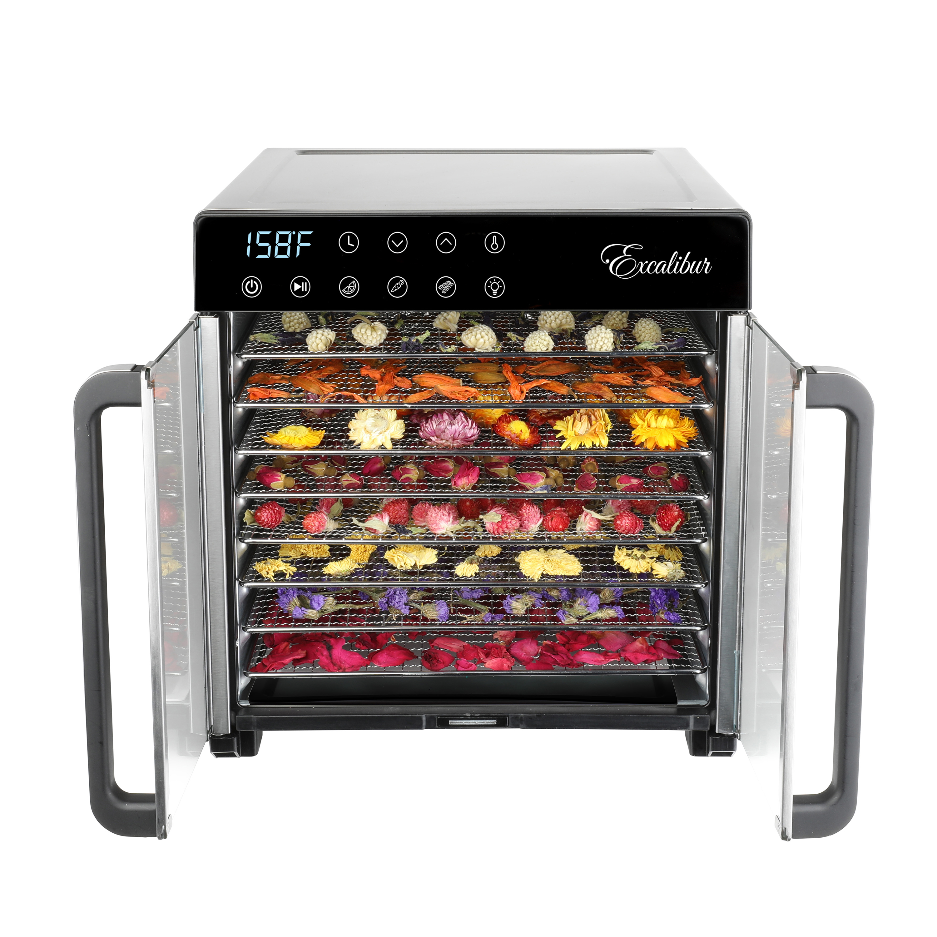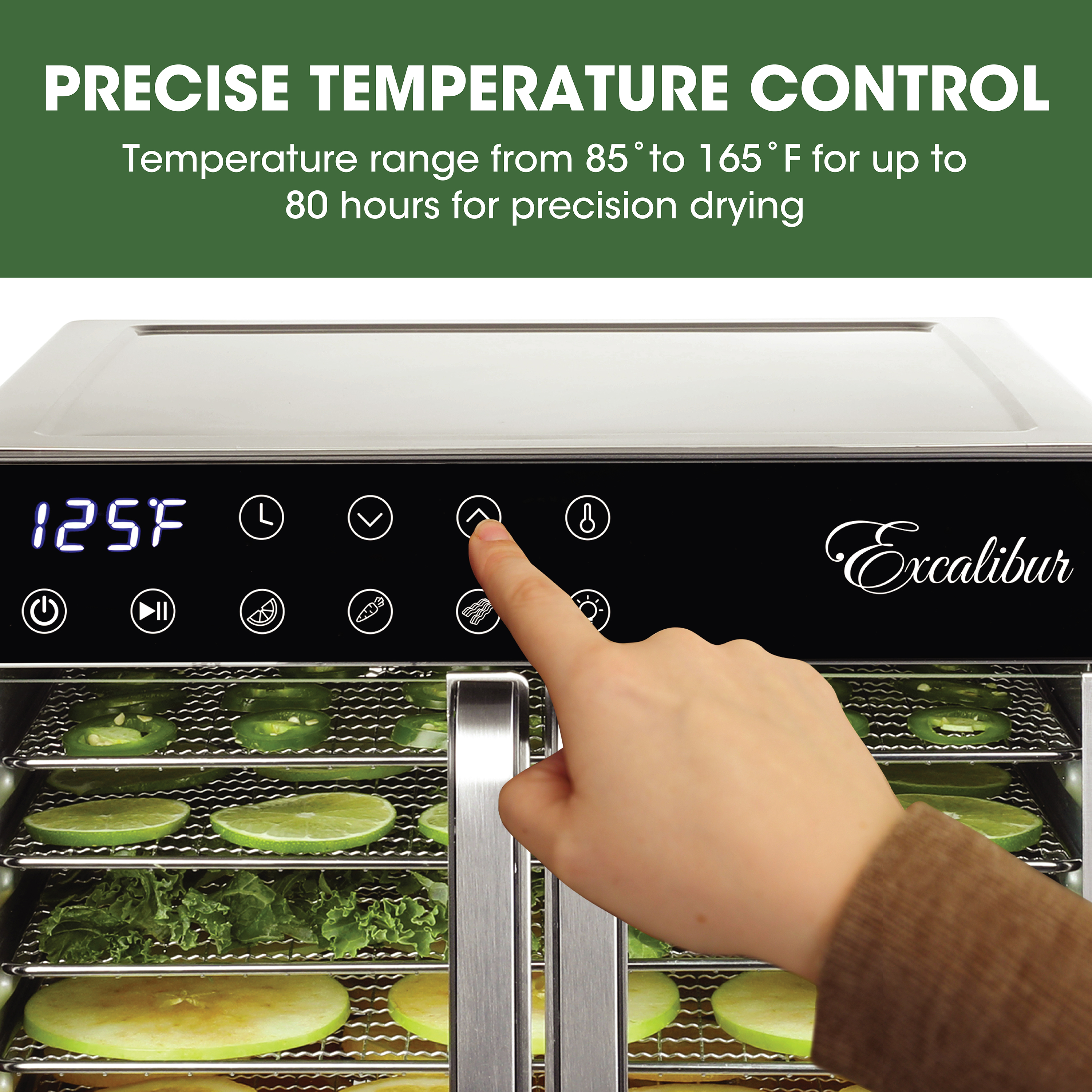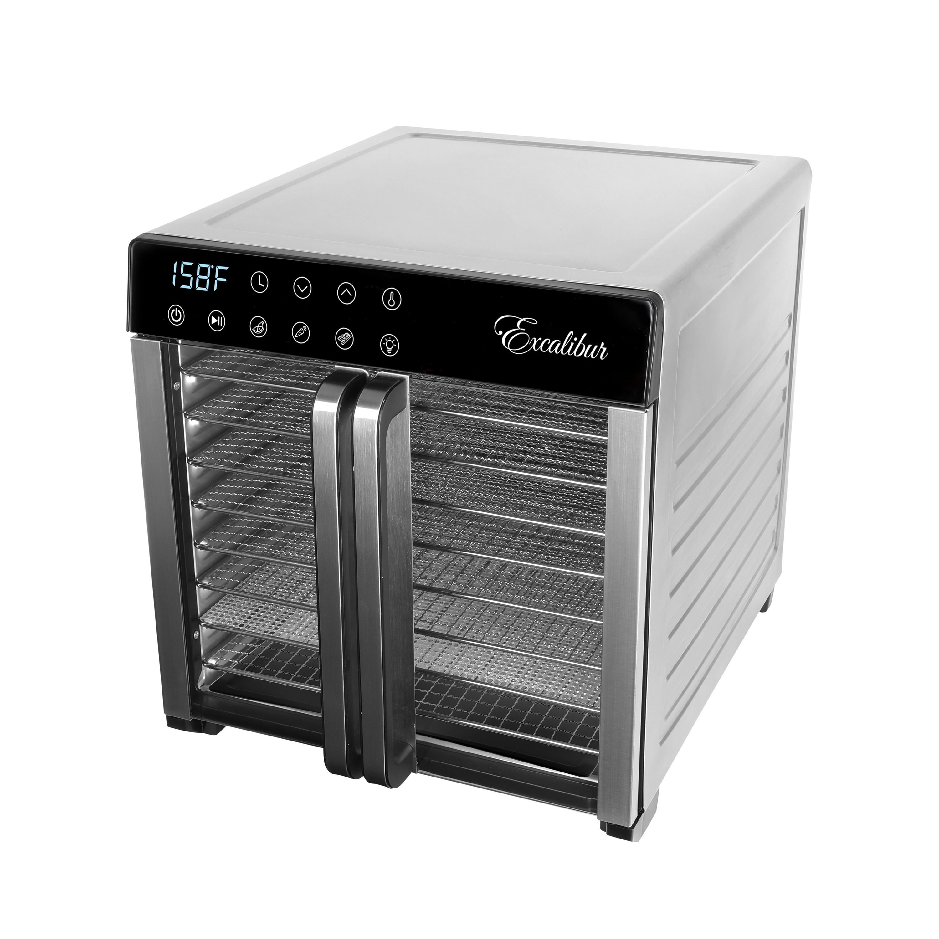 | Long Description | Experience the power of preservation with the Excalibur Compact 8 Tray dehydrator. Designed for both style and efficiency, this expertly crafted stainless-steel dehydrator offers 7.2 square feet of drying space and comes equipped with eight chrome trays, providing plenty of room to meet all your preservation needs. Whether you are preserving your seasonal harvest, your fresh catch or simply geting crafty and experimenting with creative, nutritious snacks, this compact dehydrator delivers great results with ease and precision. Combined, the Hyperwave Technology along with the Horizontal Parallex Air Flow ensure superior performance by delivering faster, more even drying without the need to rotate the trays. Set precise time and temperature with the easy-to-use LED control panel which offer a temperature range from 85°F to 165°F and dehydrating time for up to 80 hours. When in use, the countdown timer is conveniently displayed on the screen and the unit will automatically shut off when drying is complete. Monitor the drying process through the clear easy-view glass French door. Explore the world of preservation with a dehydrator that is deserving of your countertop space. A digital copy of the "Preserve it Naturally"book is included to inspire your dehydrating journey. Discover the world of preservation with your new dehydrator. Covered by the Excalibur Three-Year Limited Warranty. |
