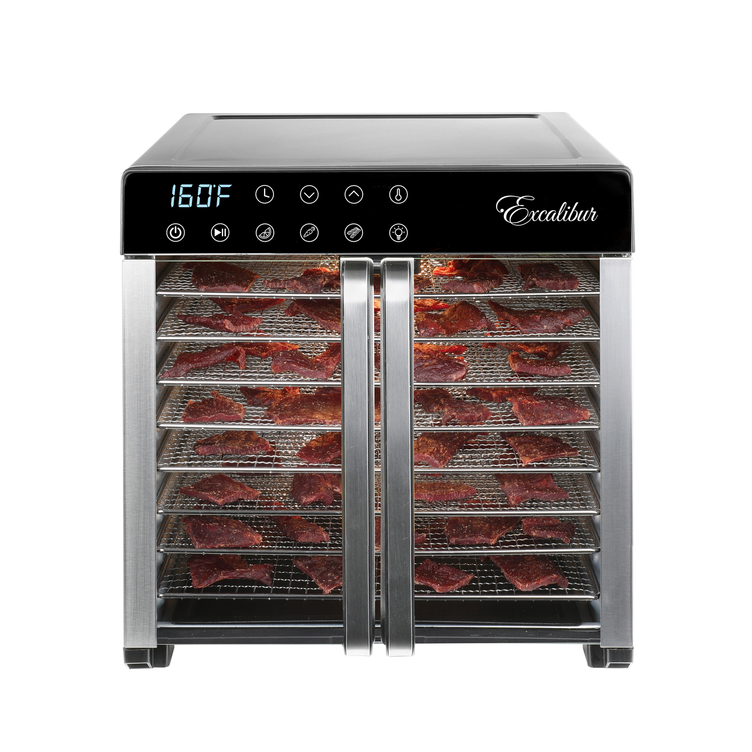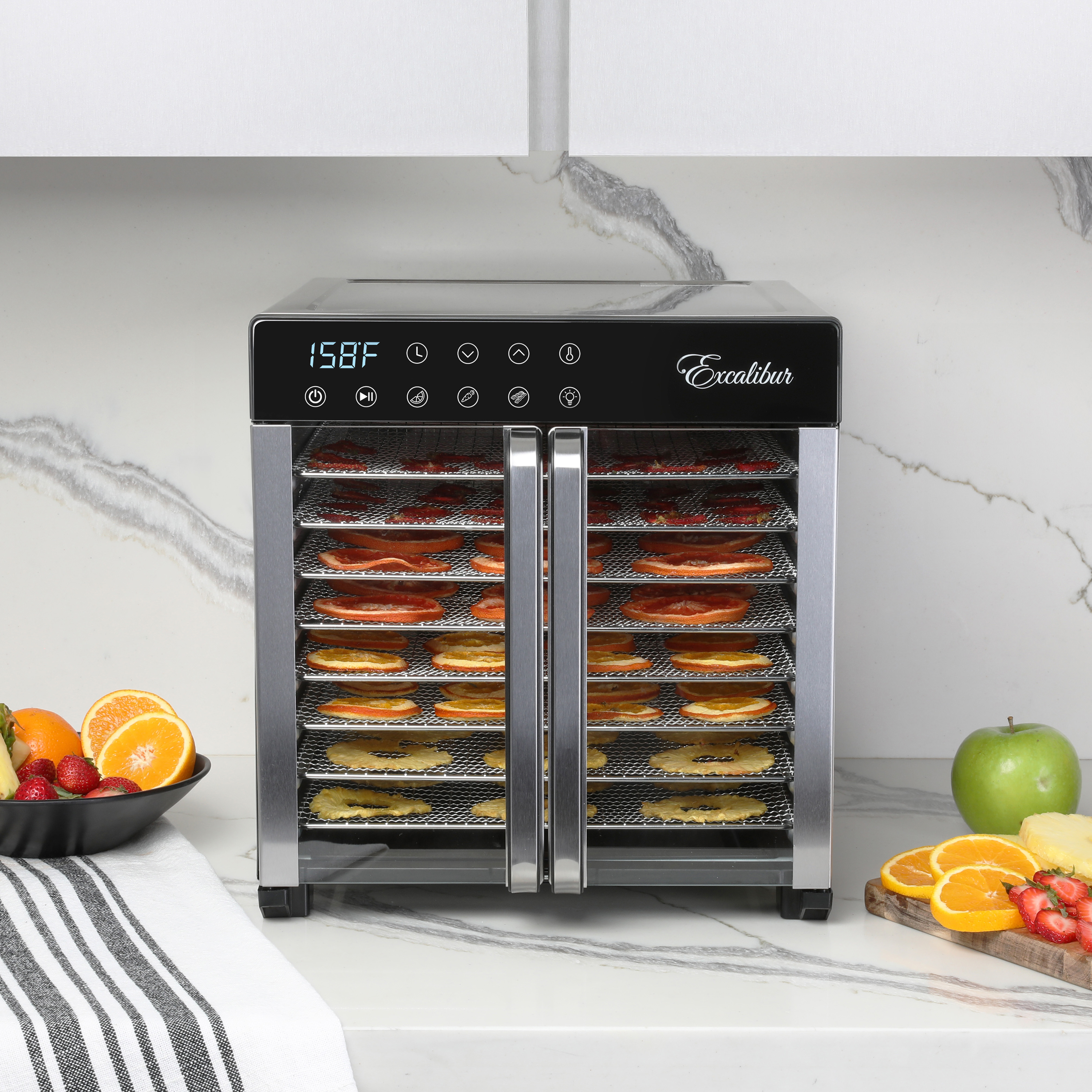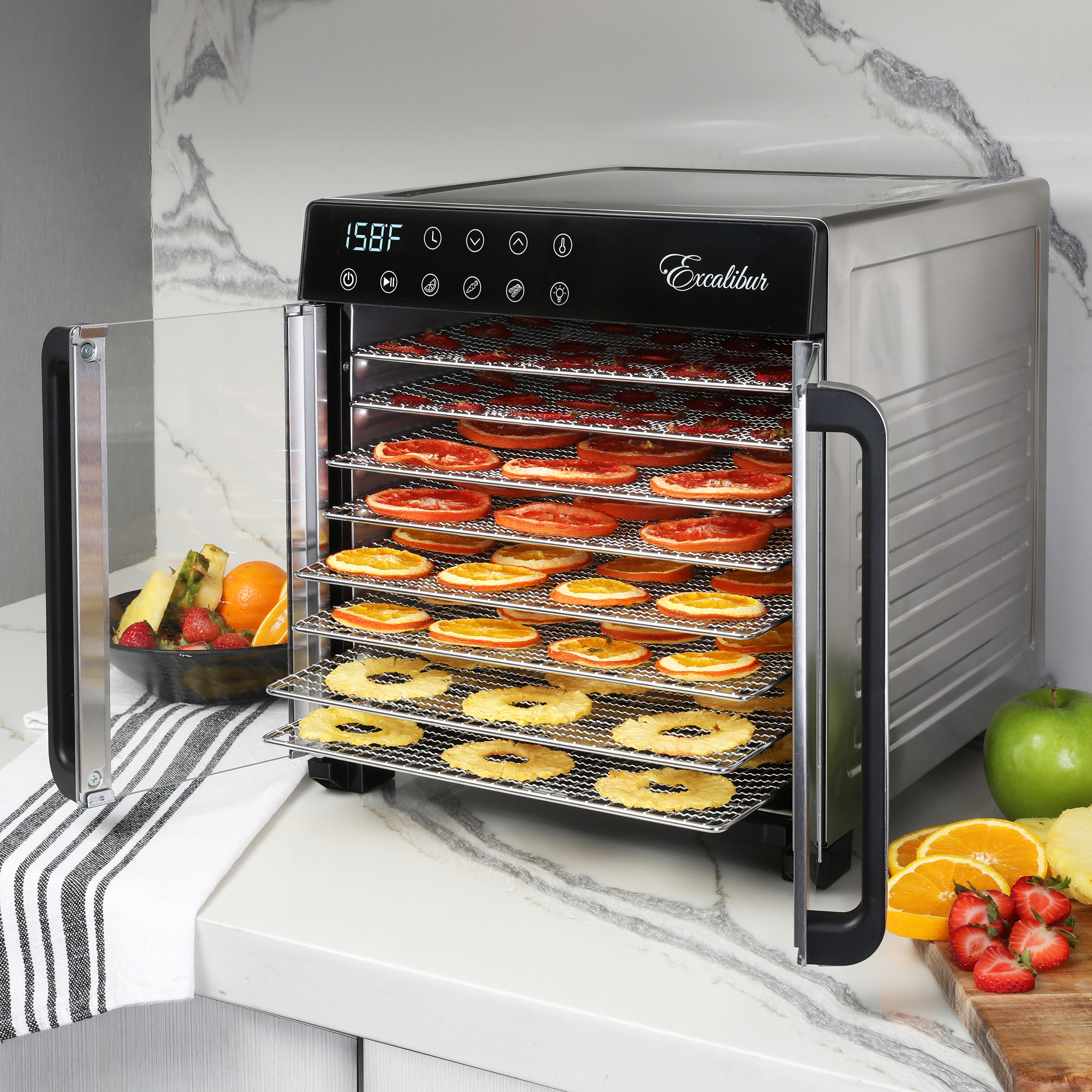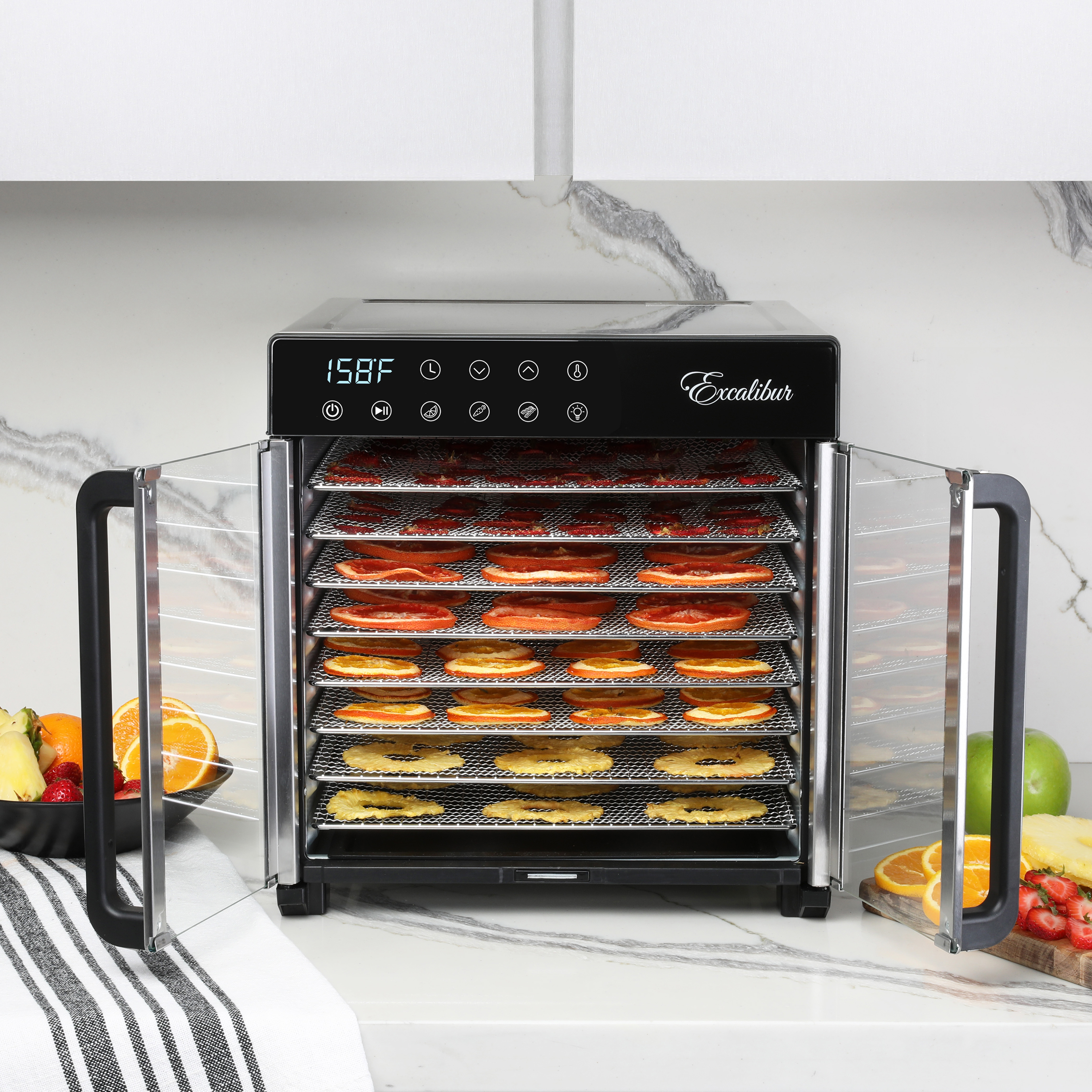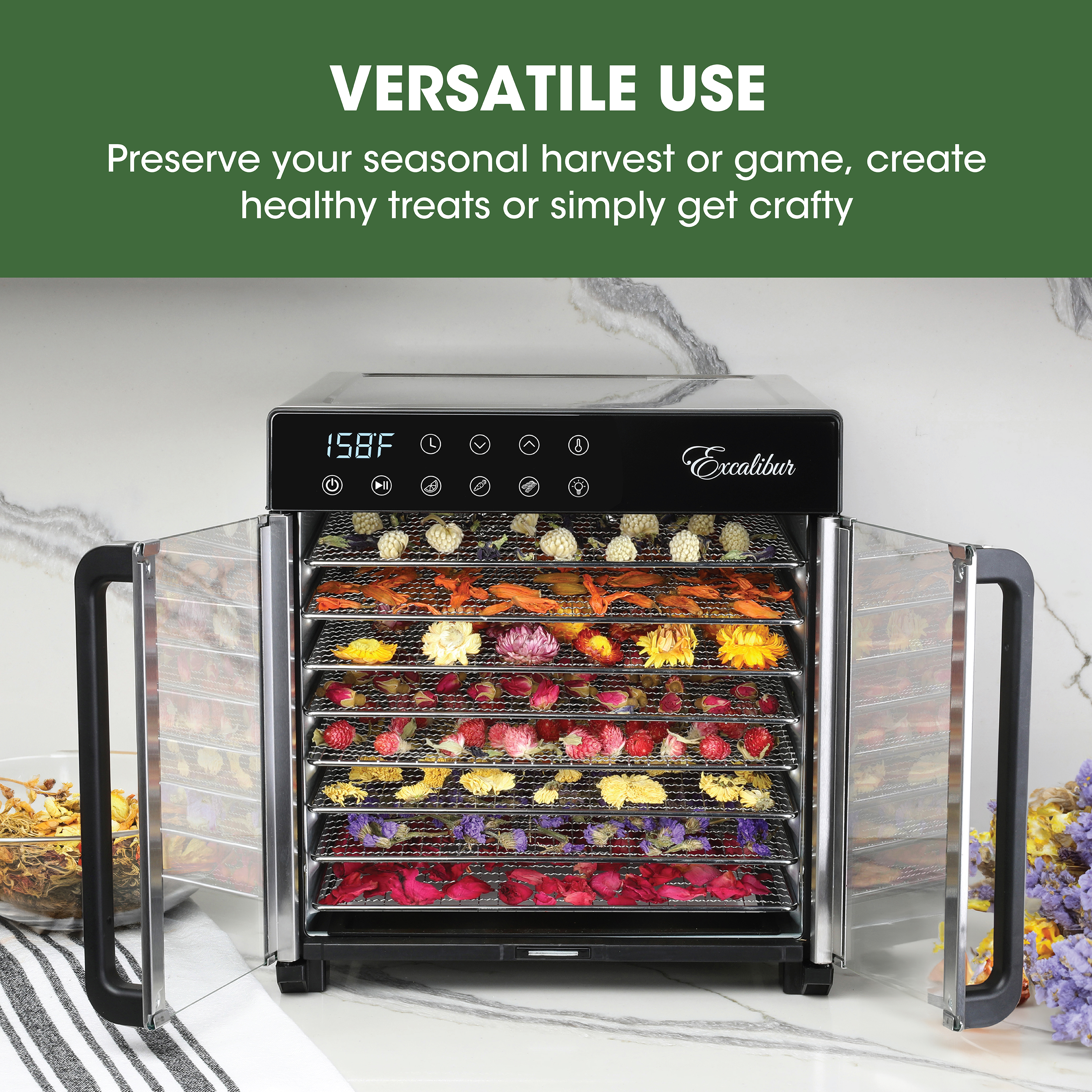 | Long Description | Experience the power of preservation with the Excalibur Compact 8 Tray dehydrator. Designed for both style and efficiency, this expertly crafted stainless-steel dehydrator offers 7.2 square feet of drying space and comes equipped with eight chrome trays, providing plenty of room to meet all your preservation needs. Whether you are preserving your seasonal harvest, your fresh catch or simply geting crafty and experimenting with creative, nutritious snacks, this compact dehydrator delivers great results with ease and precision. Combined, the Hyperwave Technology along with the Horizontal Parallex Air Flow ensure superior performance by delivering faster, more even drying without the need to rotate the trays. Set precise time and temperature with the easy-to-use LED control panel which offer a temperature range from 85°F to 165°F and dehydrating time for up to 80 hours. When in use, the countdown timer is conveniently displayed on the screen and the unit will automatically shut off when drying is complete. Monitor the drying process through the clear easy-view glass French door. Explore the world of preservation with a dehydrator that is deserving of your countertop space. A digital copy of the "Preserve it Naturally"book is included to inspire your dehydrating journey. Discover the world of preservation with your new dehydrator. Covered by the Excalibur Three-Year Limited Warranty. |