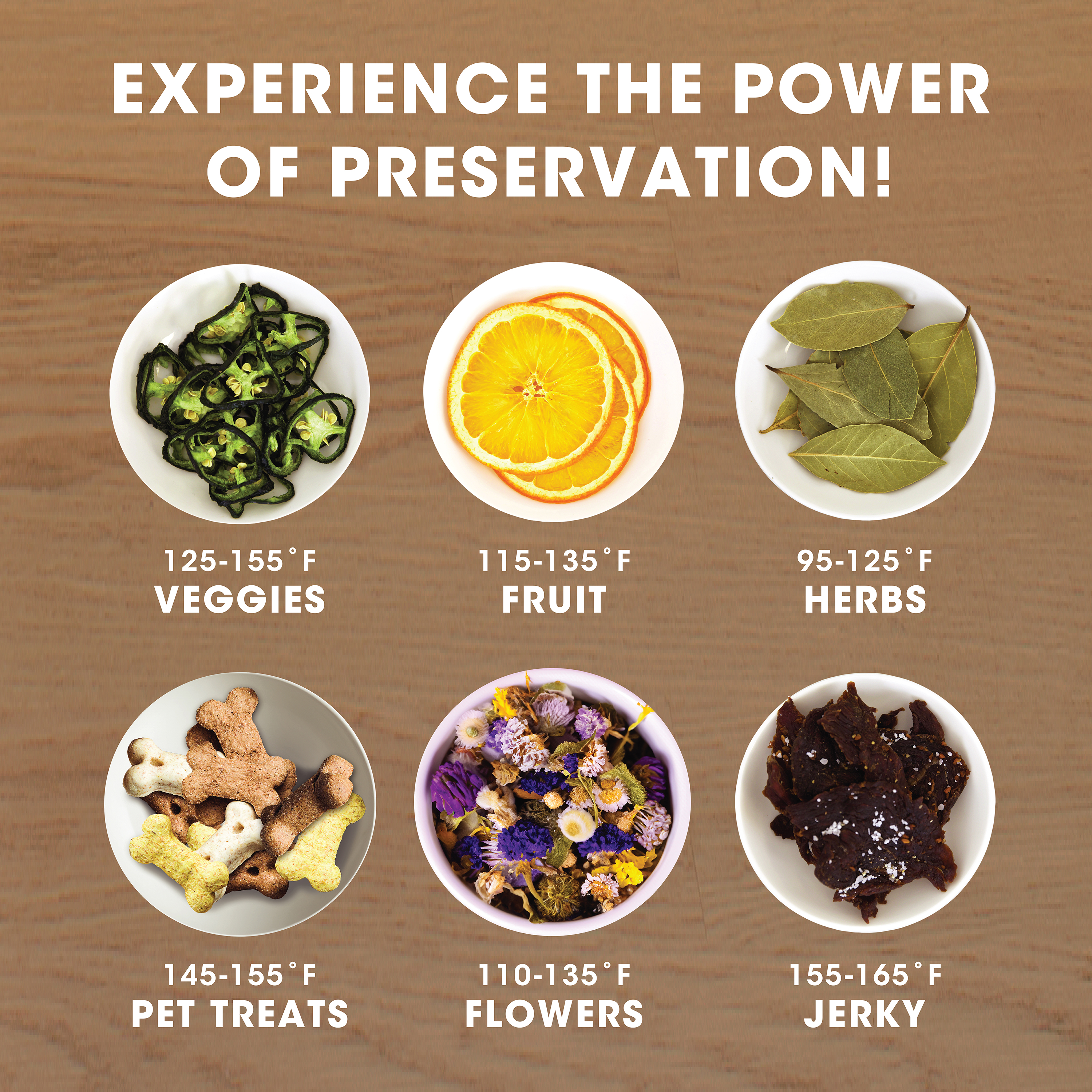 | Bullet 6 | Adjustable thermostat control with temperature range from 85°F to 165°F for up to 80 hours for precision drying |
