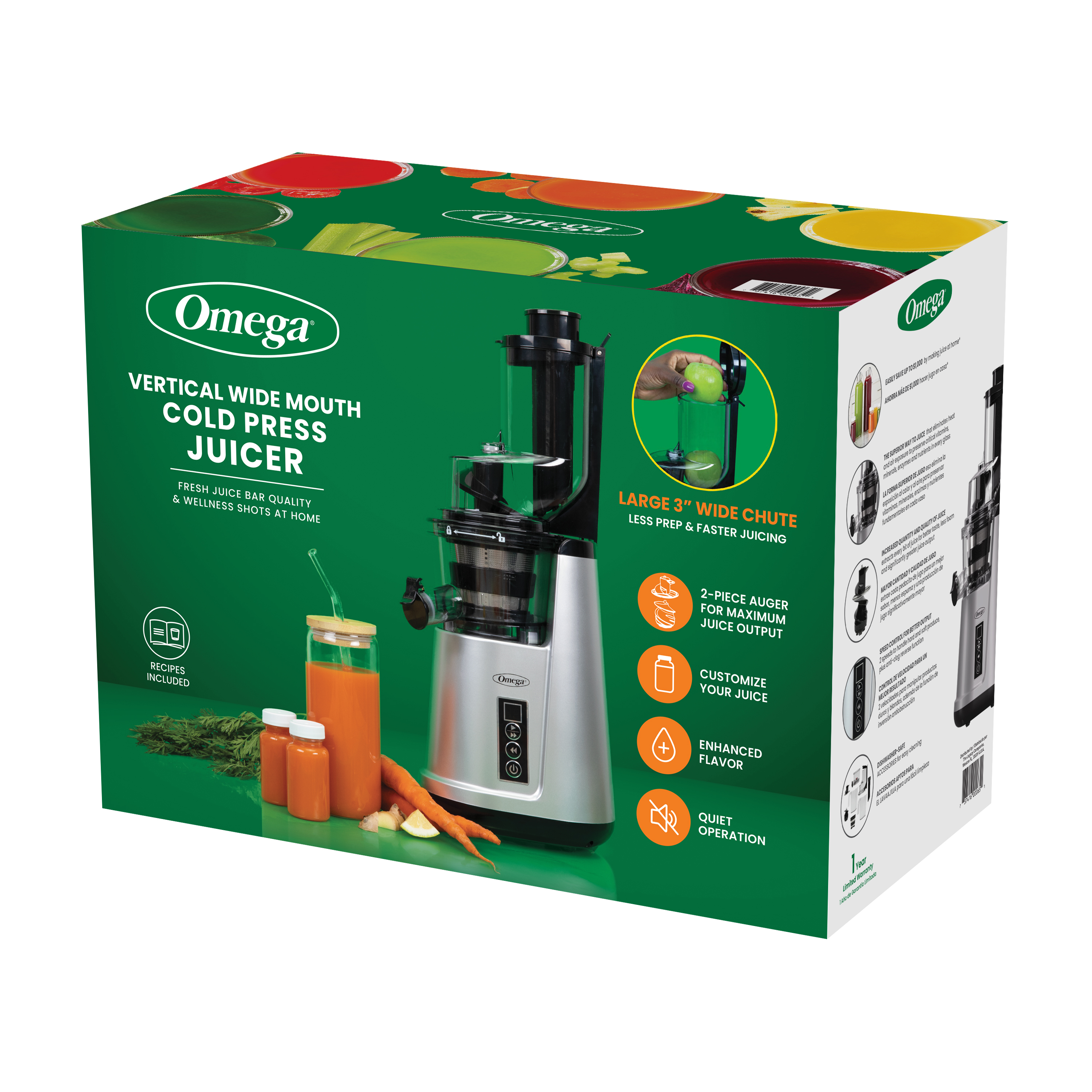| Long Description | Step up your juicing game with the Omega Cold Press Vertical Wide Mouth Juicer, a revolutionary appliance designed to take your juicing experience to the next level. Featuring cutting-edge cold press technology that operates at a low speed of 45-65 RPM, this juicer ensures that the natural enzymes and nutrients in your favorite fruits and vegetables are preserved to perfection. The result? Fresh, flavorful juices that are bursting with goodness and vitality. With its 3-inch-wide mouth, this juicer can accommodate whole fruits and veggies with ease, minimizing the need for tedious prep work and allowing you to enjoy your favorite juices in no time. Equipped with two-speed settings and high torque capabilities, this juicer excels at extracting every last drop of goodness from your ingredients, ensuring that you get the most out of your produce every time. Say goodbye to frustrating clogs with the anti-clog reverse function, which keeps your juicing sessions smooth and hassle-free. The Omega Wide Mouth Vertical Cold Press Juicer is not only functional but also beautifully designed to complement your kitchen decor. Its compact size and space-saving design make it a perfect fit for any countertop, while the dishwasher-safe parts ensure easy cleaning and maintenance. Enjoy peaceful and quiet juicing sessions as you whip up delicious and nutritious concoctions for yourself and your loved ones. The Omega Cold Press Vertical Wide Mouth Juicer comes complete with a juice container, pulp container, pusher, and cleaning brush, giving you everything you need to start juicing right away. Experience superior cold press juice at home without compromising counter space. |