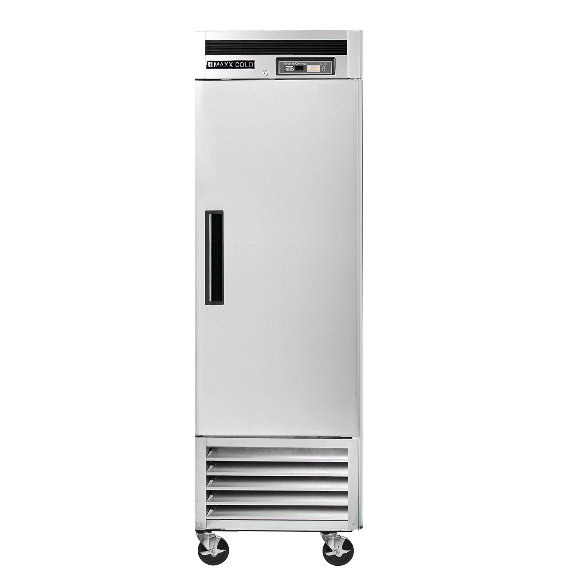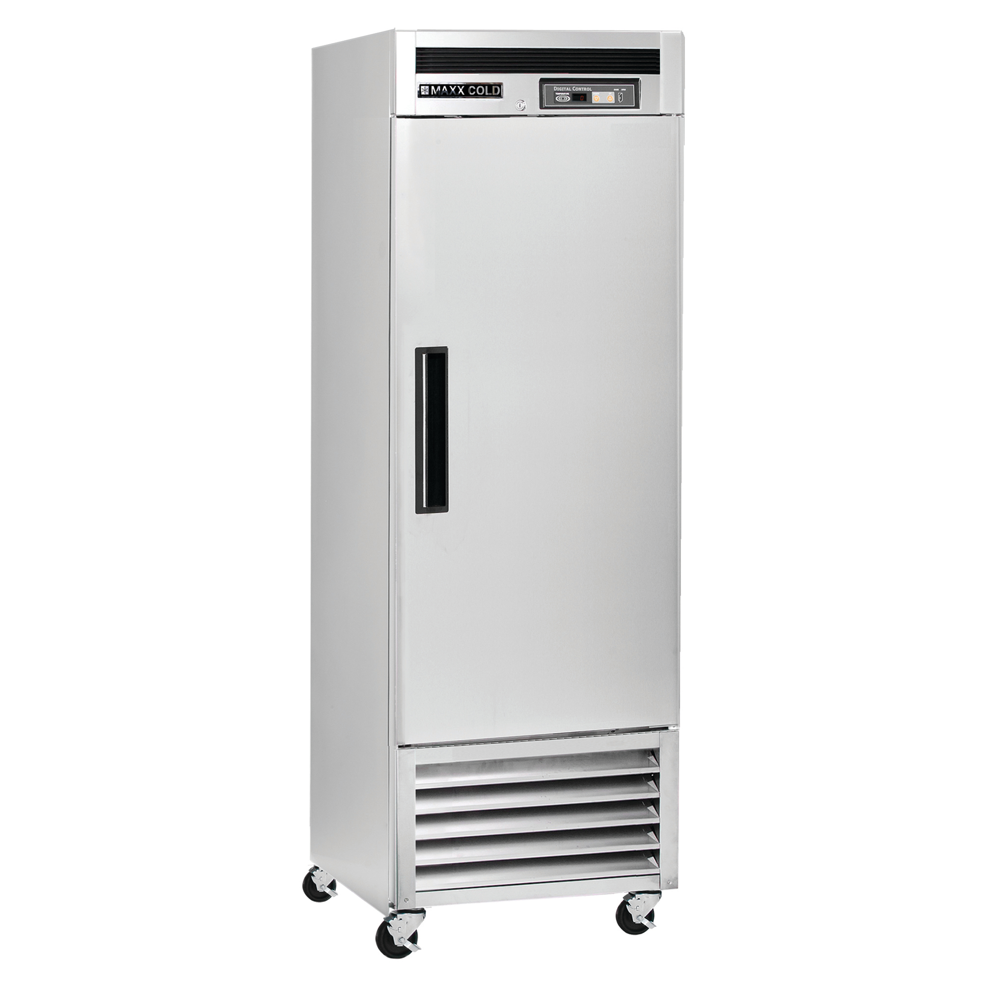 | Long Description | The Maxx Cold Single Door Reach-In Bottom Mount Freezer is designed to assist you in meeting all foodservice industry requirements while making its content easy to access. The unit’s single door is field reversible and can be opened from left or right by the operator. The cabinet is equipped with three heavy-duty fully adjustable and easy-to-clean PE-coated wire shelves which can hold full-size sheet pans. The unit provides up to 23 cubic feet of storage capacity, while its slender and solid configuration makes it a great choice for smaller, compact spaces. In addition, this one-door commercial freezer model is equipped with an open-door alert that beeps if the freezer is left open for five minutes. The reach-in commercial freezer is constructed of a stainless steel exterior and interior, and is mounted on 5-inch diameter swivel caster wheels that can easily be maneuvered. Standard features on this premium indoor freezer include integrated energy saving interior LED lighting, automatic defrost function, lock and key set for security and digital temperature control which maintains optimum temperature. The digital temperature display can be viewed from outside the cabinet, which is designed with an integrated condensate evaporator; meaning no drain line connection is needed. The polyurethane foam insulation on this one-door commercial freezer provides outstanding thermal regulation and is energy efficient. This unit meets Energy Star guidelines. |