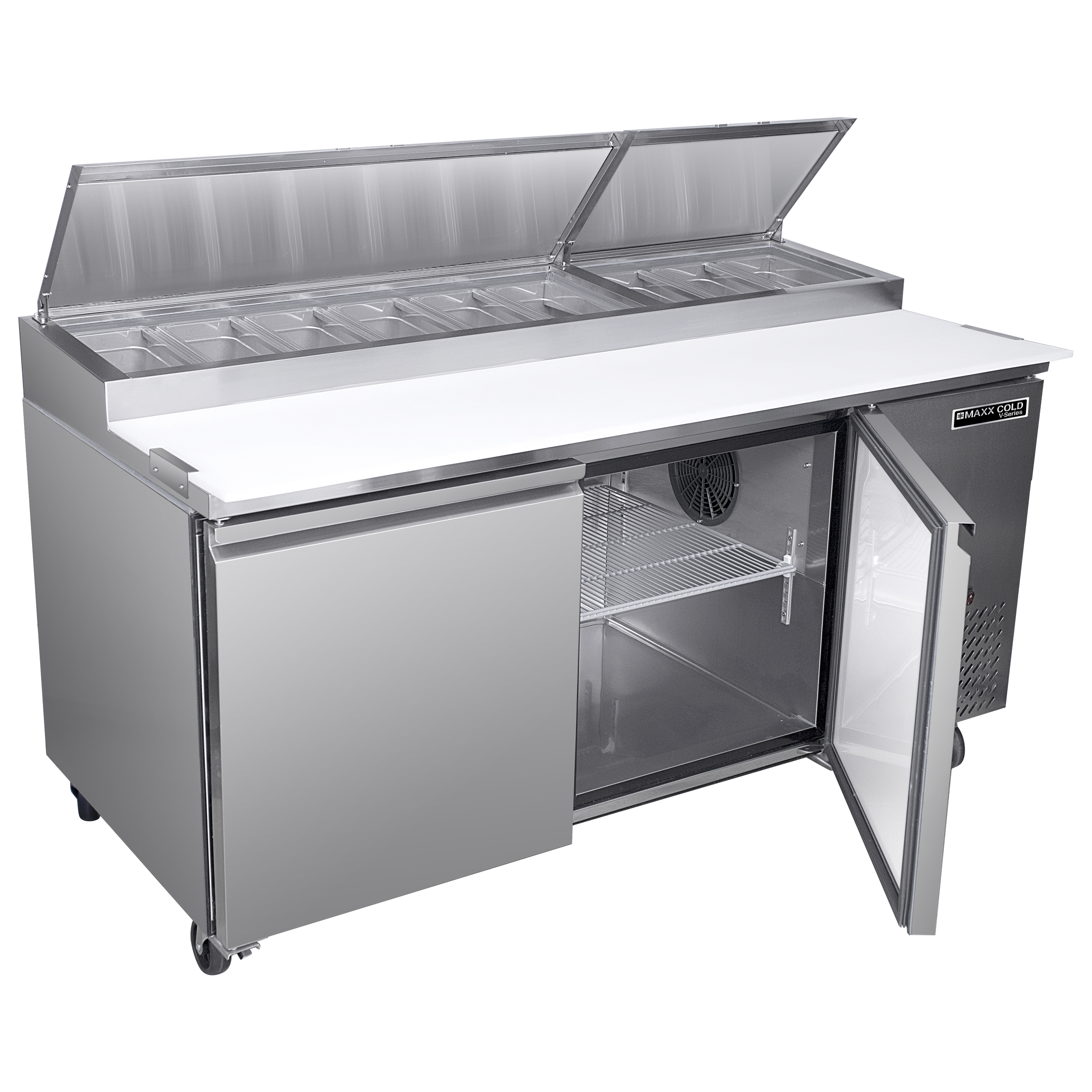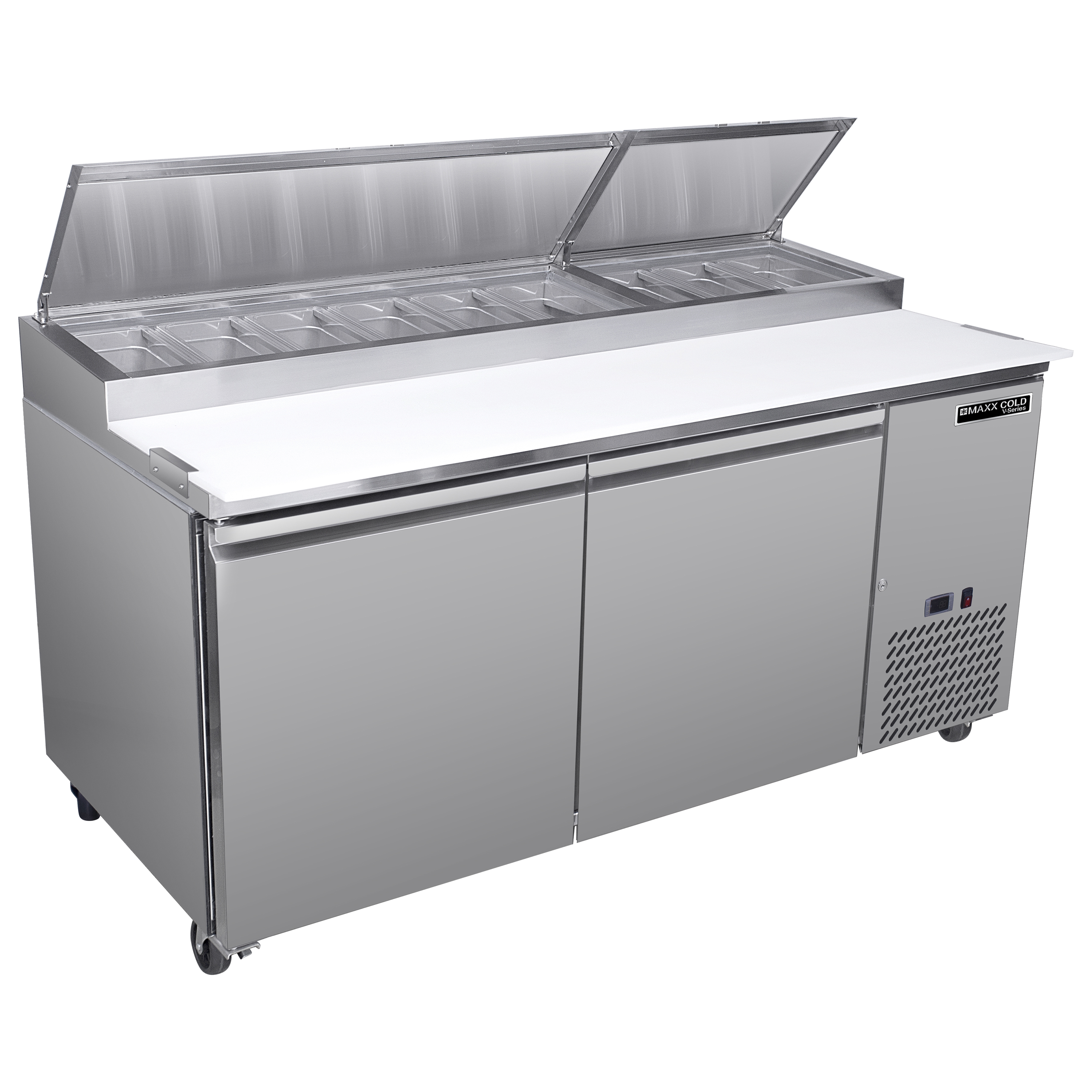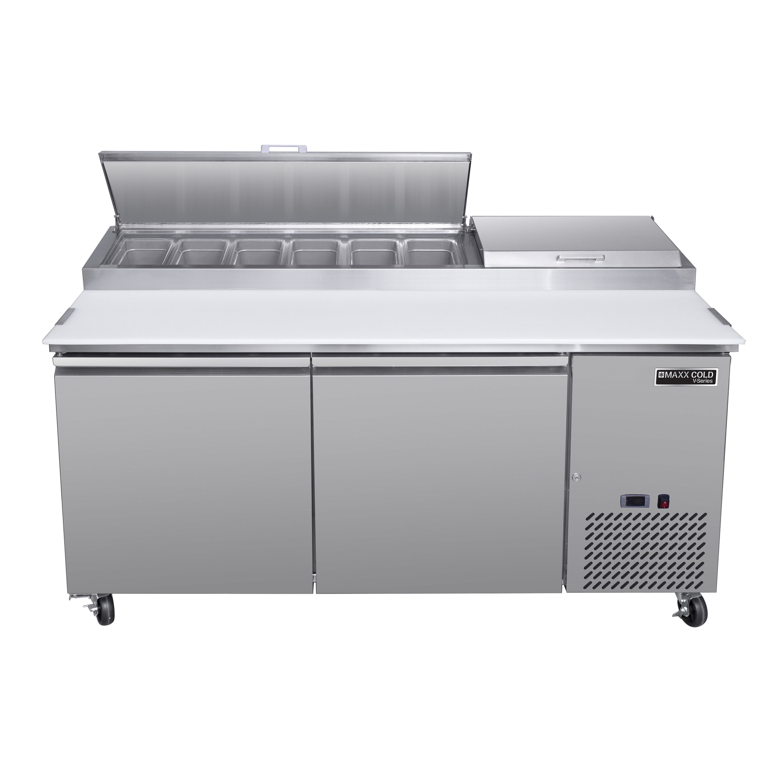 | Long Description | Streamline your pizza preparation process with the Maxx Cold V-Series 2 Door Refrigerated Pizza Prep Table. This compact commercial pizza prep table is constructed with a stainless steel exterior and powder-coated aluminum interior for durability and easy cleaning. It is equipped with a 17.75" deep polyethylene cutting board that provides a convenient work surface for preparing and assembling pizzas. Below the work surface is a refrigerated storage space with two adjustable heavy-duty wire shelves for storing and organizing ingredients, dough and other supplies. This two-door pizza prep station measures 70 inches wide, has 20.3 cubic feet of storage and accommodates nine pans. The unit includes four 3-inch swivel casters (two with brakes) for easy mobility in your commercial kitchen. This pizza prep fridge has a solid state digital control system, LED temperature display and urethane foam insulated walls and doors. It maintains a temperature of 33°F to 40°F (1°C to 4°C) to keep your ingredients at safe and optimal temperatures. The condensate evaporator is integrated to the unit, meaning no drain line connection is needed. Ideal for pizzerias, restaurants and other foodservice establishments, the Maxx Cold V-Series 2 Door Refrigerated Pizza Prep Table lets you keep a wide variety of pizza toppings organized and within easy reach for quick and efficient pizza assembly. Covered by the Maxx Cold Six-Month Limited Warranty. |