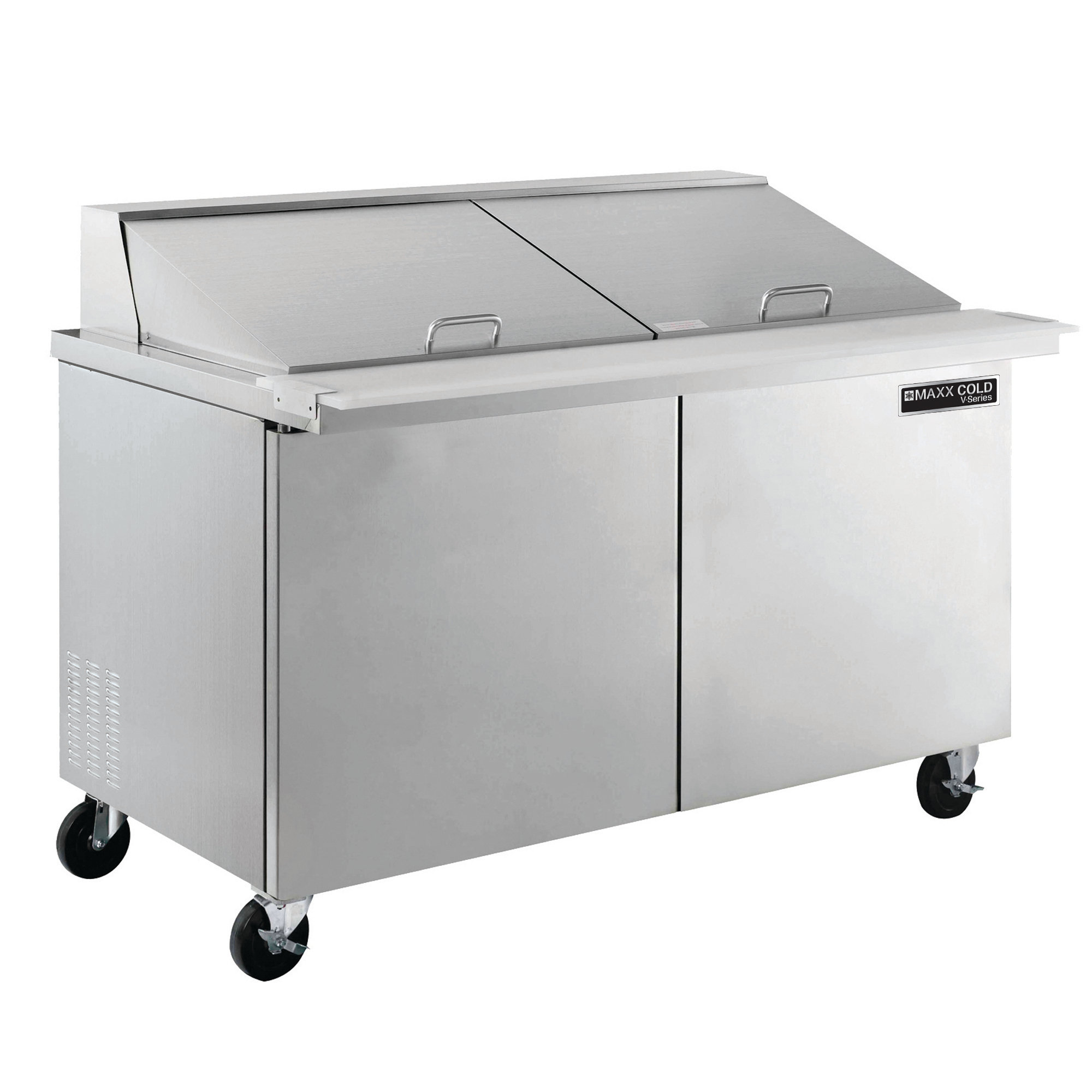 | Long Description | Enhance the preparation of sandwiches and salads with the Maxx Cold V-Series 2 Door Refrigerated Mega Top Prep Table. Combining refrigerated storage with a convenient workspace, it offers more storage and preparation space than a standard salad and sandwich prep table. Ideal for any deli, sandwich shop, restaurant or cafe, this prep table will help optimize your foodservice operations in the front or back of house. The durable stainless-steel two-door cold prep station can accommodate full-size sheet pans. This commercial sandwich and salad prep station is designed with easy-to-grip recessed door handles and two adjustable heavy-duty wire shelves (1 per section/door) to store ingredients and backup supplies. It is equipped with a full set of clip-on divider bars and 4" deep plastic prep pans to hold various ingredients for easy access during sandwich and salad assembly. This two-door salad and sandwich prep station offers up to 16.7 cubic feet (473 L) of refrigerated storage that can hold 24 pans. The stainless steel prep station is equipped with a 9" deep polyethylene cutting board that provides a convenient surface for slicing and preparing ingredients. The unit is mounted on four 3" diameter swivel casters (two with brakes) for easy mobility in your busy commercial kitchen. This deli prep station features a solid state digital control system, LED temperature display and urethane foam insulated walls and doors. The condensate evaporator is integrated to the unit, meaning no drain line connection is needed. The eco-friendly refrigeration system utilizes R290A hydrocarbon refrigerant to maintain optimum temperatures from 33°F to 40°F (1°C to 4°C). Increase kitchen efficiency with extra space with the Maxx Cold V-Series 2 Door Refrigerated Mega Top Prep Table. Covered by the Maxx Cold Six-Month Limited Warranty. |