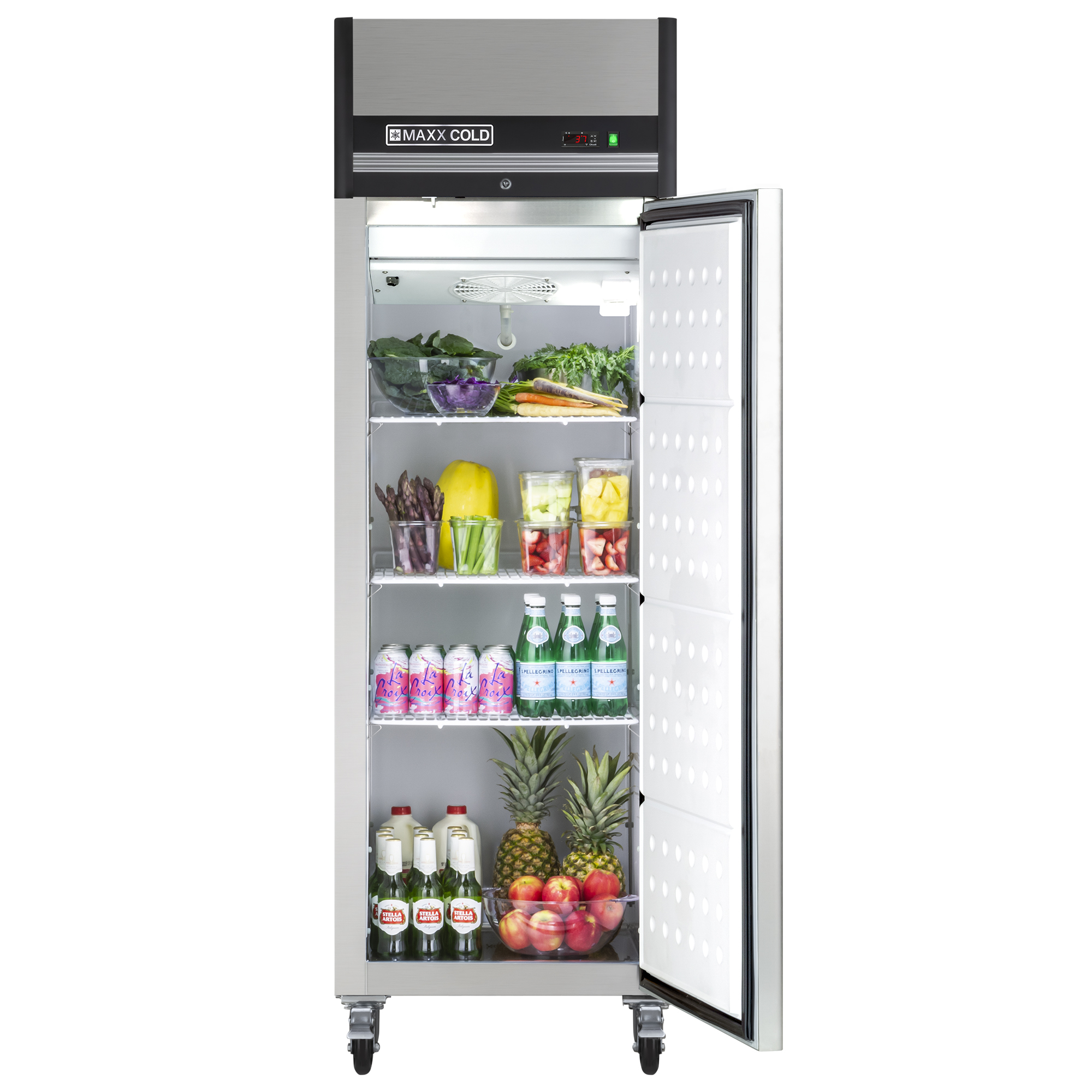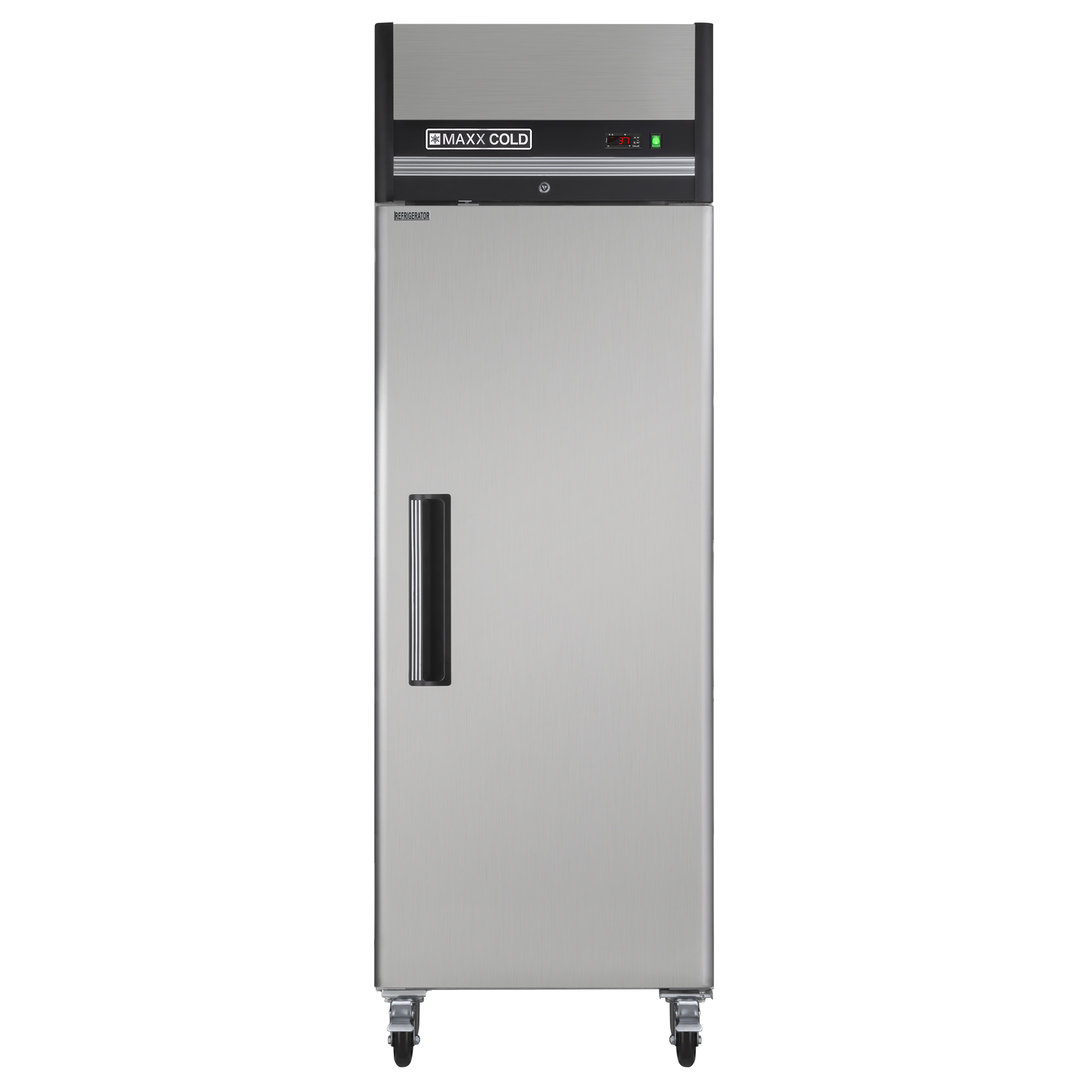 | Long Description | Maxx Cold 26.8 inch wide single door, top mount reach-in refrigerator is designed to assist you in meeting all food service industry requirements while making its content easy to access. The cabinet is equipped with 3 heavy-duty fully adjustable and easy to clean PE coated wire shelves which can hold full size sheet pans and provides up to 23 cubic ft. (651 L) of storage capacity, while it’s slender and solid build makes it a great choice for smaller or limited spaces. In addition, the single door commercial refrigerator model is engineered with an open-door alert that beeps if the refrigerator is left open for three minutes and the single door model is field reversible. This environment friendly reach-in commercial grade refrigerator is constructed of durable stainless steel (exterior) and sanitary white painted aluminum (interior). The unit is mounted on 4” diameter swivel caster wheels for mobility. Standard features on this premium indoor refrigerator include integrated energy saving interior LED lighting, automatic defrost function, lock and key set for security and digital temperature control which maintains optimum temperature. Digital temperature display can be viewed from outside the cabinet, which is engineered with an integrated condensate evaporator; meaning no drain line connection is needed. The environment friendly urethane foam insulation on this one-door commercial refrigerator provides outstanding thermal regulation and is energy efficient.