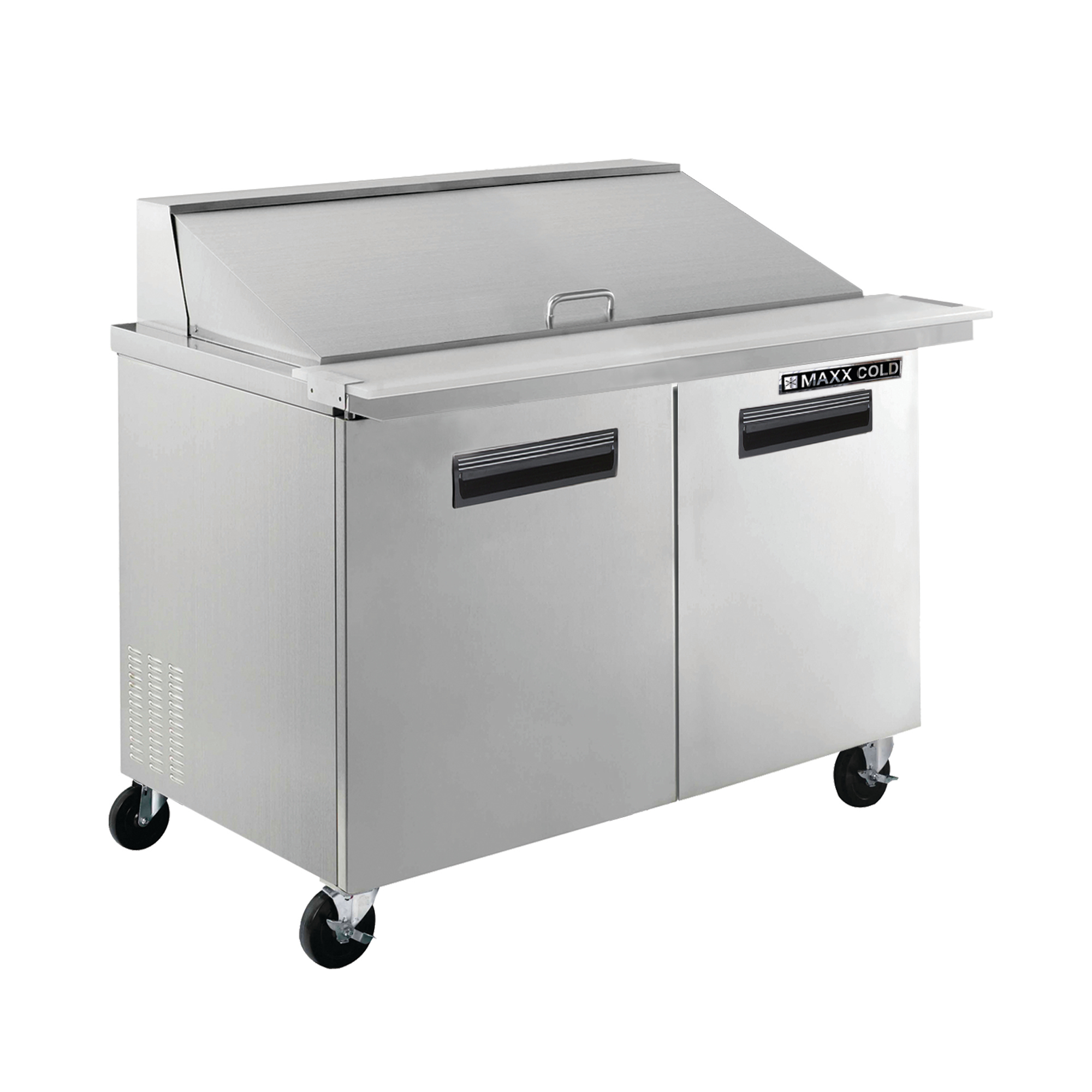 | Long Description | Streamline your food prep with the Maxx Cold X-Series Two-Door Refrigerated Mega Top Prep Table. This commercial prep table offers additional pan space compared to standard sandwich/salad stations. This refrigerated prep table provides up to 12 cubic feet (340 L) of storage that accommodates 16 pans and can hold full-size sheet pans. Constructed of durable stainless steel, the mega top prep table has two doors with easy-grip recessed handles. It is equipped with a full set of clip-on divider bars and 16 4-inch deep plastic pans. It has a sanitary food-grade quality 9-inch deep polyethylene cutting board, offering plenty of space to assemble orders. Beneath the worktop surface is a refrigerated compartment with adjustable heavy-duty wire shelves (1 per section/door) for storing ingredients. This energy-efficient unit is engineered with urethane foam insulated walls and doors. Additionally, it features a solid-state digital control system, LED temperature display and an integrated condensate evaporator which means that no drain line connection is needed. This two-door commercial kitchen prep table is equipped with four 3-inch swivel casters (two with brakes) for easy maneuvering when needed. Provide a convenient and efficient workspace for food preparation while keeping ingredients fresh and organized with the Maxx Cold X-Series Two-Door Refrigerated Mega Top Prep Table. Covered by the Maxx Cold One-Year Parts & Labor + Five-Year Compressor (Part Only) Warranty. |