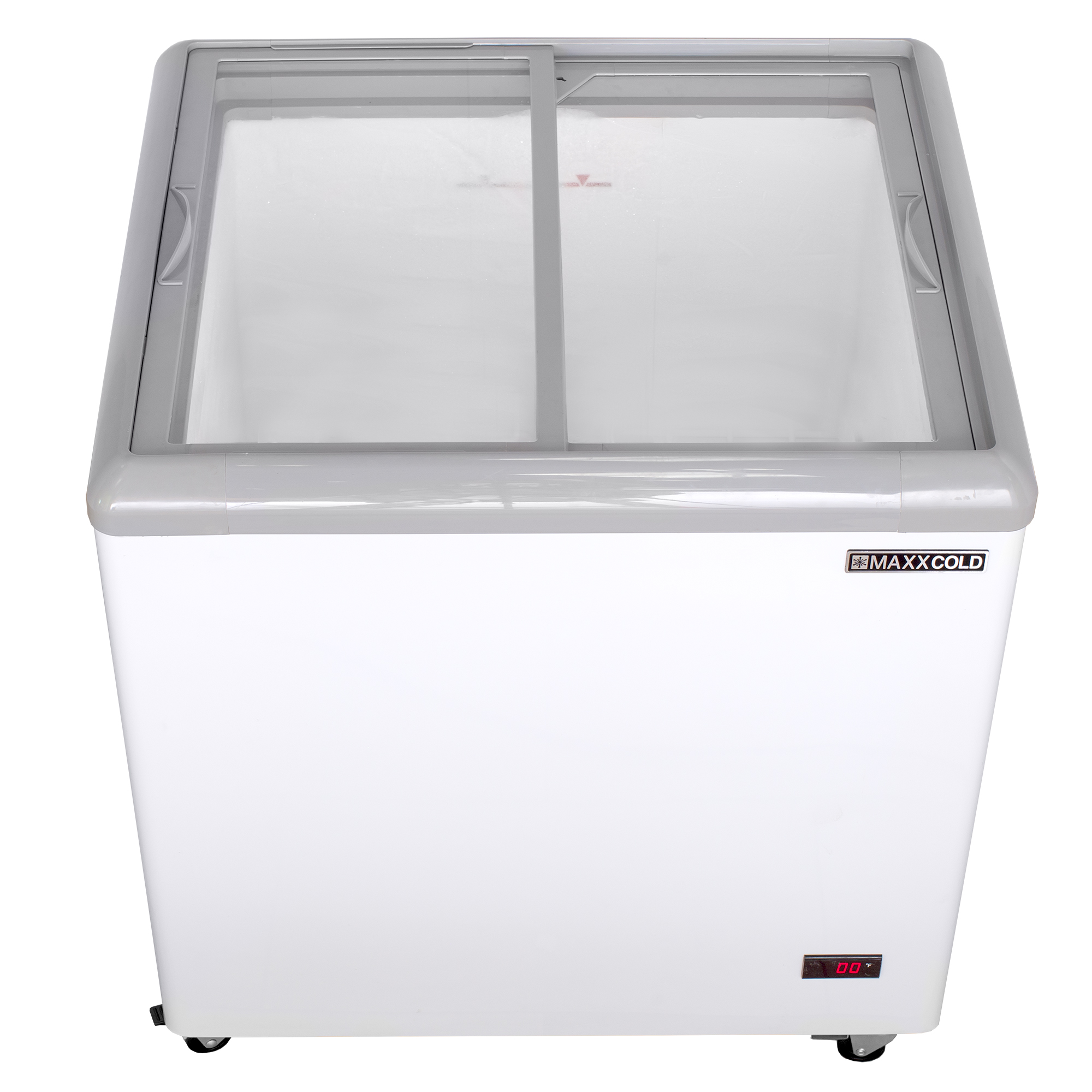 | Long Description | Designed for storing and serving ice cream, the Maxx Cold X-Series Sliding Glass Top Mobile Ice Cream Display Freezer is ideal for convenience stores, ice cream parlors, restaurants, sorbet and gelato shops, cafes, concession stands and more. The exterior is constructed of durable, white powder-coated steel, and the interior is constructed of painted white powder-coated steel. The glass top allows customers to view and choose products, and the sliding lid can be easily opened for quick and convenient access. The adjustable temperature range from -18°F to +10°F (-28°C to -12°C) allows for storing products at the optimal serving temperature. The temperature is clearly visible and easy to read on the external digital display. Interior LED lights make it easier to view or display products in dim lighting environments, visually enhancing product appearance and increasing sales. This commercial ice cream freezer has a storage capacity of 5.8 cubic feet and comes with two coated wire storage baskets to hold ice cream, popsicles, desserts and other frozen treats. For easy mobility in any commercial setting, the unit is equipped with four (4) heavy-duty casters, two (2) with brakes. This mobile ice cream cooler is engineered with a heated molded plastic lid frame to prevent frost build-up. Heat reflective glass and 2.5" thick insulation are energy efficient and provide a consistent temperature. The unit has a bottom defrost drain with plug to assist with cleaning. The lid can be locked with the included keys to keep your products secure during off hours. Maxx Cold X-Series Sliding Glass Top Mobile Ice Cream Display Freezer is ideal for storing and displaying your frozen treats. Covered by the Maxx Cold One-Year Parts & Labor + Five-Year Compressor (Part Only) Warranty.