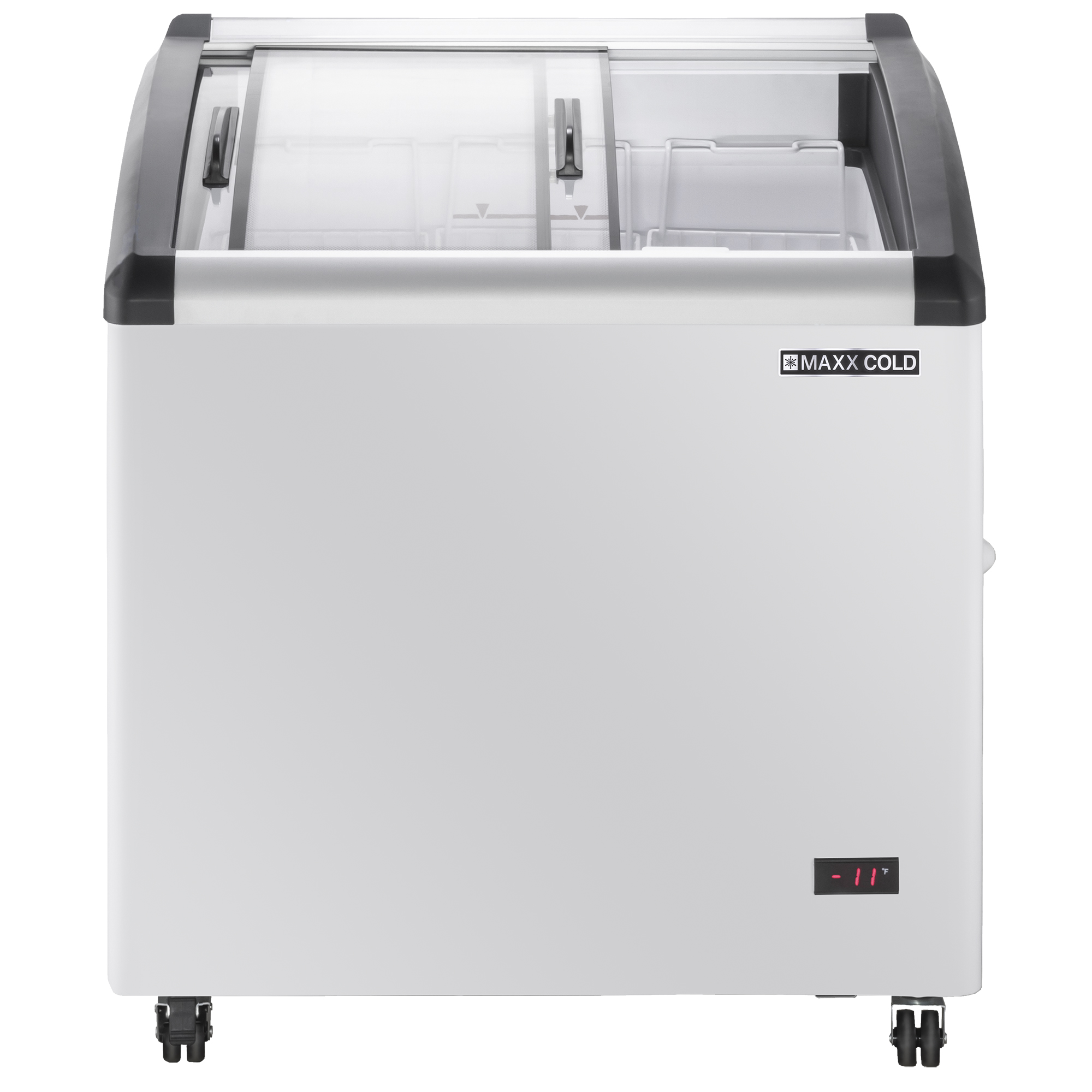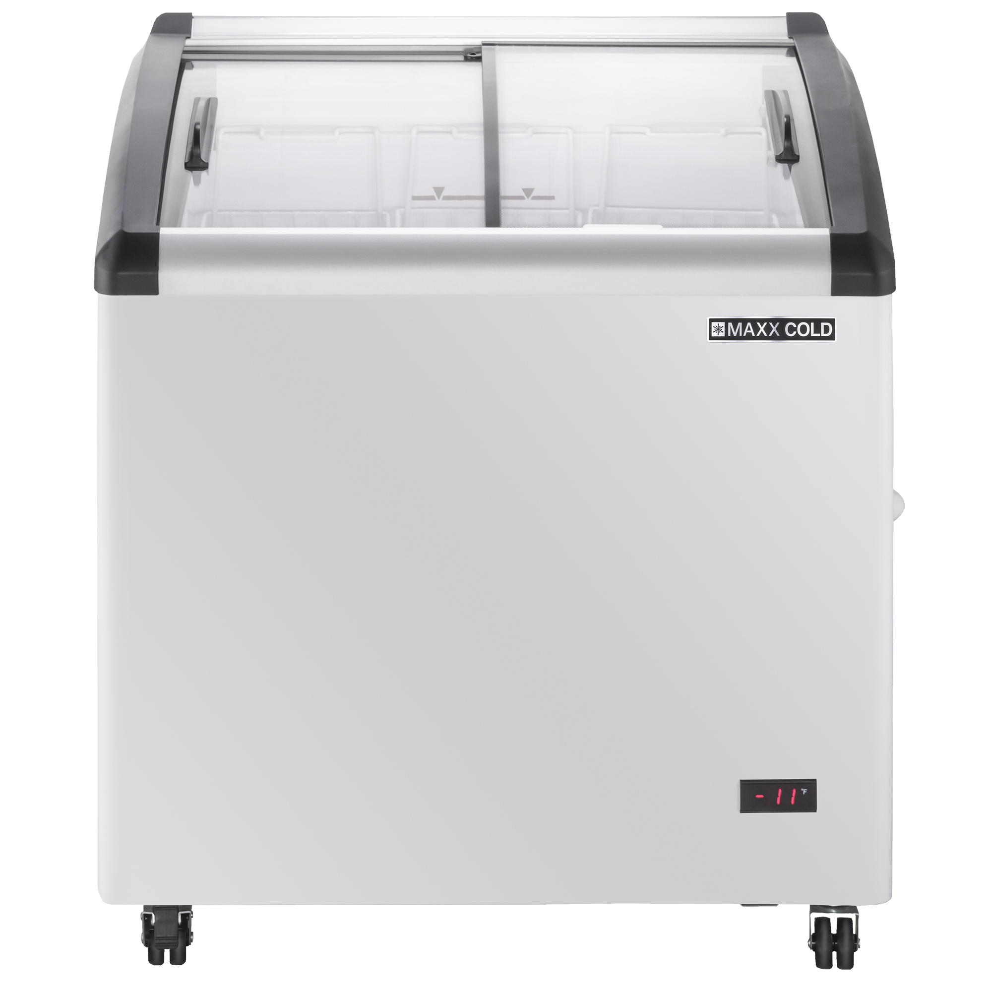 | Long Description | Designed to showcase and merchandise ice cream and other frozen treats, the Maxx Cold X-Series Curved Glass Top Mobile Ice Cream Display Freezer offers convenience, flexibility and mobility in retail environments. This commercial ice cream display freezer provides 4.87 cubic feet (138 L) of storage space for ice cream and other frozen desserts. The curved glass sliding lids have easy-grip handles, ensuring your frozen treats are clearly visible and easily accessible. The unit contains three flat wire baskets with compartments to store and organize frozen treats. This commercial chest freezer display is engineered with thick 2.5" foamed-in-place, environmentally friendly polyurethane insulation. Its interior is equipped with LED lighting, enhancing your products and making it easier for customers to see your selection. This mobile ice cream freezer has a molded plastic lid frame that is heated to prevent frost and ice build-up. The curved glass top freezer display has an internal condensate evaporator pan, so no floor drain is needed. This Maxx Cold ice cream freezer is constructed of durable, white powder-coated, baked-on enamel steel and a white powder-coated interior for easy cleaning. A lock and key set protects your frozen treats during off-hours. The unit has four heavy-duty casters (one with a brake) for easy mobility. Available in various sizes to meet your needs, the Maxx Cold X-Series Curved Glass Top Mobile Ice Cream Display Freezer is ideal for commercial settings such as convenience stores, supermarkets, ice cream parlors, dessert shops and more. Covered by the Maxx Cold One-Year Parts & Labor + Five-Year Compressor (Part Only) Warranty. |