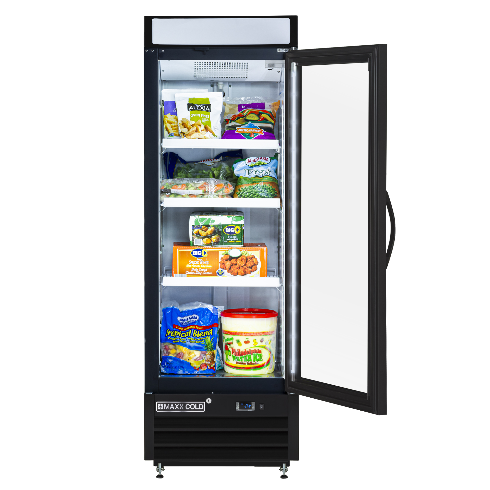 | Long Description | Designed for durability and visual appeal to display your products, the Maxx Cold X-Series Single Glass Door Merchandiser Freezer is a great way to show off your selection of frozen foods, such as frozen desserts, meals, pizzas, bagged ice and more. This commercial merchandiser freezer features one self-closing, triple-pane insulated glass door. Three adjustable heavy-duty PE-coated wire shelves keep your products organized and easy to access. Simple-to-use, programmable solid-state digital controls deliver accurate temperature regulation. This glass door merchandiser is constructed of a black powder-coated steel exterior and powder-coated aluminum interior. It provides up to 16 cubic feet of storage capacity. The unit is supplied with an illuminated top panel for advertising and promoting your products. A lock and key set is included for security. This glass door merchandising freezer is energy efficient and effective at displaying products at the right temperature to preserve freshness and shelf life, making it ideal for your needs in convenience stores and other commercial settings. The Maxx Cold X-Series Single Glass Door Merchandiser Freezer is a valuable asset for retail businesses looking to display and sell frozen food products effectively while enhancing the shopping experience for customers. Covered by the Maxx Cold One-Year Parts & Labor + Five-Year Compressor (Part Only) Warranty. |
