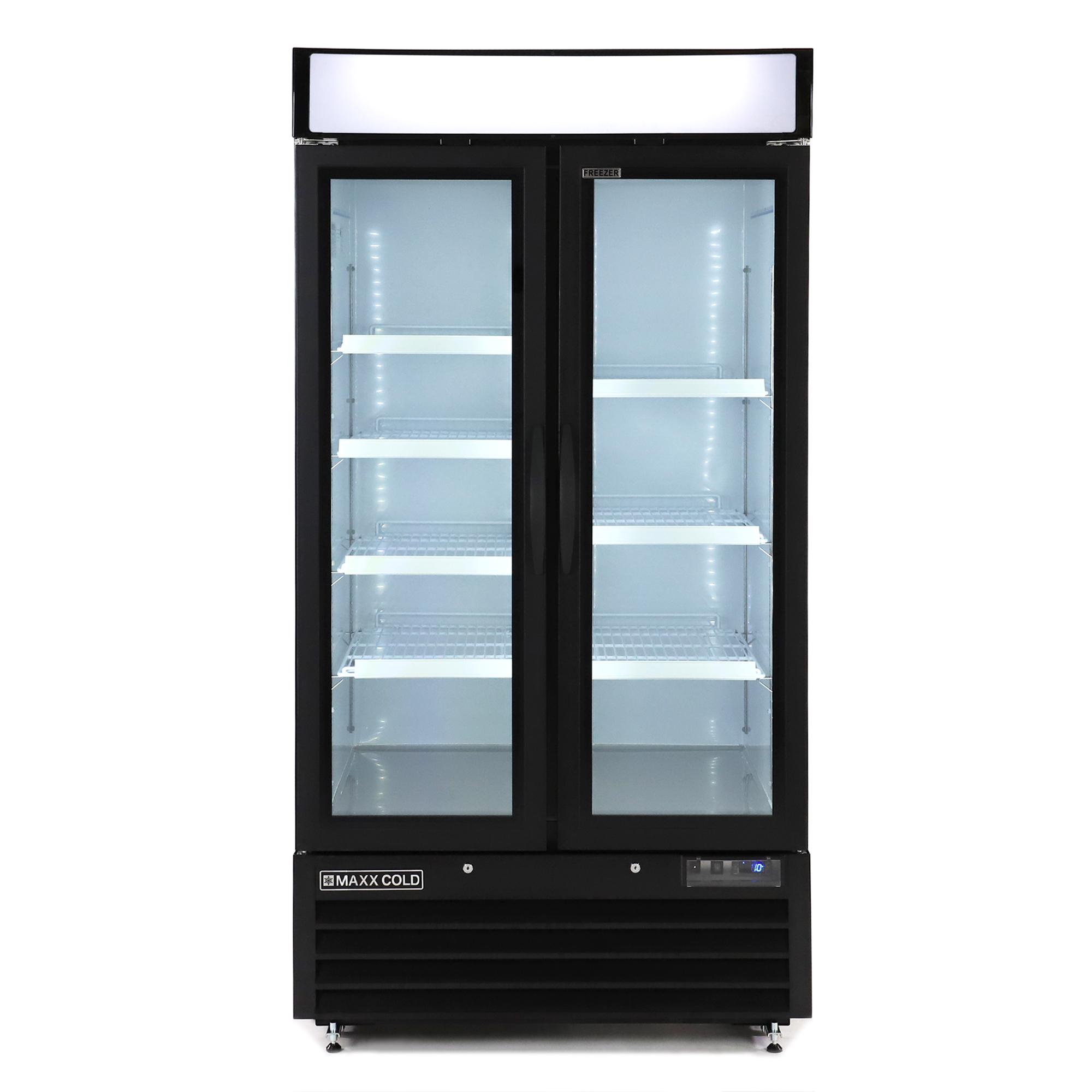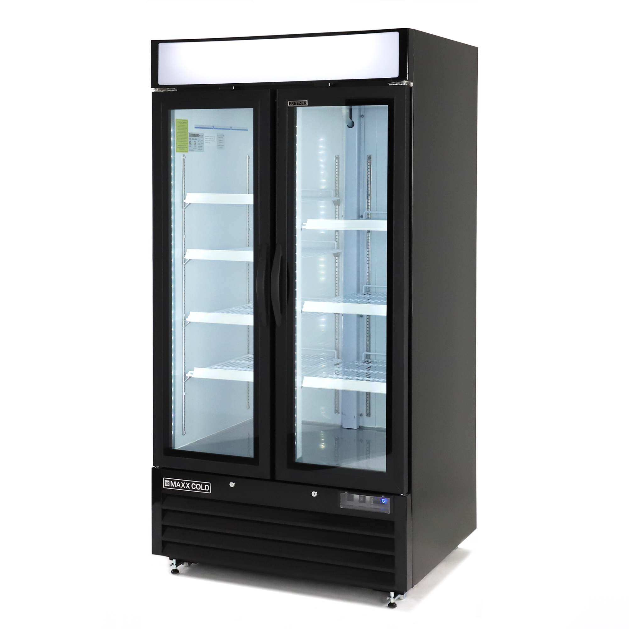 | Long Description | Maxx Cold Narrow Width, Double Glass Door Merchandiser Freezers are ideal for compact environments offering an attractive display for last minute purchases or storage depending on the foodservice, beverage and retail application. The upright freezer cabinets are available in two door, self-closing swing doors. Smooth, powdered coated steel exterior is available in either white or black with an illuminated top to personalize your advertising message. Merchandiser Freezer units are supplied with four (4) adjustable shelves per door, lock and key set and interior LED lighting to display merchandiser contents. Electronic thermostat, digital LED temperature display regulate accurate temperature, prolonging and preserving shelf life of products. Not only are controls simple to use, operation is energy efficient with CFC refrigerant and foam insulation. |