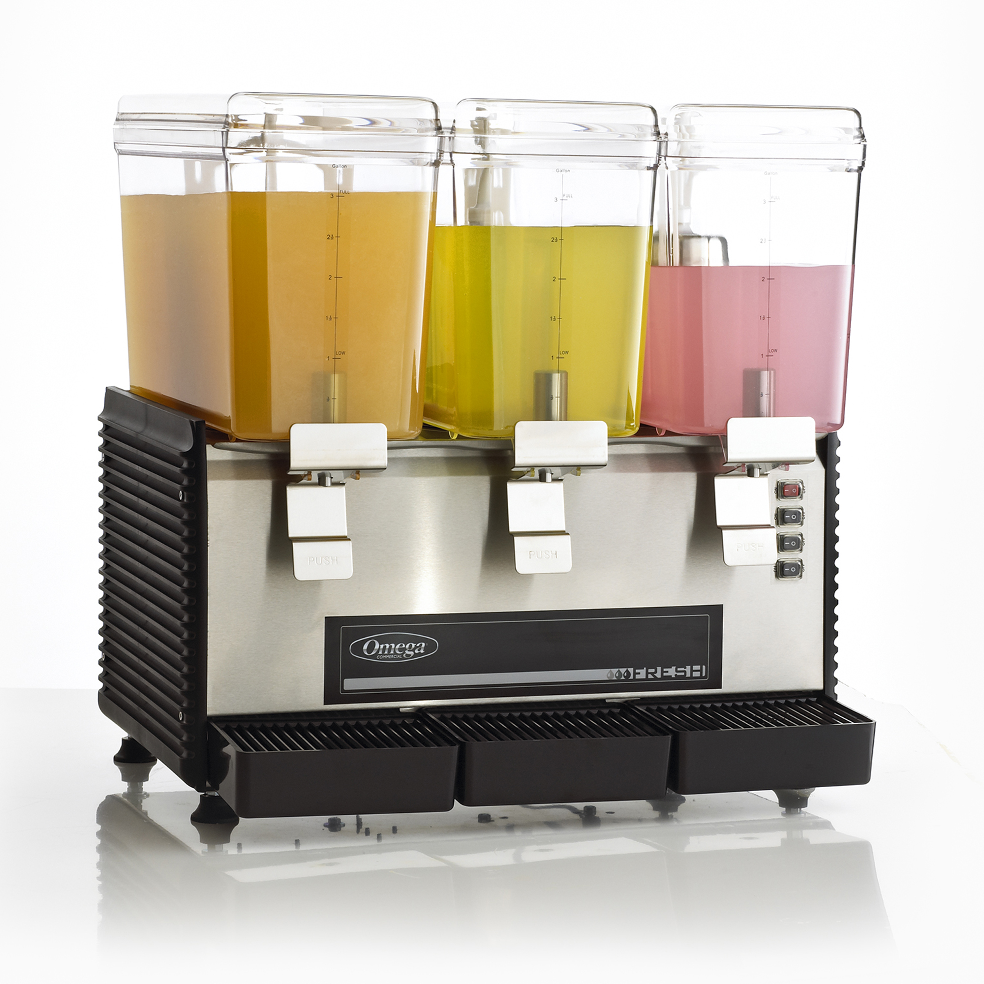 | Long Description | Designed to dispense cold drinks quickly and efficiently, the Omega Triple 3 Gallon Bowl Drink Dispenser is perfect for a variety of beverages such as iced teas, lemonades, and fruit juices. This beverage dispenser has three three-gallon bowls that are ideal for serving customers without requiring constant refilling. The bowls are made of durable polycarbonate and the clear tanks entice customers by showcasing your colorful beverages. The triple beverage dispenser features a space-saving design, providing the highest level of performance in the minimum amount of space. The continuous circulating rotary system keeps the beverages fresh and perfectly consistent each and every time they are served. The unit is constructed of a durable stainless steel cooling cylinder, frame and front panel. The removable drip trays make cleanup easy. The on/off switch gives you control over the unit's power and stirring paddle. The commercial drink dispenser has an upgraded counterweight fluid pin assembly for superior dispensing performance. Rotating agitator paddles with magnetic overload protection prevent jamming that could impact the dispenser's performance. Built to withstand daily fast-paced environments, this beverage dispenser uses R-134a refrigerant to keep drinks at a consistent, refreshing temperature. This cold beverage dispenser is ideal for use in restaurants, cafes, cafeterias, convenience stores, hotels and catered events. Serve refreshing, delicious drinks while keeping both customers and staff satisfied with the Omega Triple 3 Gallon Bowl Drink Dispenser. Covered by the Omega One-Year Limited Warranty. |