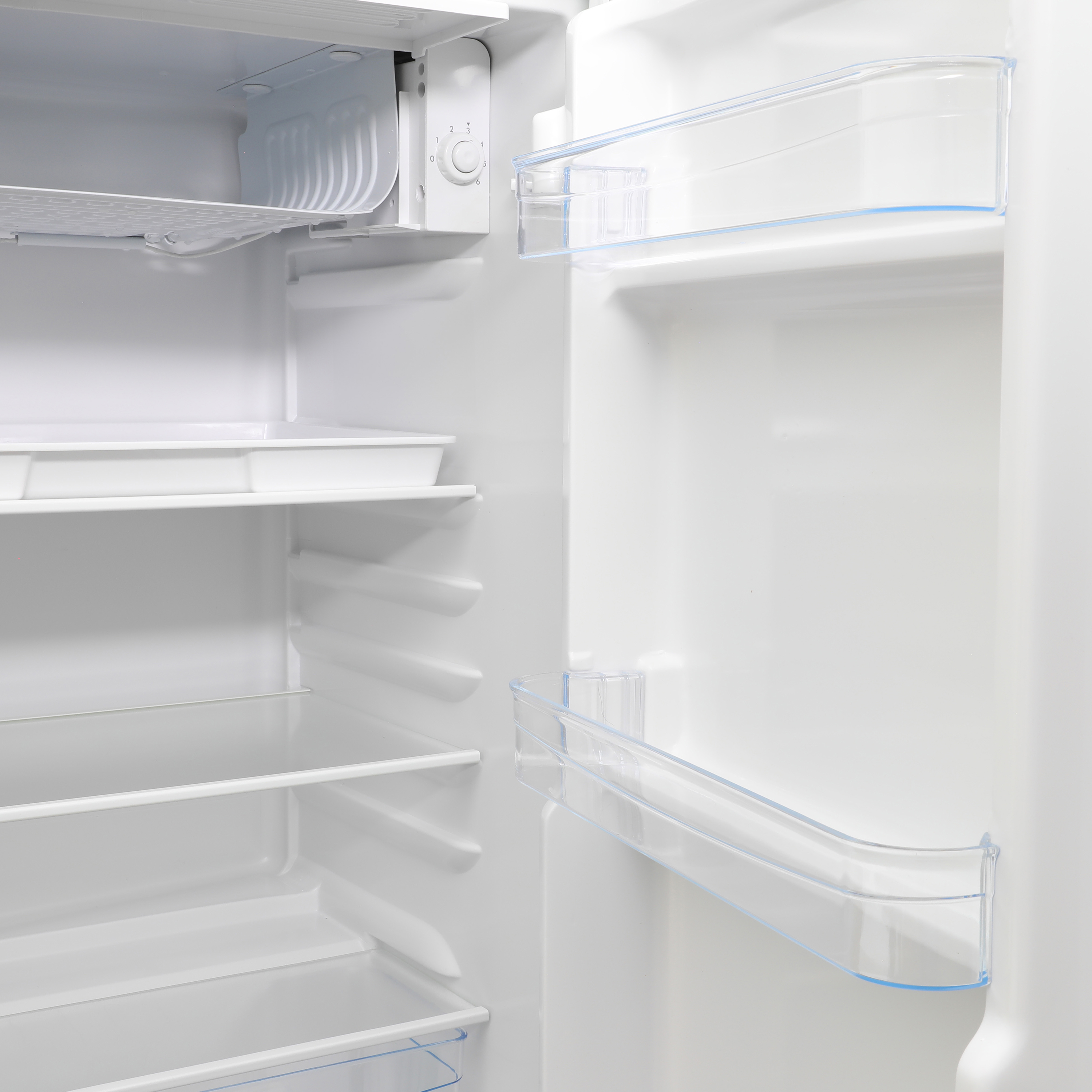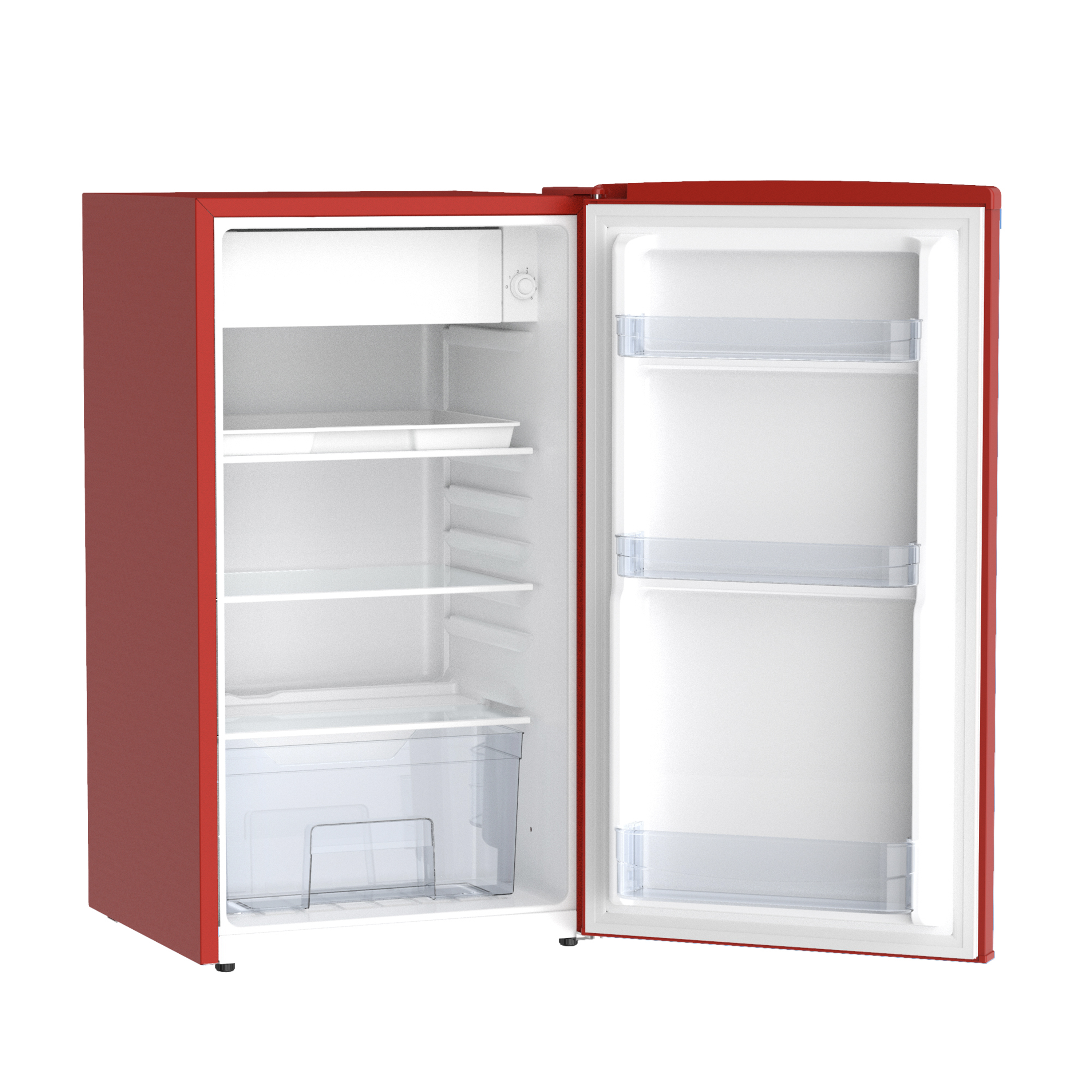 Inside, you’ll find two adjustable and removable glass shelves, allowing you to customize the layout to suit your storage needs and making cleaning a breeze. The transparent design also makes it easy to locate and access your food items at a glance. The mechanical temperature control dial lets you quickly and easily adjust the cooling settings to meet your preferences.