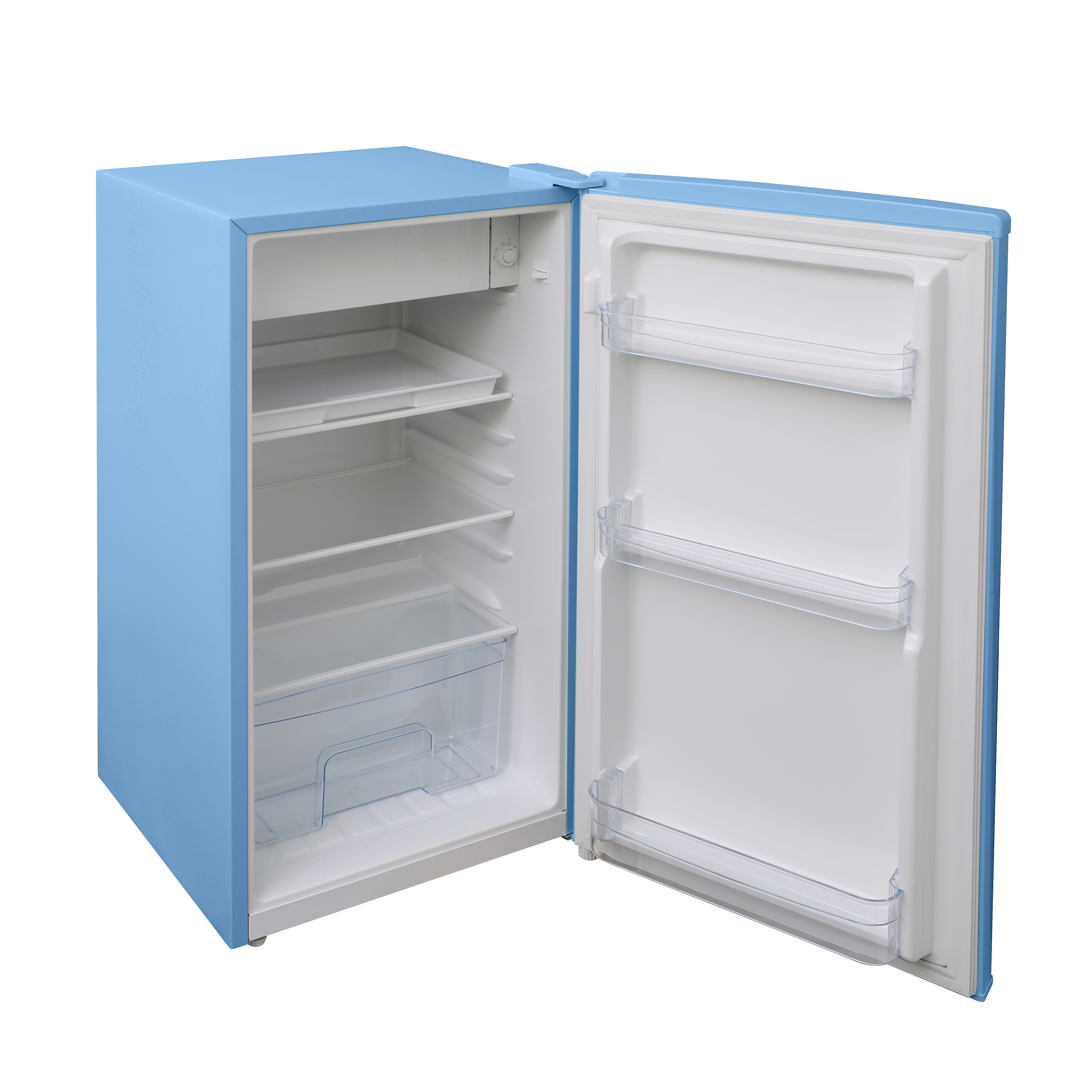Inside, you’ll find two adjustable and removable glass shelves, allowing you to customize the layout to suit your storage needs and making cleaning a breeze. The transparent design also makes it easy to locate and access your food items at a glance. The mechanical temperature control dial lets you quickly and easily adjust the cooling settings to meet your preferences.