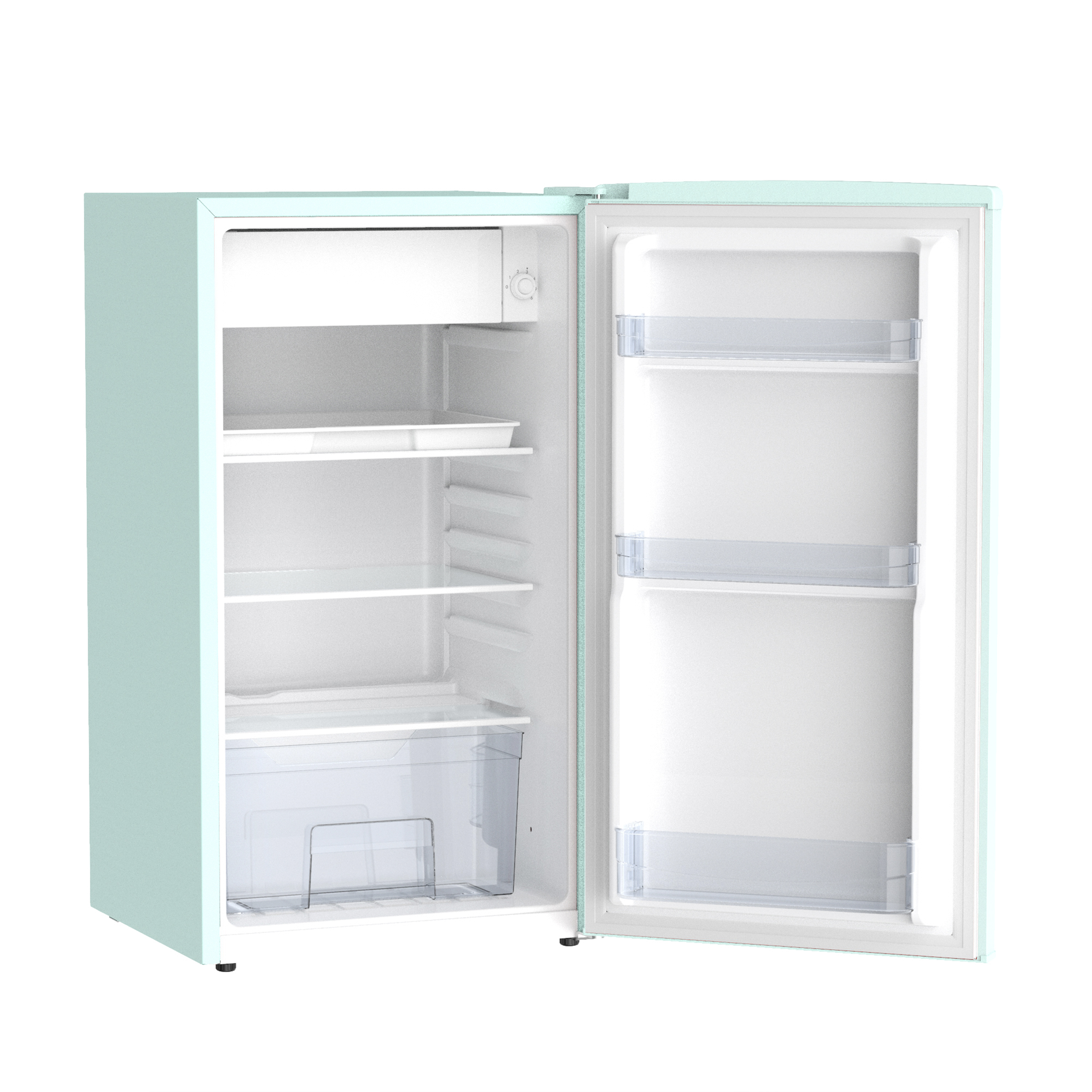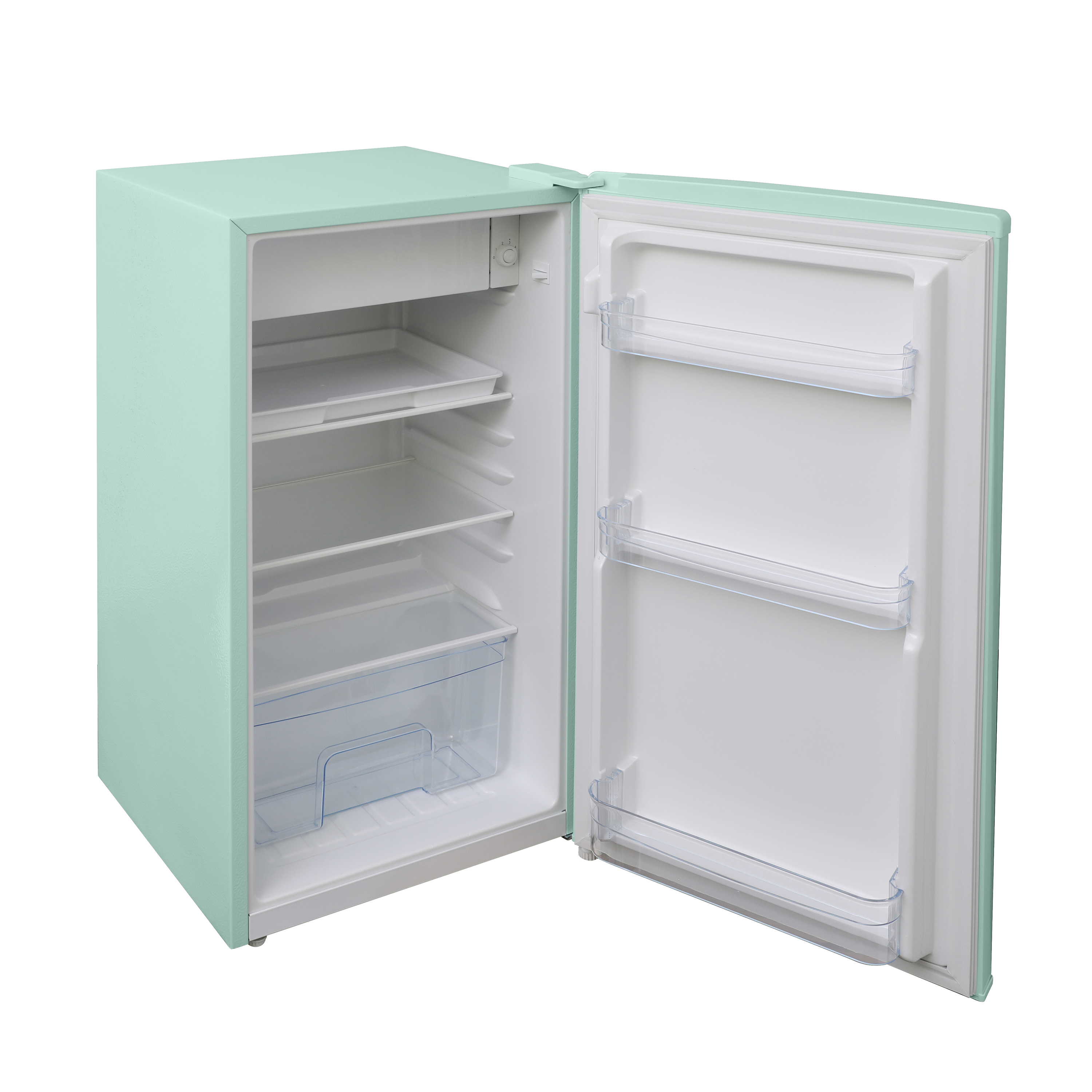 Inside, you’ll find two adjustable and removable glass shelves, allowing you to customize the layout to suit your storage needs and making cleaning a breeze. The transparent design also makes it easy to locate and access your food items at a glance. The mechanical temperature control dial lets you quickly and easily adjust the cooling settings to meet your preferences.