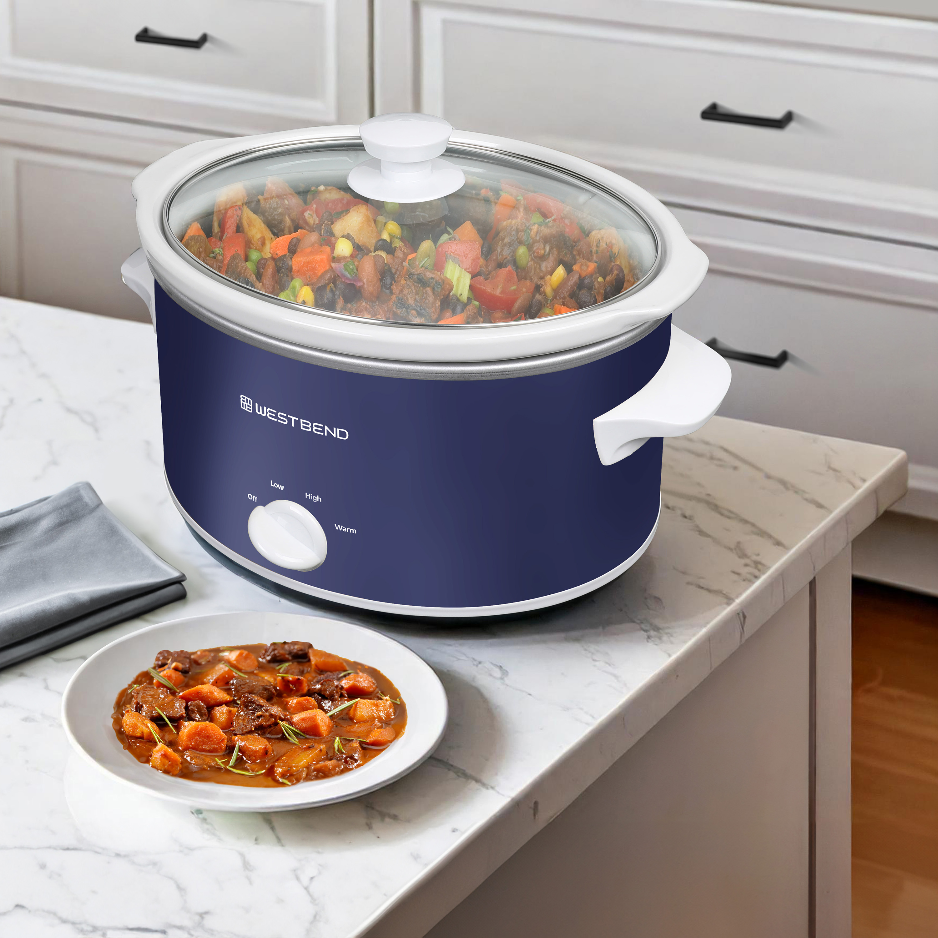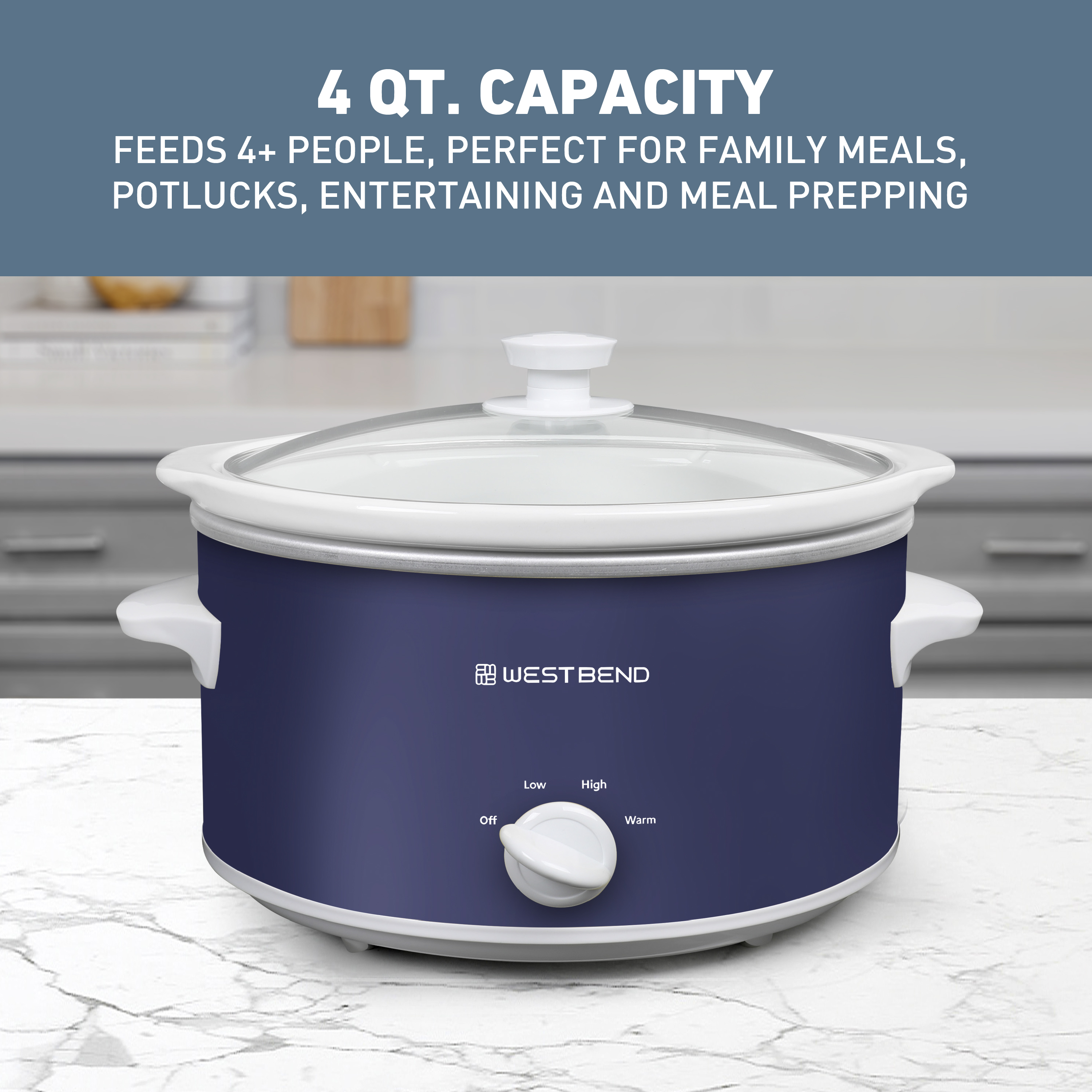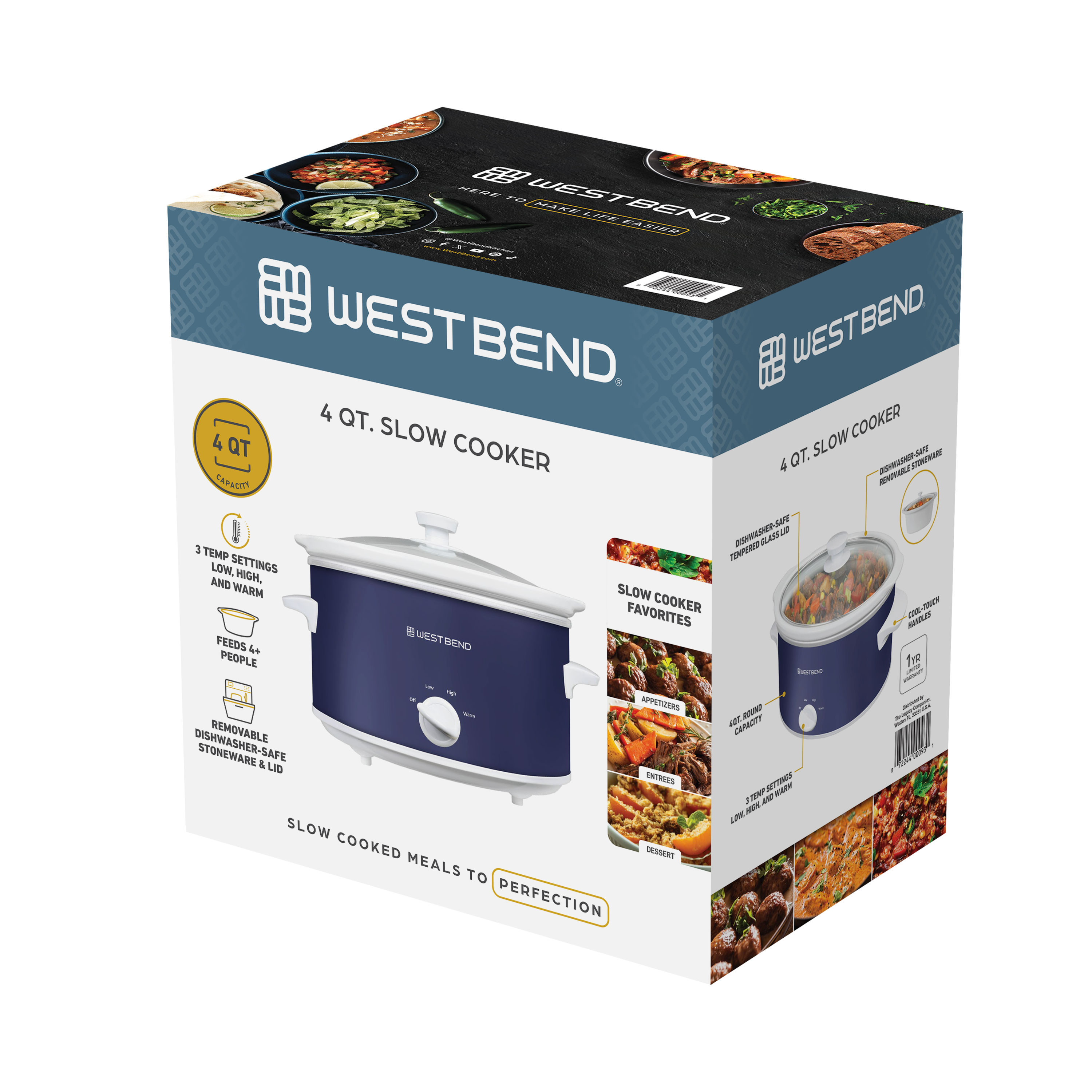 | Long Description | Embrace the ultimate cooking convenience and enjoy effortless meal preparation with the professionally crafted West Bend Slow Cooker that promises unbeatable performance and exceptional results every time. With its 4-quart size, this slow cooker is designed to cater to 4 or more, making it the perfect companion for family meals. Simplify your meal preparation routine with the West Bend Slow Cooker. Just load up the spacious cooking vessel with your ingredients of choice, select your preferred temperature setting from Low,High or Warm, and return home to perfectly cooked and ready-to-serve meals. Whether you're whipping up a savory chili or a tender pot roast, this versatile appliance ensures your dishes are cooked to perfection every time. Enjoy the convenience of the West Bend Slow Cooker's dishwasher-safe ceramic crock and tempered glass cover, allowing for hassle-free cleanup post-feast. The 3 manual heat settings provide you with the flexibility to tailor your cooking experience. The convenient WARM setting keeps your meals at an ideal serving temperature until you're ready to dig in. Not just a kitchen workhorse, the West Bend Slow Cooker features a stylish navy blue design, adding a touch of sophistication to your kitchen. Elevate your kitchen decor and simplify your cooking routine with this must-have appliance that combines style with functionality. Say goodbye to stressful meal prep and hello to delectable dishes with the West Bend Slow Cooker as your trusty cooking companion. |