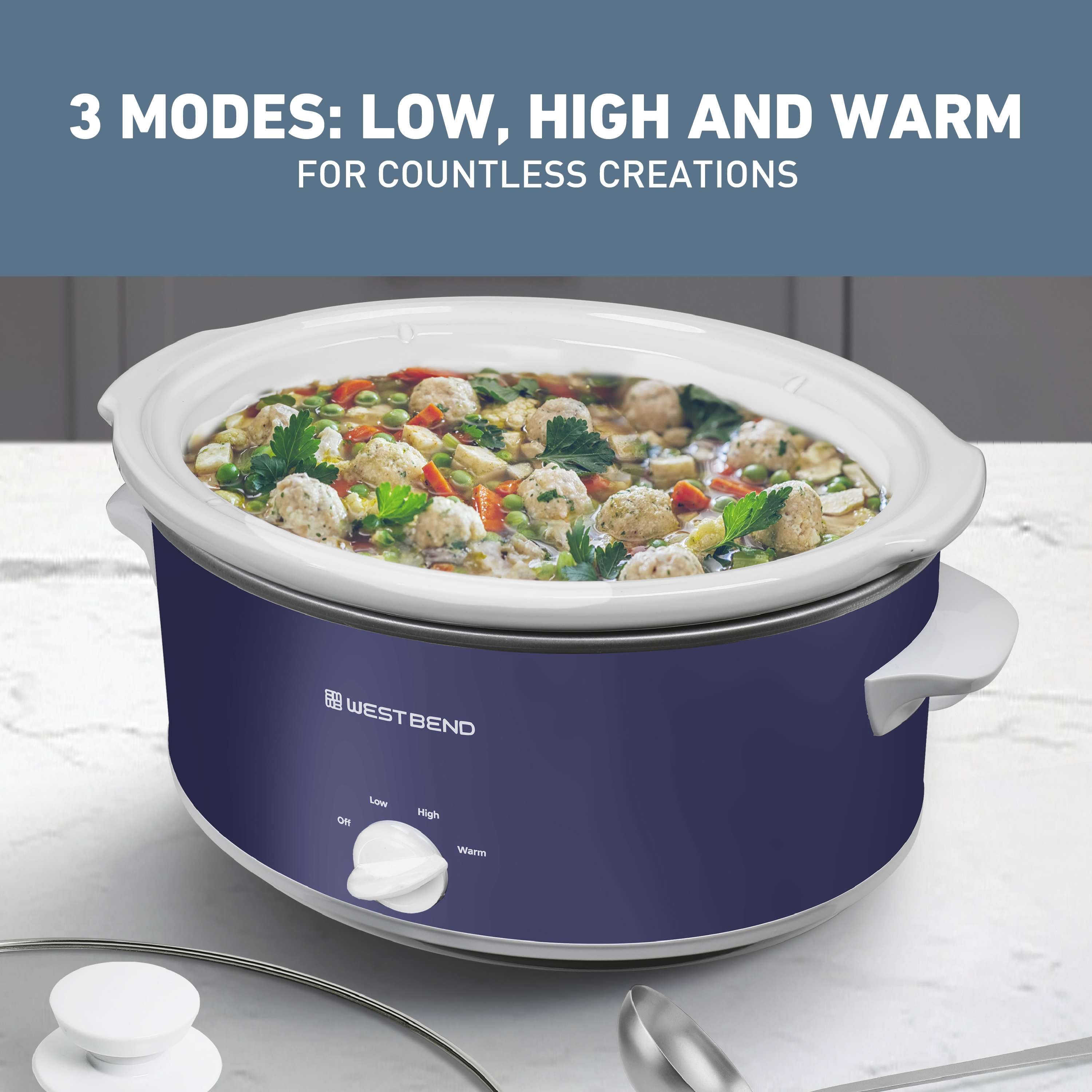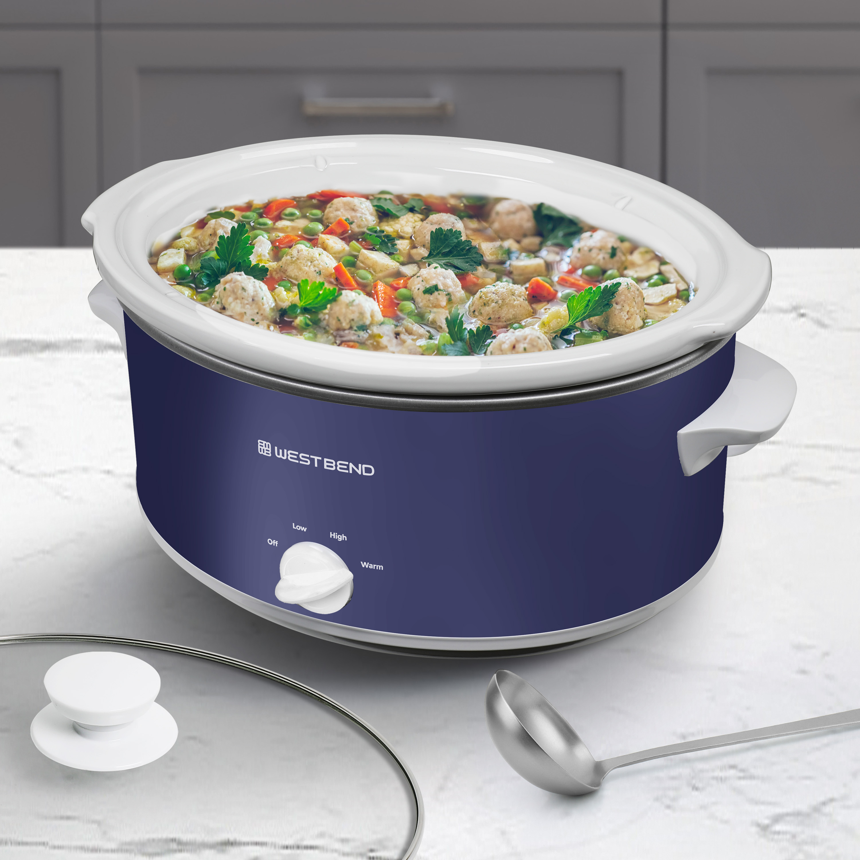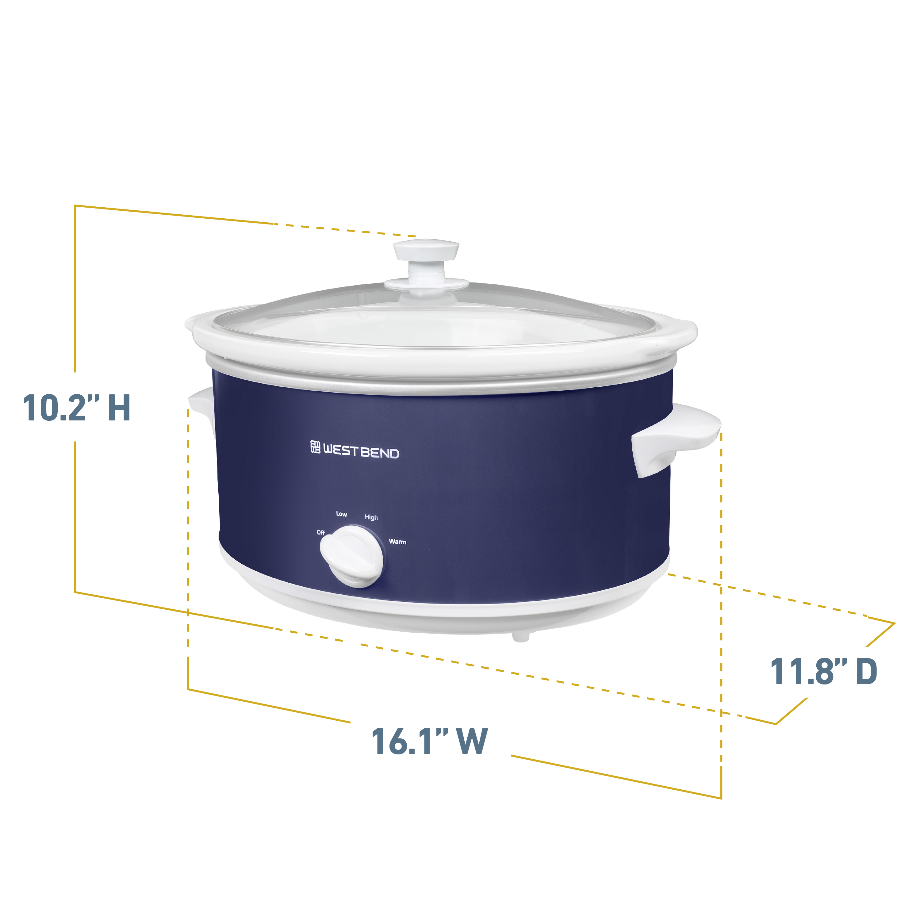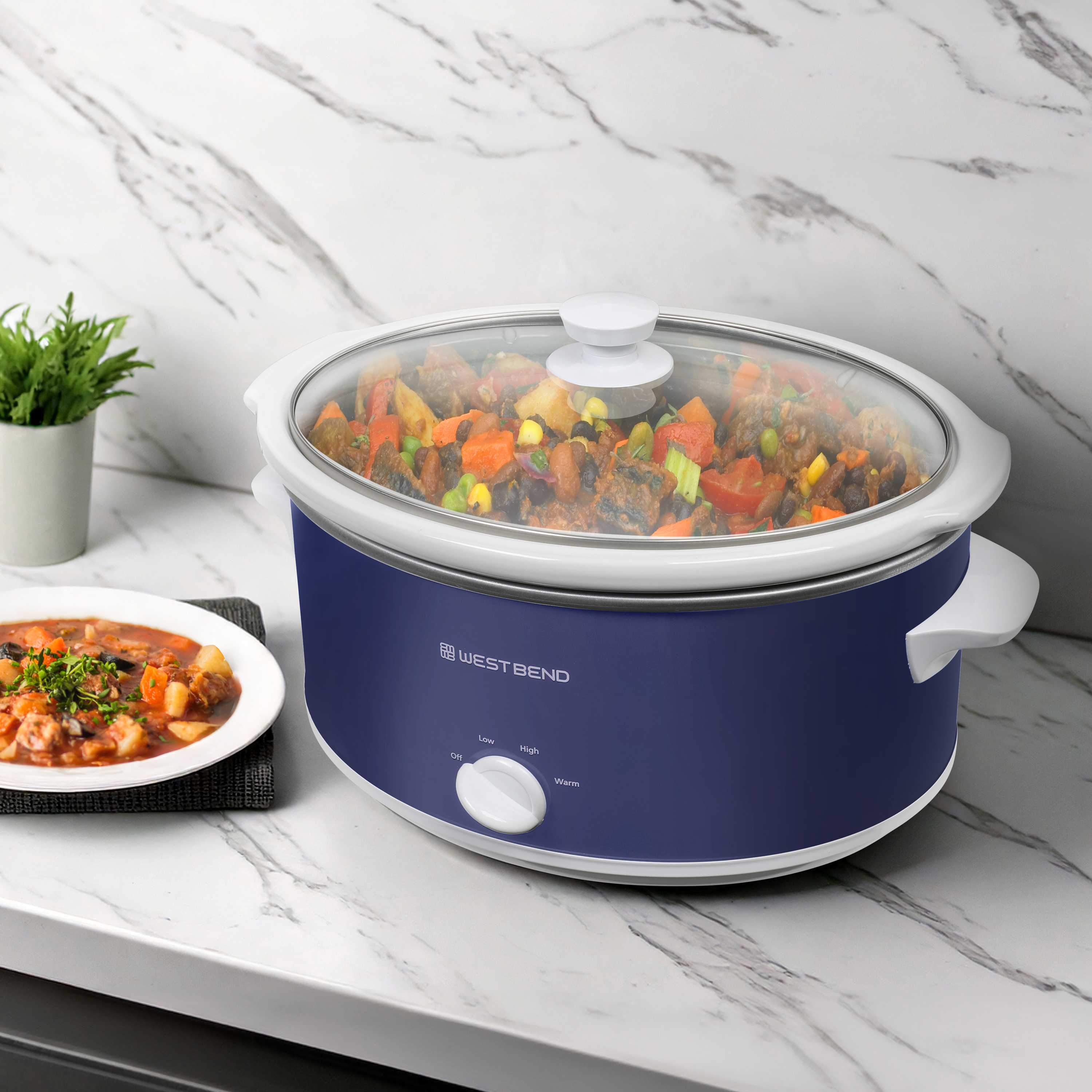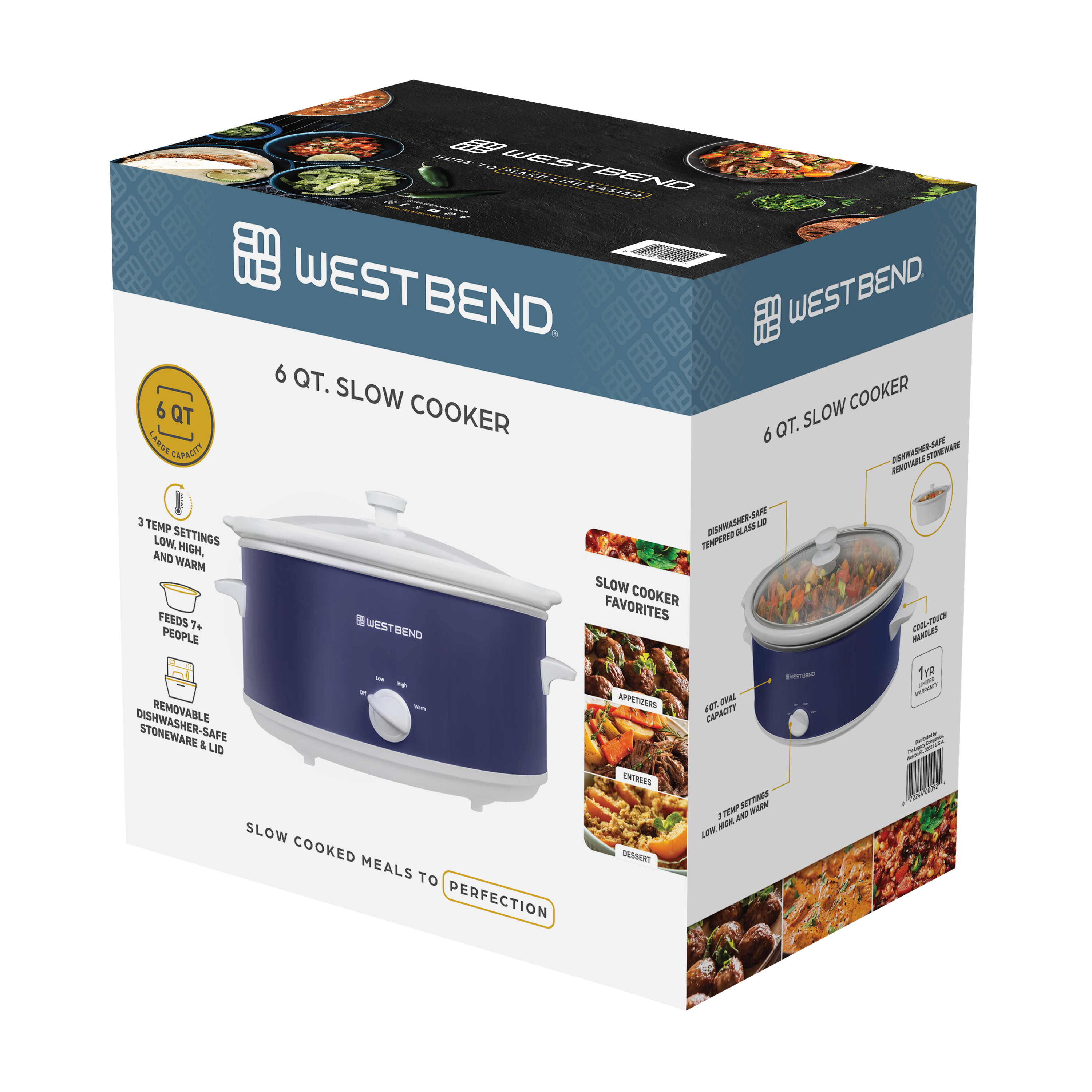 | Long Description | Embrace the ultimate cooking convenience and enjoy effortless meal preparation with the professionally crafted West Bend Slow Cooker that promises unbeatable performance and exceptional results every time. With its ample 6-quart size, this slow cooker is designed to cater to parties of 7 or more, making it the perfect companion for family meals and gatherings. Simplify your meal preparation routine with the West Bend Slow Cooker. Just load up the spacious cooking vessel with your ingredients of choice, select your preferred temperature setting from Low,High or Warm, and return home to perfectly cooked and ready-to-serve meals. Whether you're whipping up a savory chili or a tender pot roast, this versatile appliance ensures your dishes are cooked to perfection every time. Enjoy the convenience of the West Bend Slow Cooker's dishwasher-safe ceramic crock and tempered glass cover, allowing for hassle-free cleanup post-feast. The 3 manual heat settings provide you with the flexibility to tailor your cooking experience. The convenient WARM setting keeps your meals at an ideal serving temperature until you're ready to dig in. Not just a kitchen workhorse, the West Bend Slow Cooker features a stylish navy blue design, adding a touch of sophistication to your kitchen. Elevate your kitchen decor and simplify your cooking routine with this must-have appliance that combines style with functionality. Say goodbye to stressful meal prep and hello to delectable dishes with the West Bend Slow Cooker as your trusty cooking companion. |