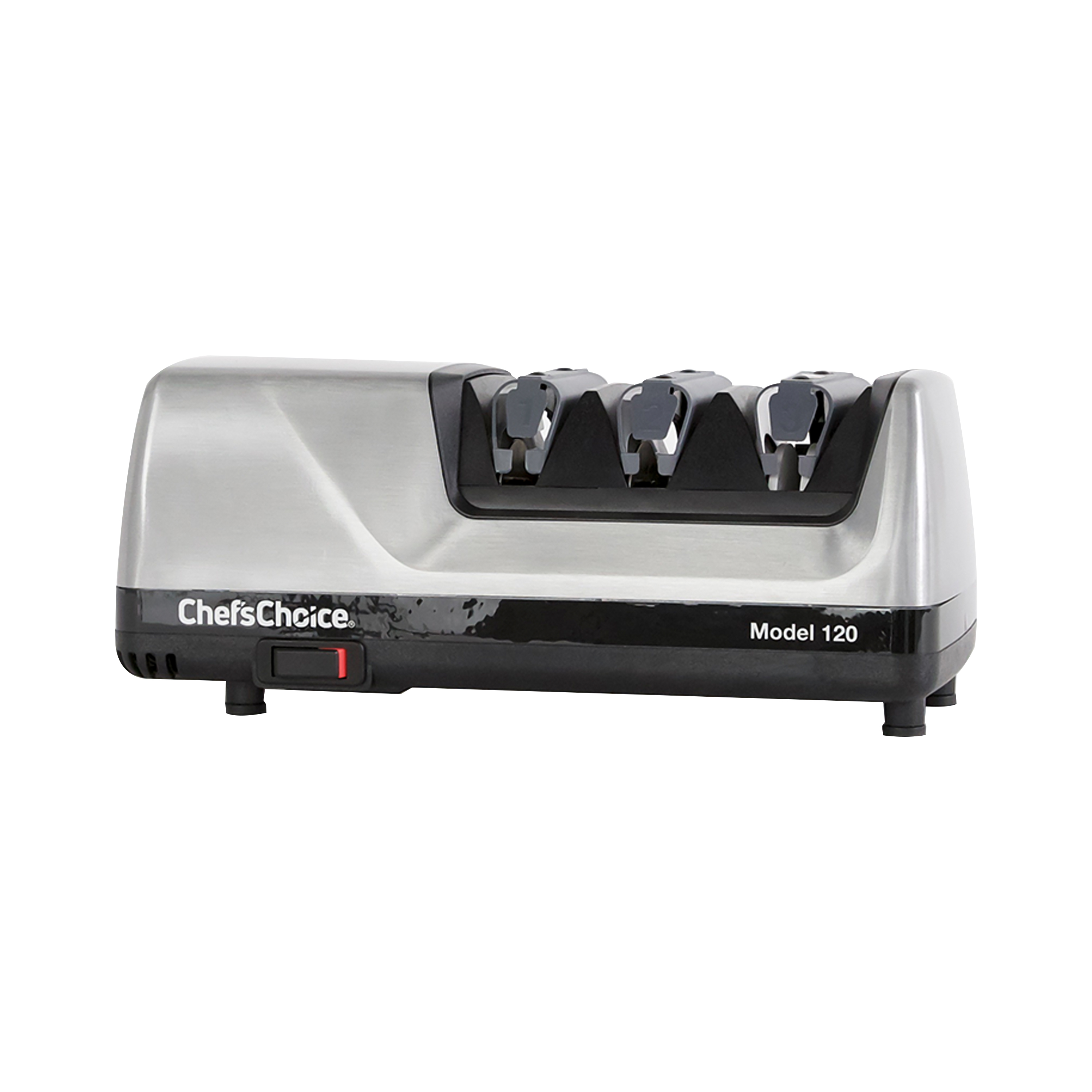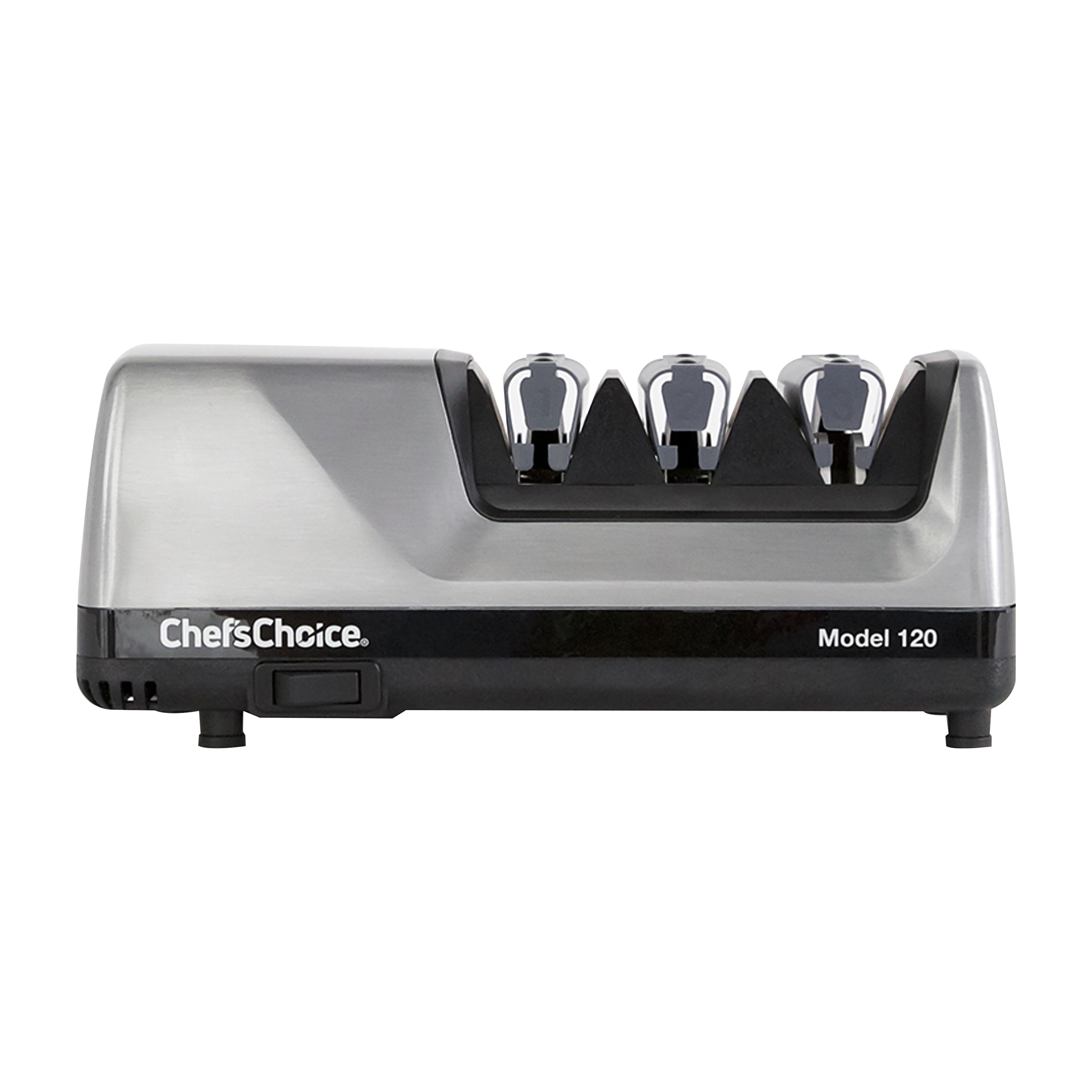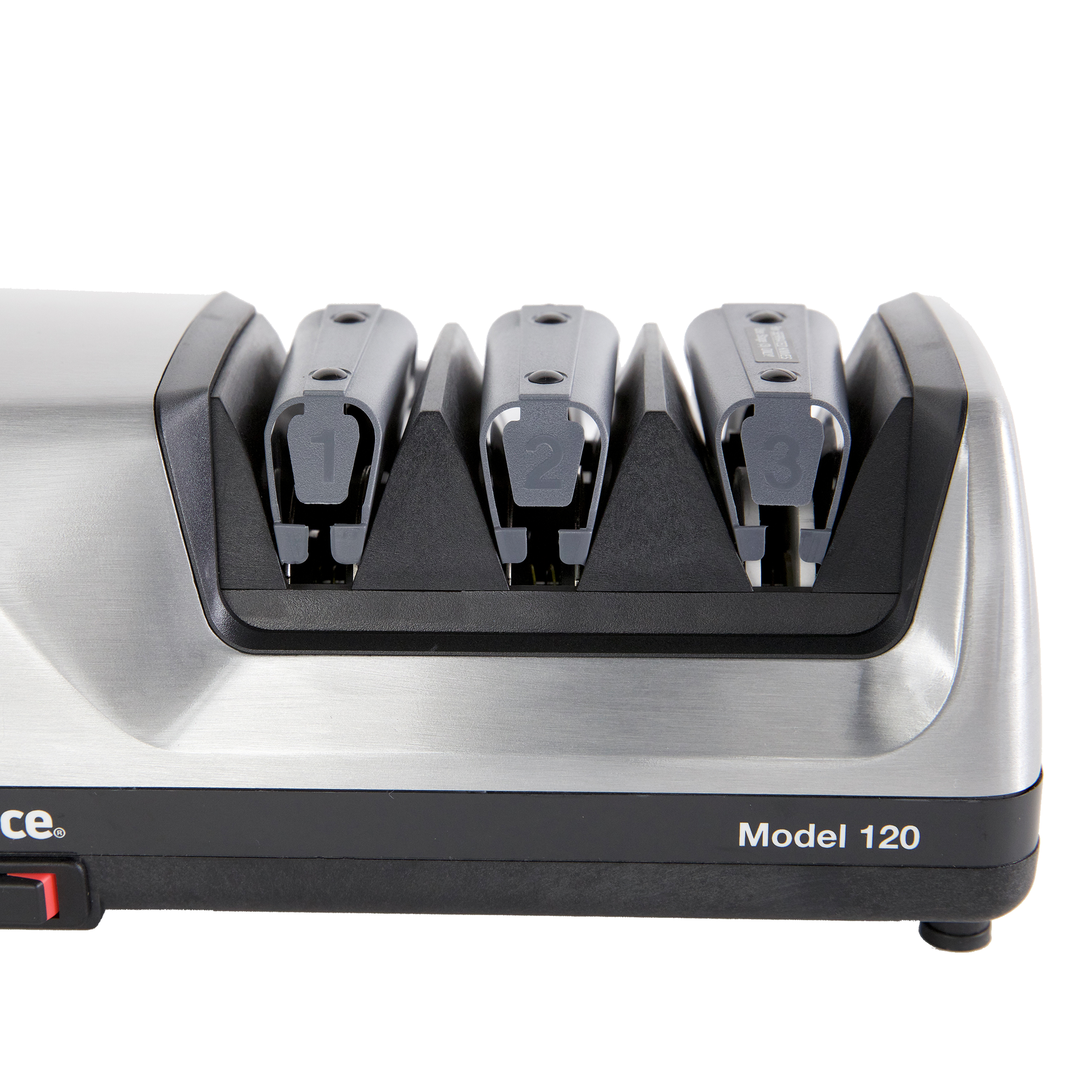 | Long Description | The 120 professional 3-stage electric knife sharpener is the ideal solution for improved cutting performance on 20-degree class knives. Using 100 percent diamonds, the hardest natural substance on earth, our patented abrasives sharpen faster and easier to create an ultra-sharp, longer lasting edge. In the final stage, patented stropping disks create an unparalleled polished finish. Precision angle guides ensure accurate sharpening throughout the entire blade length and eliminate any guesswork. This unit is designed to work with both straight-edge and serrated knives. |