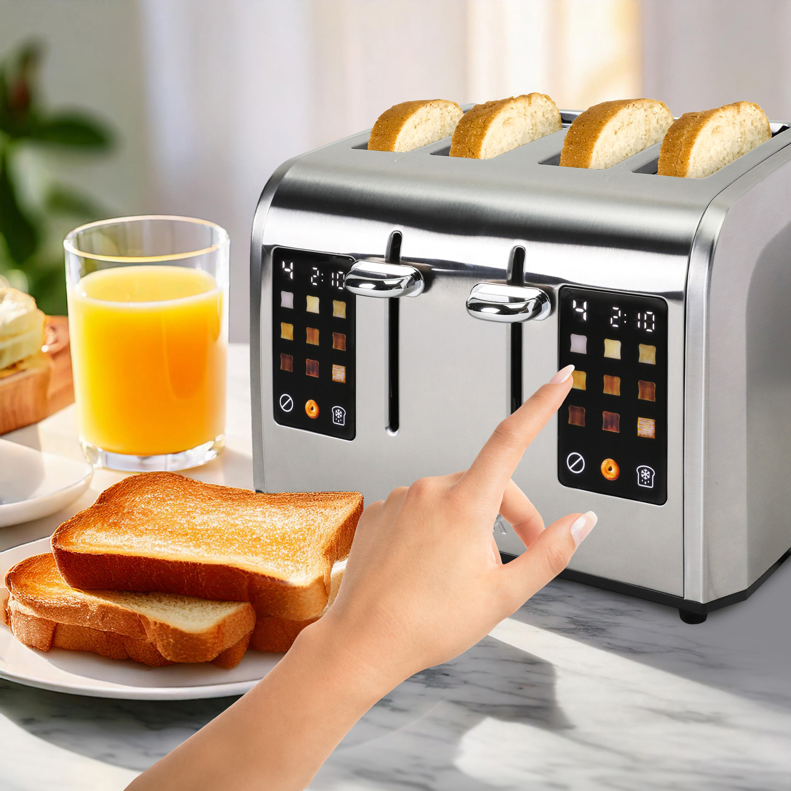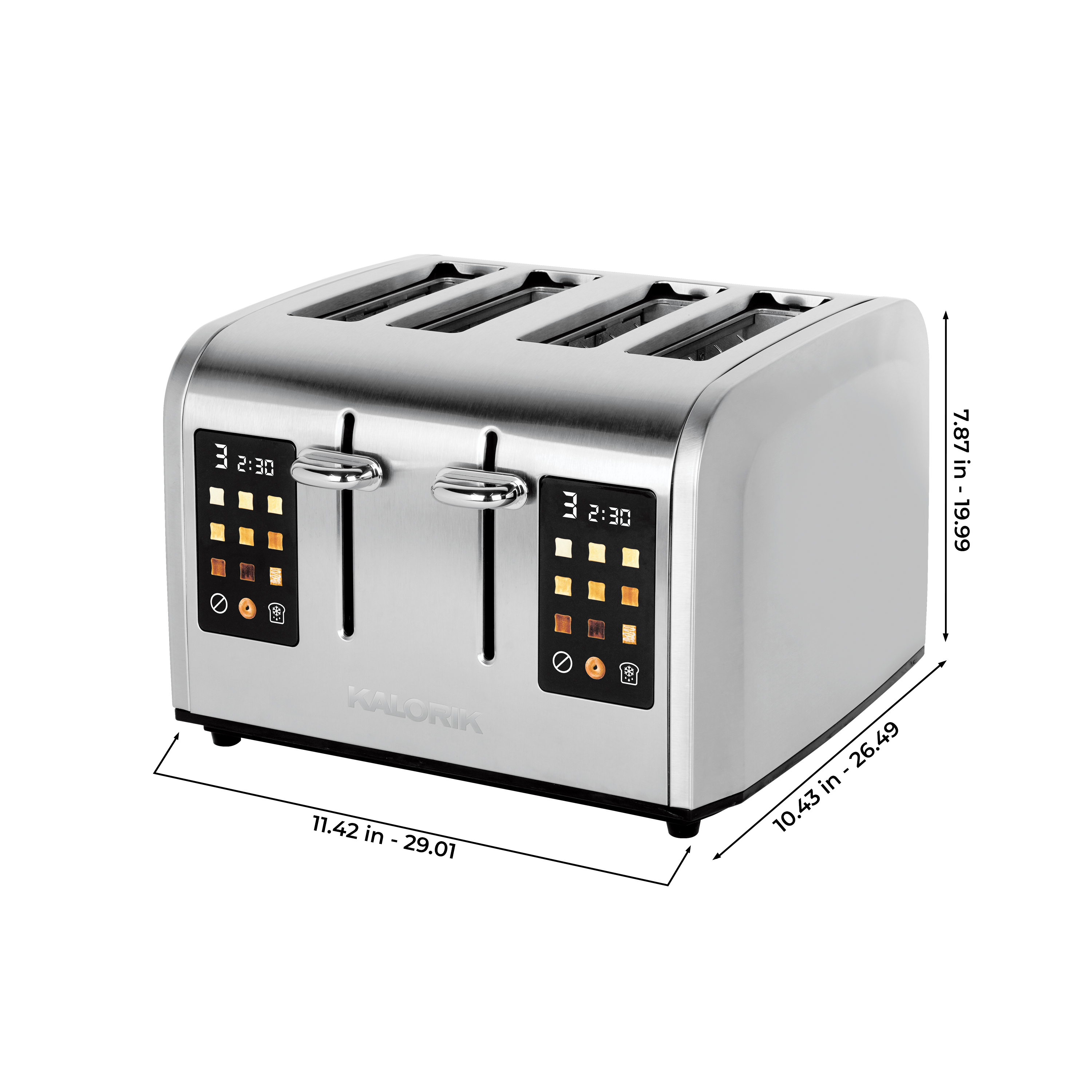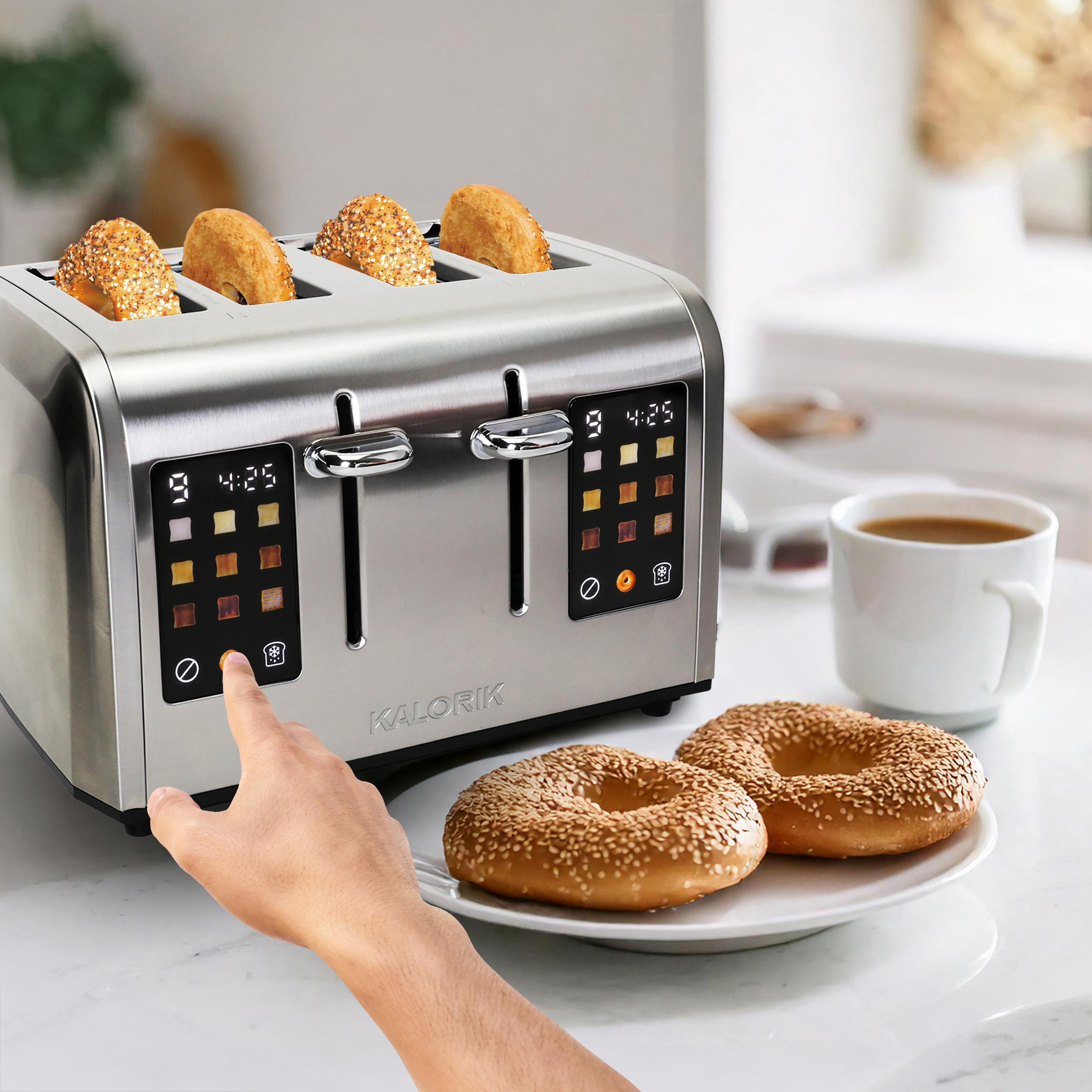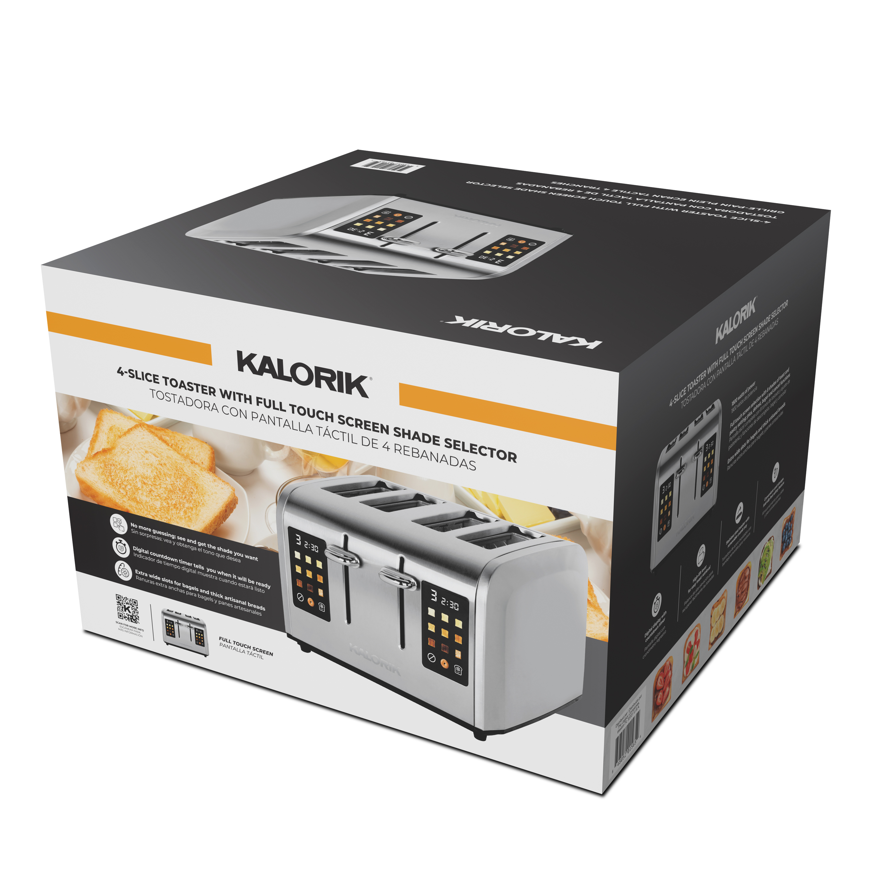 | Long Description | Elevate your morning rituals and transform the way you toast with the Kalorik® 4-Slice Toaster with Full Touch Screen Shade Selector. More than just a kitchen essential, this innovative appliance blends intelligent design, sleek aesthetics, and high-performance technology to bring you a smarter, more satisfying breakfast experience every day. Thoughtfully engineered for modern lifestyles, the Kalorik® 4-Slice Toaster is equipped with a full touchscreen control panel that makes customization effortless and intuitive. With just a tap, you can select from eight precise shade settings, plus a dedicated pastry function that ensures golden perfection for croissants, toaster strudels, and more. Say goodbye to inconsistent results—smart algorithms within the toaster detect and adjust the heat to match your preferred shade, removing the guesswork and saving time. Whether you like your toast barely golden or deeply browned, the Kalorik® toaster delivers consistent results without the need for multiple cycles. A boldly lit digital countdown timer enhances both convenience and control, letting you see exactly how much time remains until your breakfast is ready. Designed to handle more than just standard slices, this toaster features extra-wide slots that accommodate everything from thick artisanal breads and bagels to oversized waffles. The high-lift lever makes toast removal safe and easy, while the durable stainless-steel finish adds a polished, contemporary look to any countertop. Whether you're toasting for two or preparing breakfast for the whole family, the Kalorik® 4-Slice Toaster with Full Touch Screen Shade Selector combines innovation, elegance, and performance to meet your needs. Rediscover the joy of toasting with a toaster that adapts to you. This is not just breakfast—it’s an experience. Welcome to the future of toasting. |