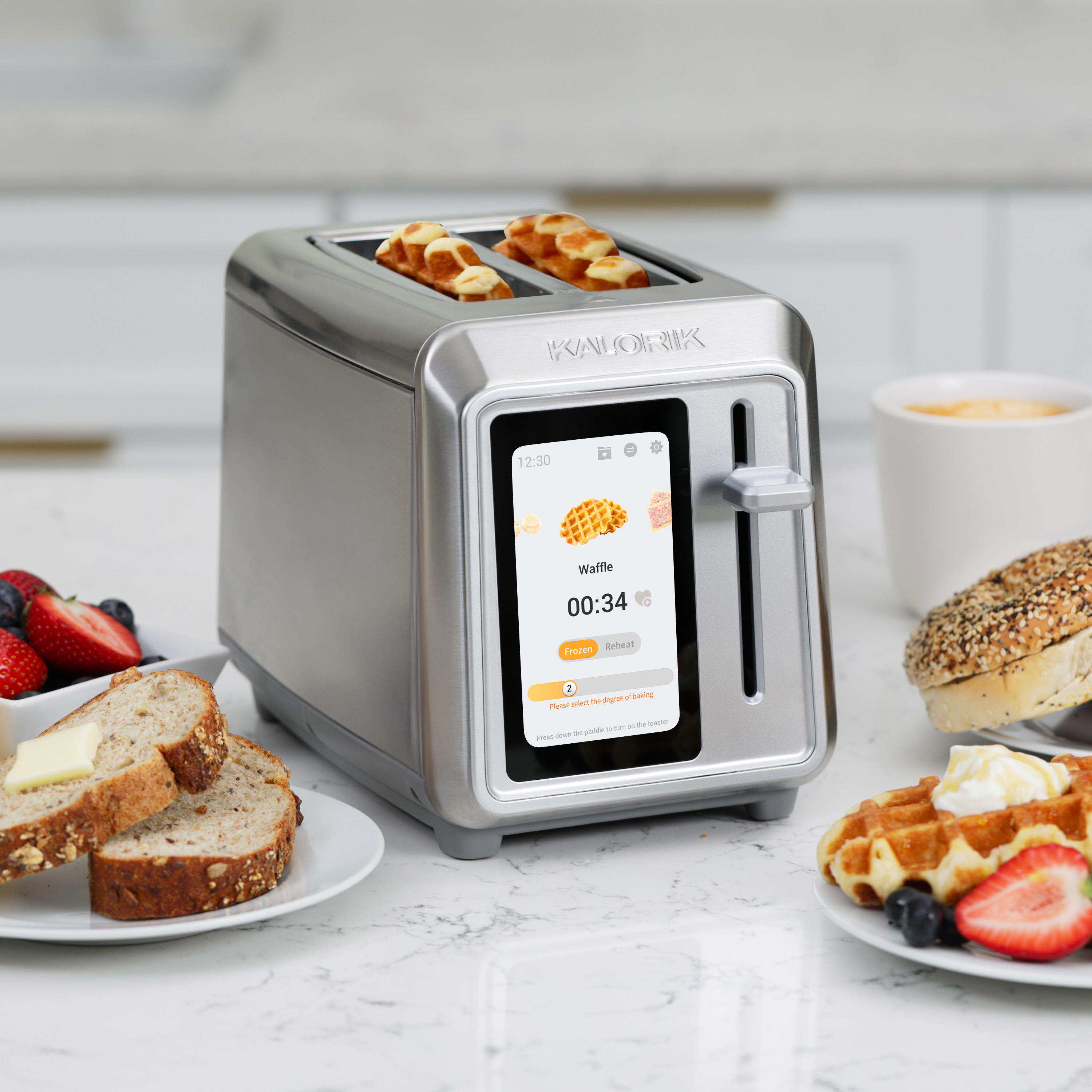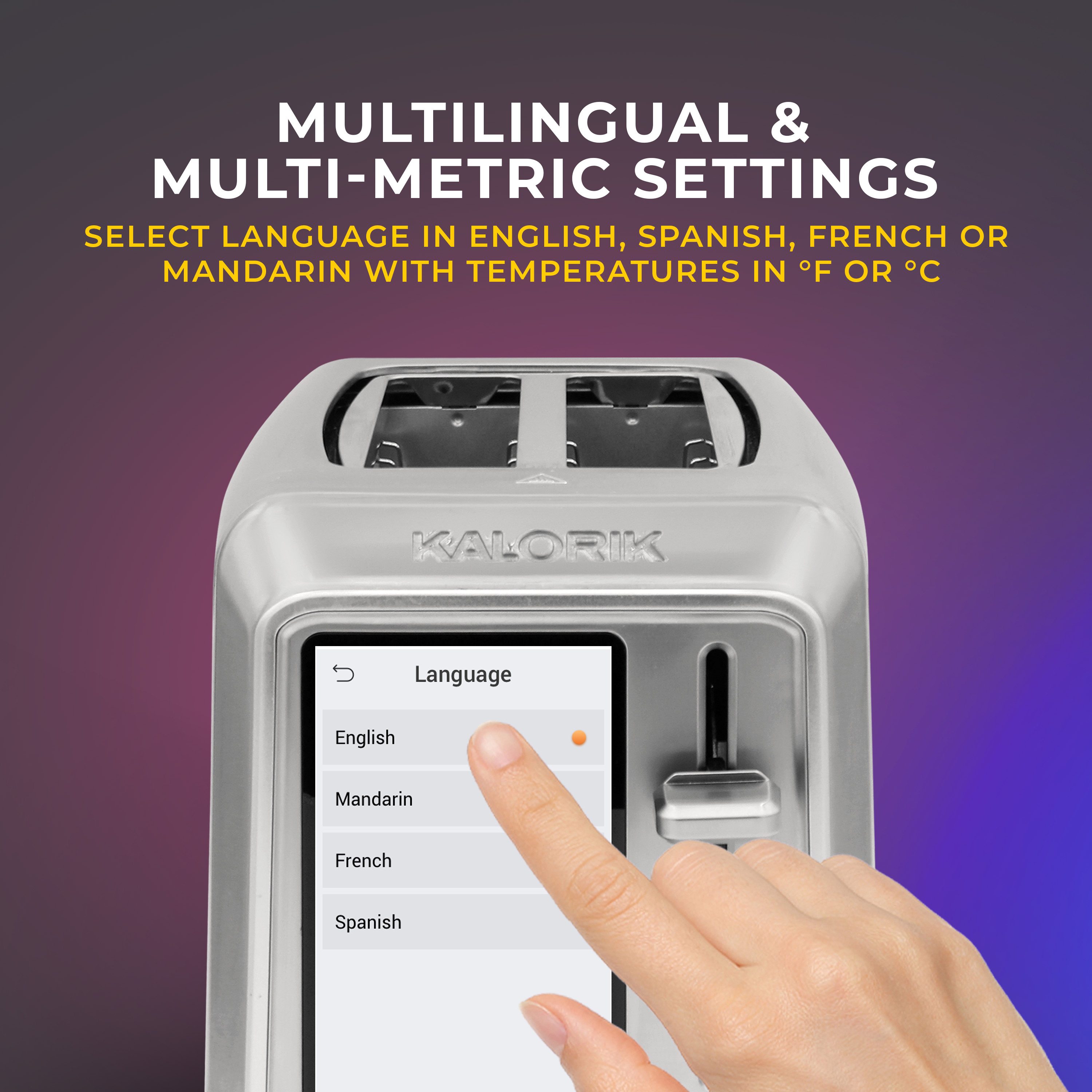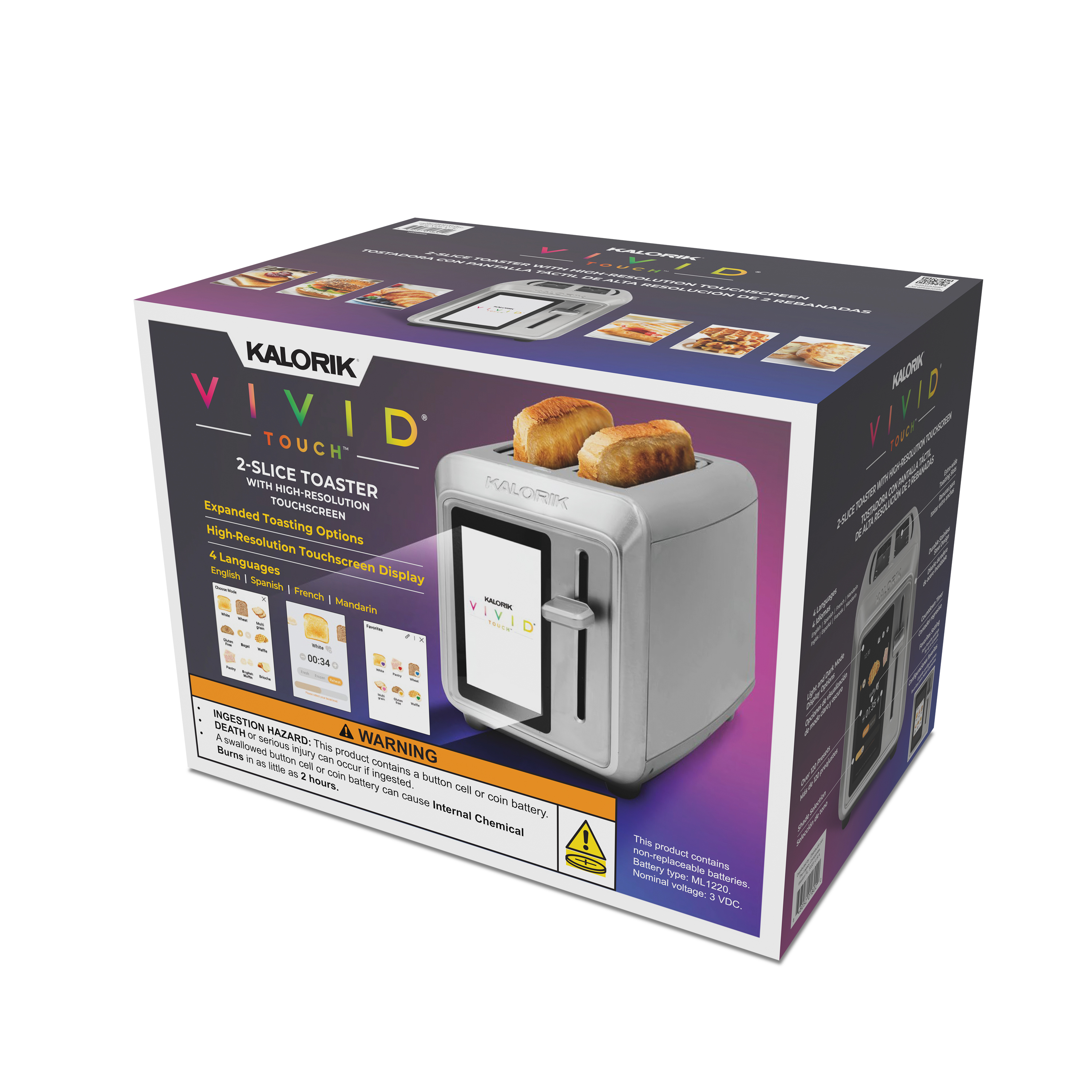 | Long Description | Meet the Kalorik® Vivid Touch 2-Slice Toaster, a cutting-edge kitchen appliance that combines style and technology for the ultimate toasting experience. From the 5-inch full-color high-resolution touchscreen display to customizable presets, this toaster offers precision, efficiency, and convenience at your fingertips. It supports 4 languages—English, French, Spanish, and Mandarin—making it user-friendly for a diverse household. Now featuring expanded toasting capabilities, the Vivid Touch customizes toast settings for a wide variety of favorites: White bread, Wheat bread, Multigrain, Gluten-free, Bagel, Waffle, Pastry (including pop tarts and strudels), English muffin, Brioche, and Pita. Over 120 presets and shade options ensure perfect results, whether you prefer a delicate golden brown or a deeply toasted crunch. Innovative, customizable toasting technology delivers consistent performance slice after slice, eliminating the guesswork from breakfast. Personalize your toasting with up to six user-defined favorites—perfect for households with unique preferences. You can even turn the Vivid Touch into a stylish kitchen companion with its built-in screensaver clock, blending utility with design. With adjustable display brightness (light and dark modes), extra-wide and deep slots, and the capacity to handle everything from thick bagels to artisan-style breads, this toaster makes morning routines smoother. Safety and ease-of-use features like an auto-shutoff, manual high-lift lever, and removable crumb tray round out its thoughtful design. The Kalorik® Vivid 2-Slice Toaster with Touchscreen—a blend of style, functionality, and innovation. |