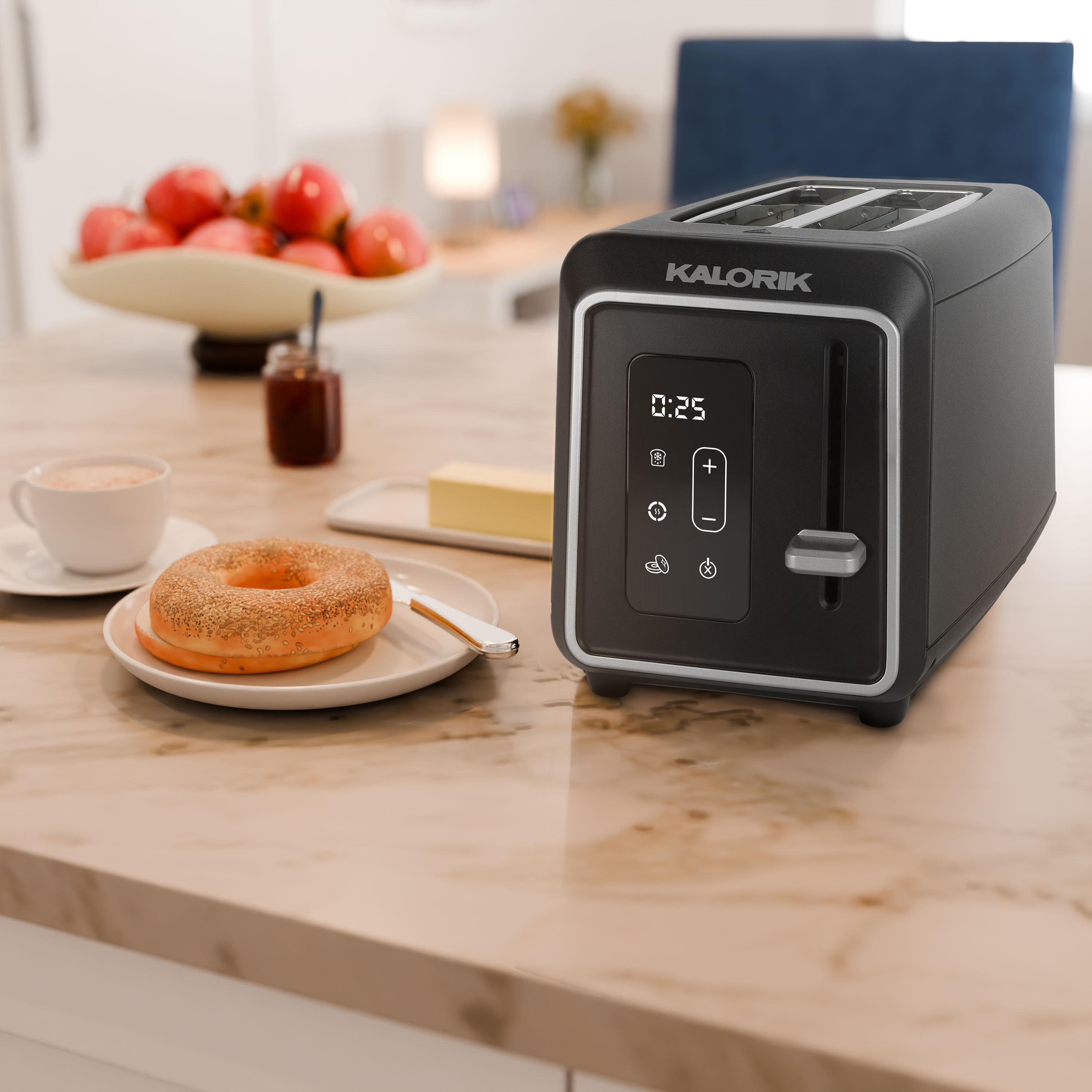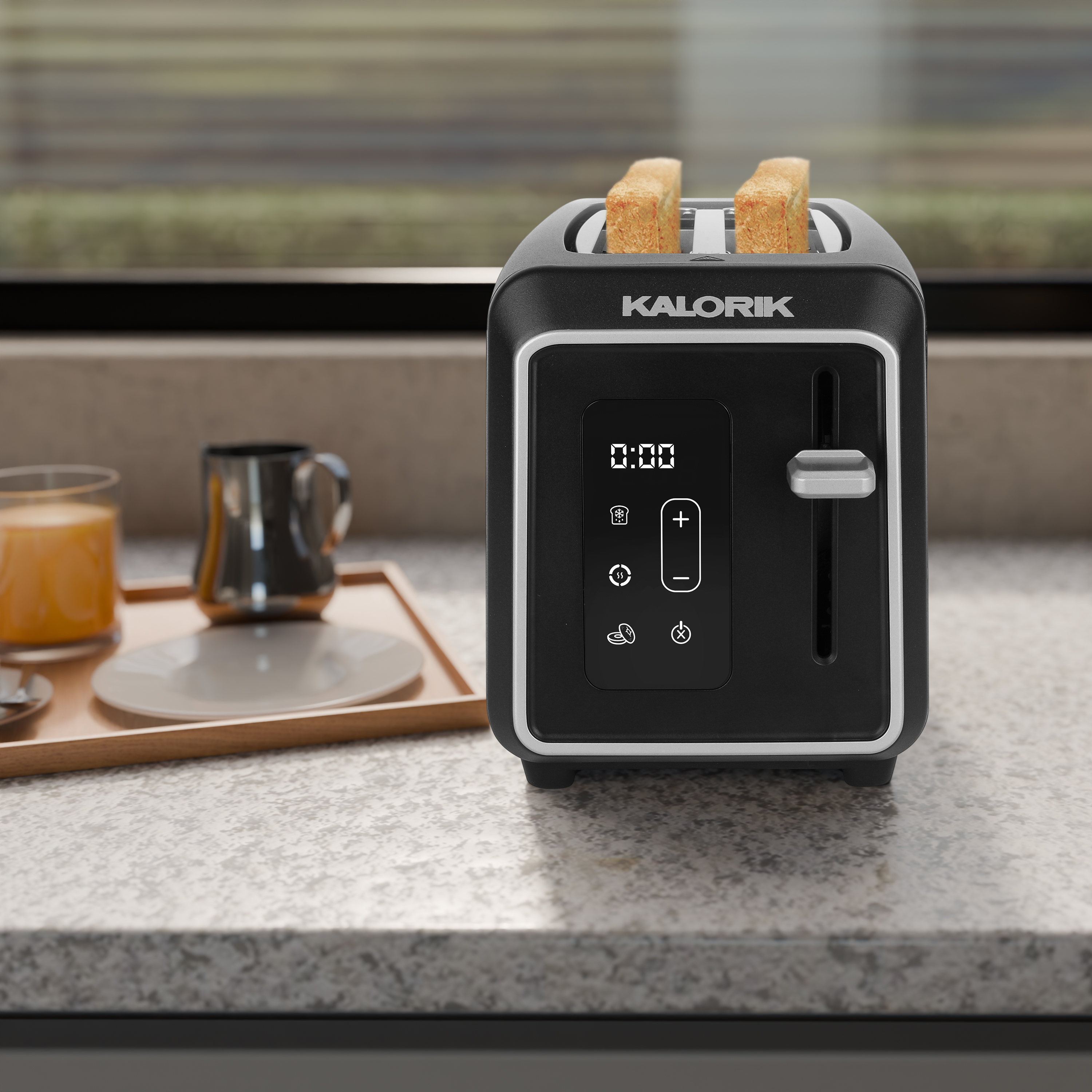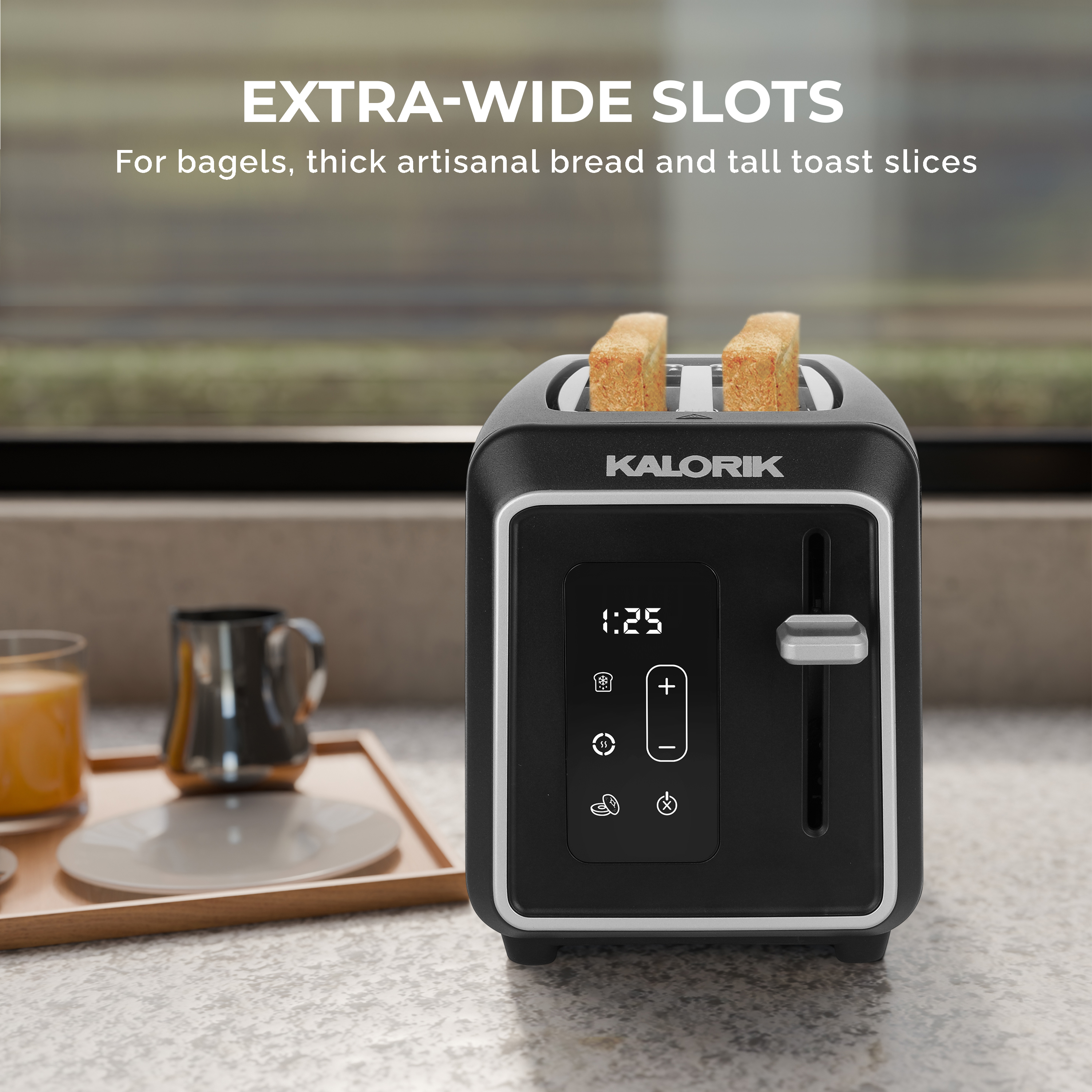 | Long Description | Introducing the Kalorik Designer Series Digital 2-Slice Toaster, where superior cooking meets sleek design. This elegant black toaster with silver accents is not just a stylish addition to your countertop, but multi-functional for various breads and frozen items. With a user-friendly touchscreen LED display and 6 adjustable shade settings, this toaster lets you customize your toast to your preference. The digital countdown timer takes the guesswork out of your morning routine. The extra-wide slots are designed to accommodate a variety of bread types with ease, from thick, hearty slices of artisanal breads to thick-sliced bagels, ensuring that no matter the size or shape, your breakfast options are always perfectly toasted. Never worry about crumbs cluttering your kitchen again with the convenient slide-out crumb tray that makes cleanup effortless. The high-lift lever makes for easy toast retrieval, while the Defrost, Reheat, Bagel, and Cancel functions provide versatility for all your toasting needs. With 850 watts of power, this toaster delivers fast and even browning every time. Designed for convenience, the Kalorik Designer Series Digital 2-Slice Toaster also features a convenient cord wrap to keep your kitchen organized and maximize counter space. Elevate your morning routine with this versatile toaster that combines exceptional culinary performance with everyday practicality. |