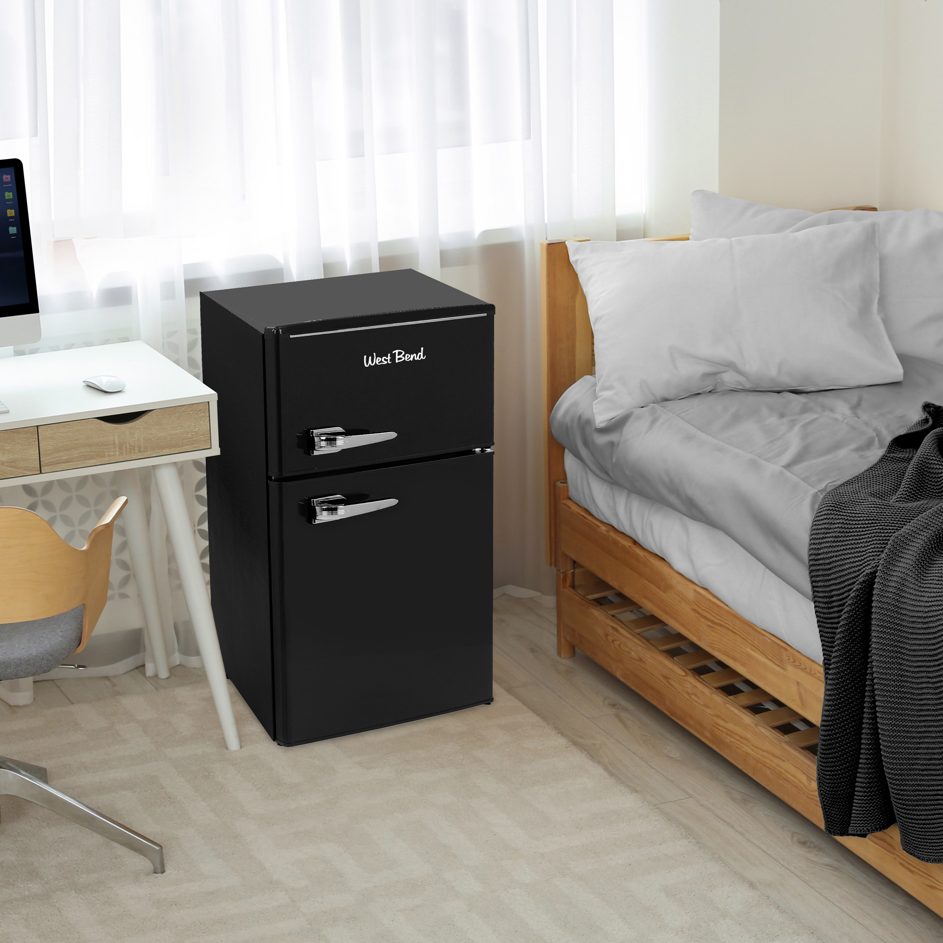 | Long Description | Add a classic look to any space with the West Bend Retro Compact Refrigerator and Freezer in black. The fridge features 2.2 cu. ft. of refrigerator space with a .9 cu. ft. top freezer, for a total of 3.1 cu. ft. capacity. This retro-style refrigerator and freezer is an ideal fit for your home, dorm or office, saving space while keeping your favorite foods and beverages within reach. Built-in door shelves provide plenty of storage, accommodating 2-liter and gallon bottles, 12-ounce cans and assorted condiments. Two adjustable, removable glass shelves allow for easy organizing and viewing of your food. Manual defrost keeps food items fresh and cold. The mechanical temperature control lets you adjust the temperature with the turn of a dial. This retro refrigerator and freezer adds a fun and functional vintage look to any space. Covered by the West Bend 12-Month Limited Warranty. |