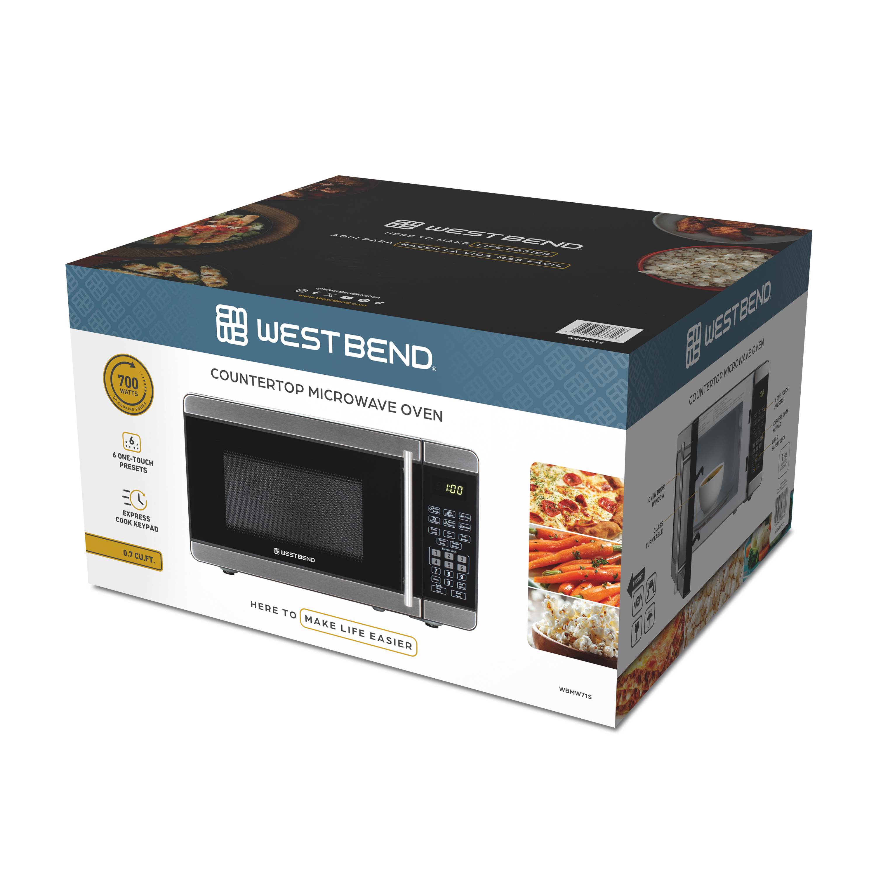 | Long Description | Save counter space with this 0.7 cubic foot microwave oven from West Bend. With its compact footprint, this countertop microwave oven is ideal for the dorm, man cave, office, studio apartment, RV, tiny home, rental room, condo, vacation home or anywhere you need to cook food fast. This small microwave features 700 watts of cooking power, 10 power levels, defrost options and a timer. This microwave has an electronic control panel and one-touch cooking programs with pre-programmed times for favorites like pizza and popcorn. A turntable with a glass tray ensures even heating. You can even easily add 30 seconds of cook time with the press of a button. Defrost meat for a meal, prepare a snack or reheat last night’s leftovers quickly and easily in small spaces with this compact microwave oven from West Bend. |