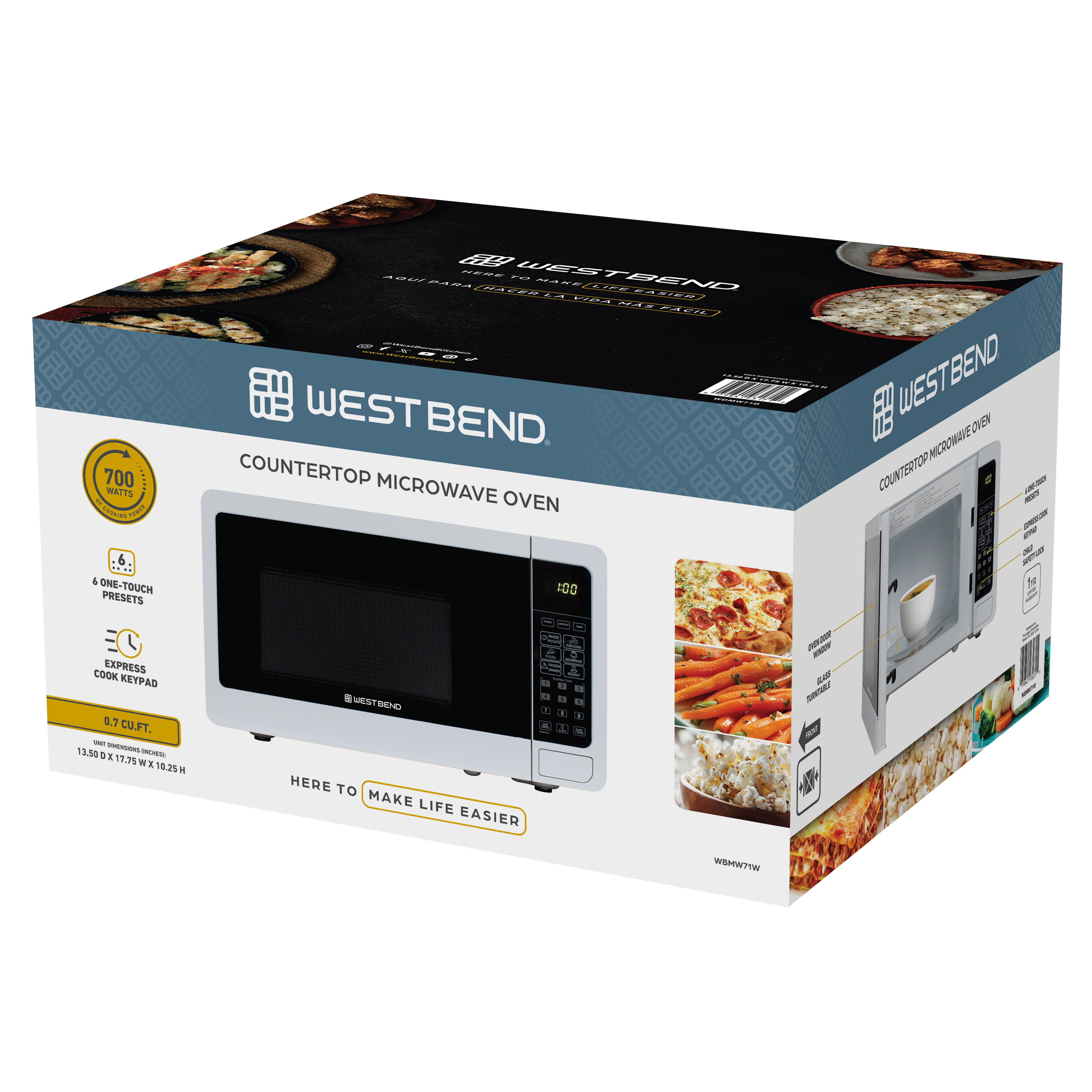 | Long Description | Save counter space with this 0.7 cubic foot microwave oven from West Bend. With its compact footprint, this countertop microwave oven is ideal for the dorm, man cave, office, studio apartment, RV, tiny home, rental room, condo, vacation home or anywhere you need to cook food fast. This small microwave features 700 watts of cooking power, 10 power levels, defrost options and a timer. This microwave has an electronic control panel and one-touch cooking programs with pre-programmed times for favorites like pizza and popcorn. A turntable with a glass tray ensures even heating. You can even easily add 30 seconds of cook time with the press of a button. Defrost meat for a meal, prepare a snack or reheat last night’s leftovers quickly and easily in small spaces with this compact microwave oven from West Bend. |