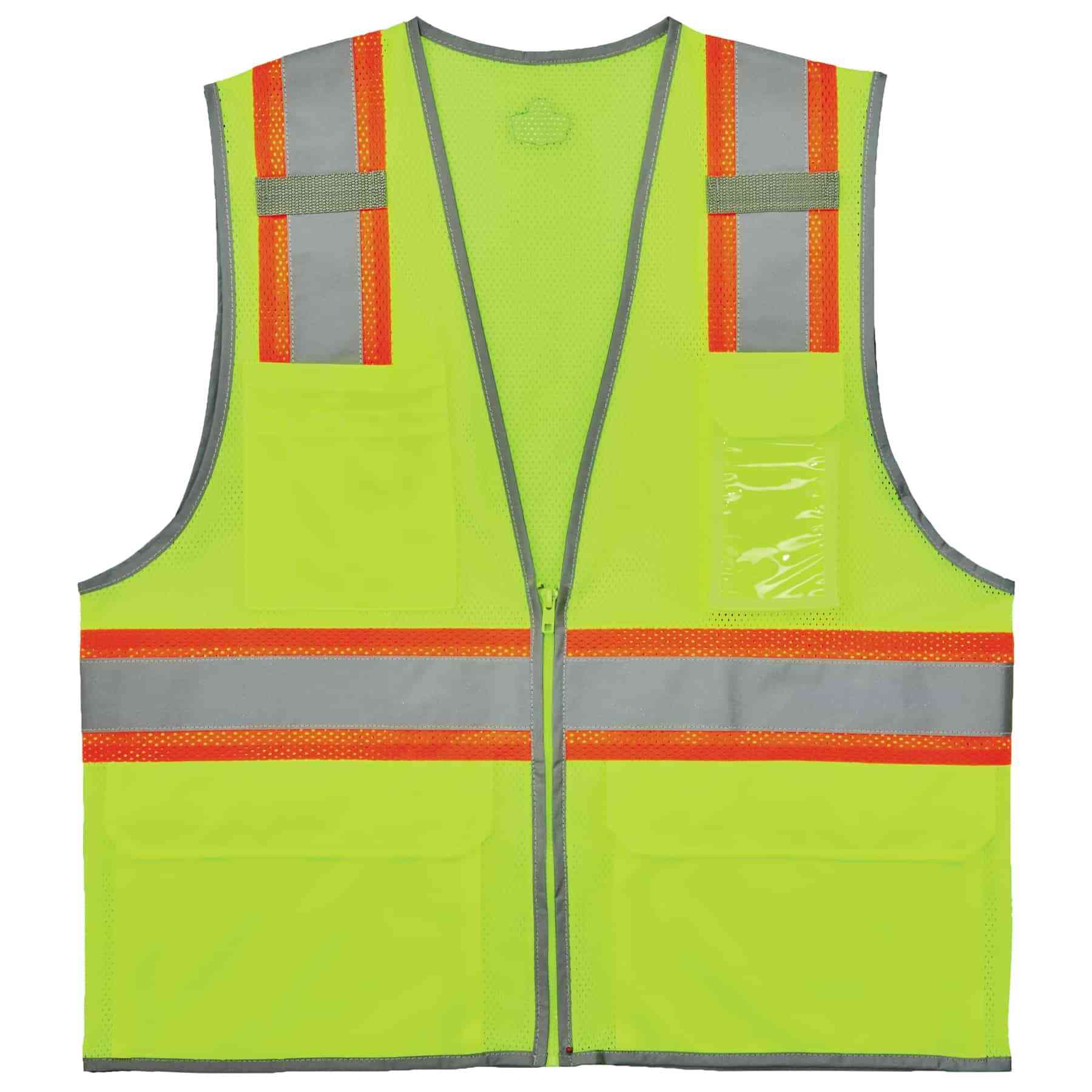 Product Name GloWear 8246Z Two-Tone Mesh Hi-Vis Safety Vest - Type R, Class 2, Zipper, Reflective Binding Product Description The GloWear 8246Z Mesh Two-Tone Hi-Vis Safety Vest is a Type R, Class 2 economy vest made of 3.3oz polyester mesh that meets ANSI/ISEA 107-2020 visibility requirements. This hi-vis vest features 2” reflective tape set on a 3.5” contrasting mesh background and reflective piping for enhanced visibility. Built for storage, this vest has two interior and four exterior pockets, a clear ID badge holder and dual radio mic tabs. A zipper closure makes for easy on and off.