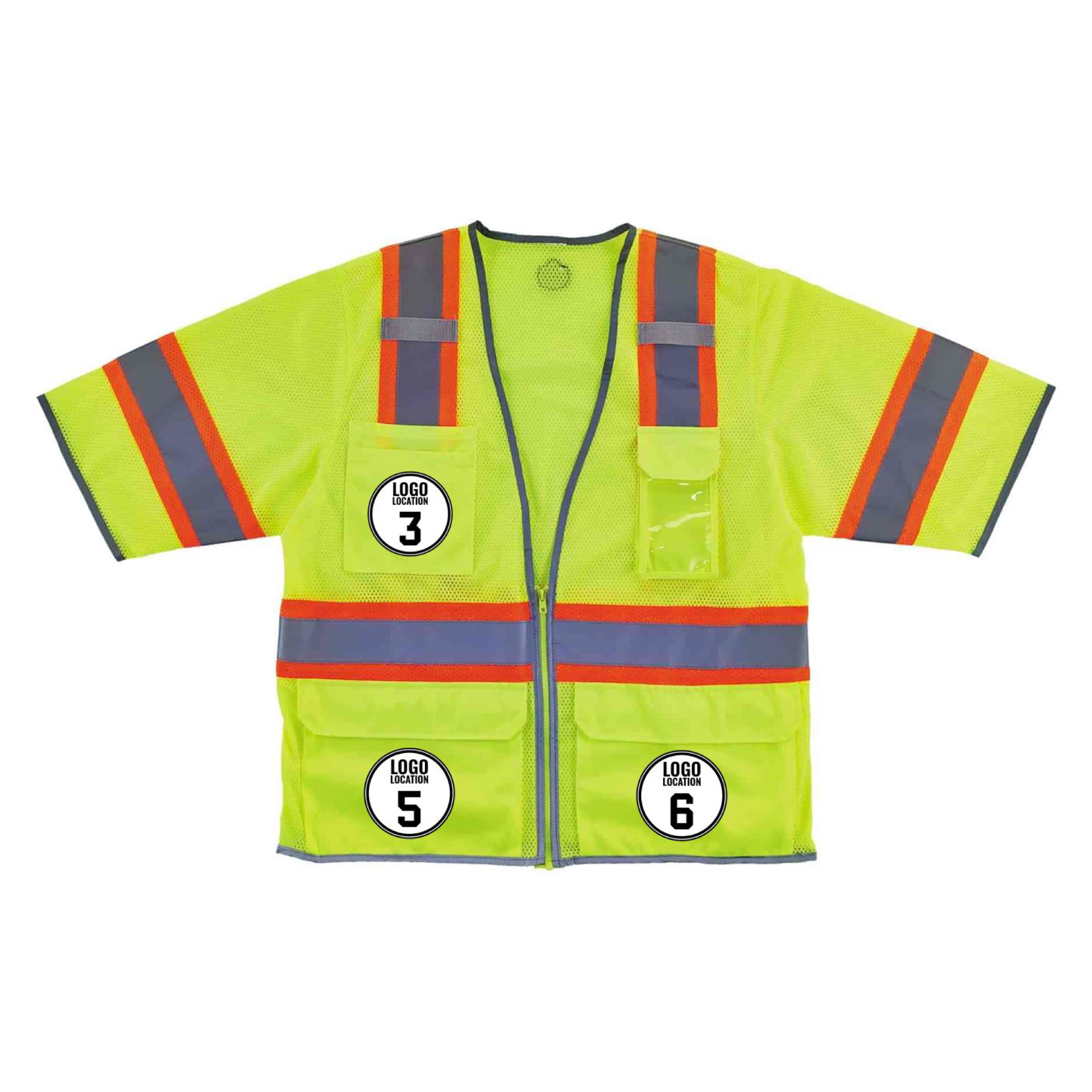 Logo Type Heat Transfer Heat Transfer Lead Time 2 weeks on first time order > 1 week on repeat orders Heat Transfer MOQ 12 Product Name GloWear 8346Z Two-Tone Surveyor Vest - Type R, Class 3, Zipper Product Description The GloWear 8346Z Two-Tone Surveyor Vest is designed for increased visibility in low-light and nighttime conditions with ANSI/ISEA 107-2020, Type R, Class 3 compliant hi-vis fabric. 2” reflective, solid tape is set against a 3.5" contrasting color background, and the edges of the garment are equipped with reflective trim, contributing to the visibility of the vest.
