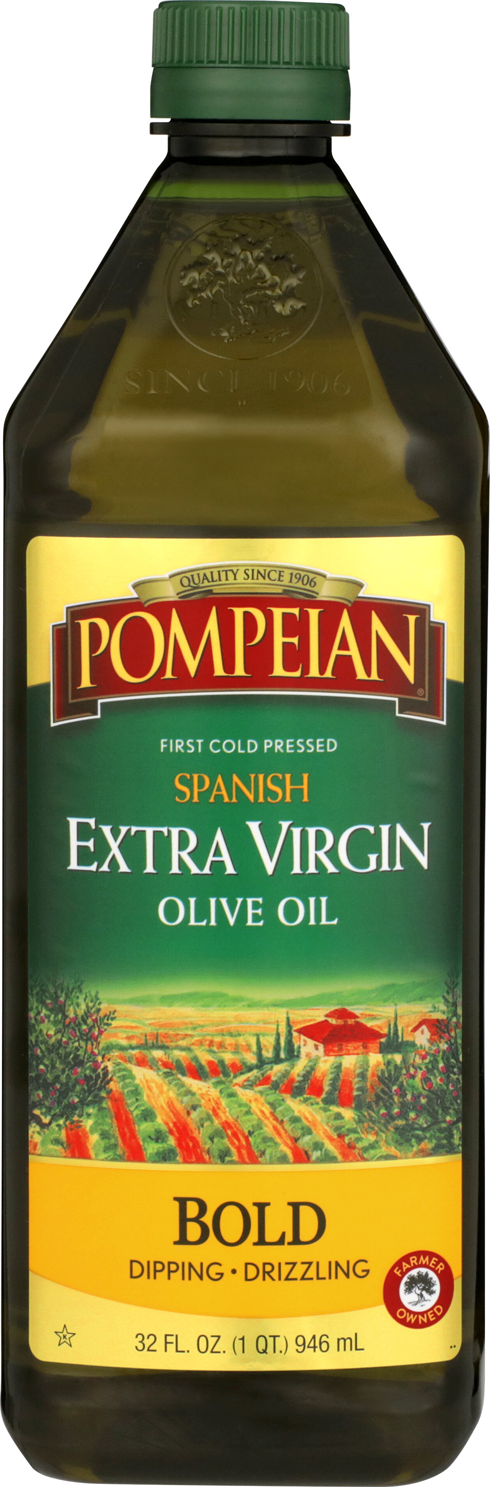 • Long DescriptionExpertly crafted by The Olive Oil People, this 100% Spanish, first cold pressed extra virgin olive oil is authentically crafted by Pompeian’s family of olive farmers and olive oil craftsmen. From start to finish, you can taste the difference in Pompeian olive oils because our olive farmers and olive oil craftsmen have carefully nurtured the world’s best olives from grove to table, creating the best-tasting, highest-quality olive oil. Rooted in authenticity, our olive oils are crafted to help you eat and live well every day. Pompeian Bold Extra Virgin Olive Oil is perfect for dipping and drizzling.