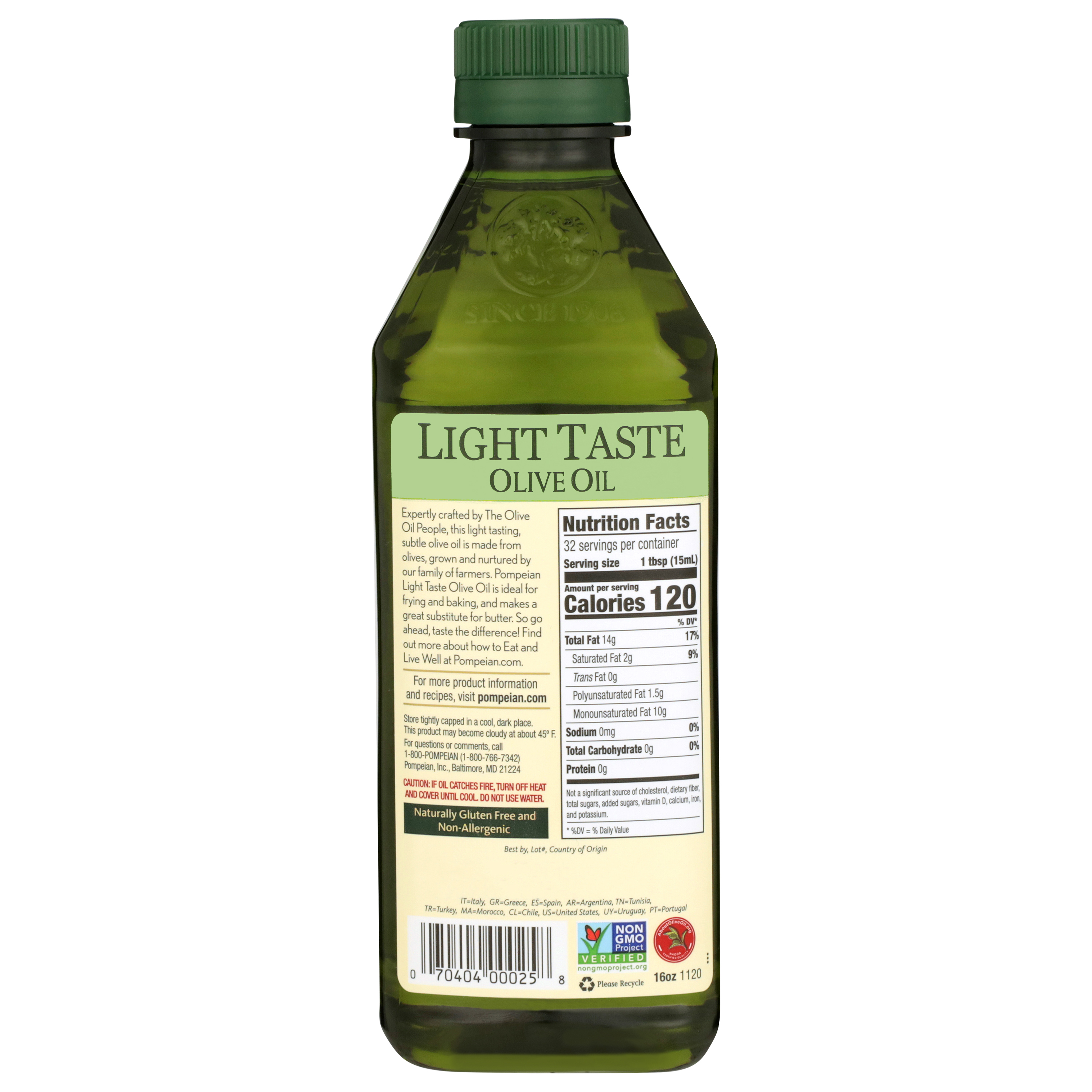 • Long DescriptionExpertly crafted by The Olive Oil People, this light tasting olive oil is authentically crafted by Pompeian’s family of olive farmers and olive oil craftsmen. From start to finish, you can taste the difference in Pompeian olive oils because our olive farmers and olive oil craftsmen have carefully nurtured the world’s best olives from grove to table, creating the best-tasting, highest-quality olive oil. Rooted in authenticity, our olive oils are crafted to help you eat and live well every day. Pompeian Light Taste Olive Oil is perfect for baking and frying.