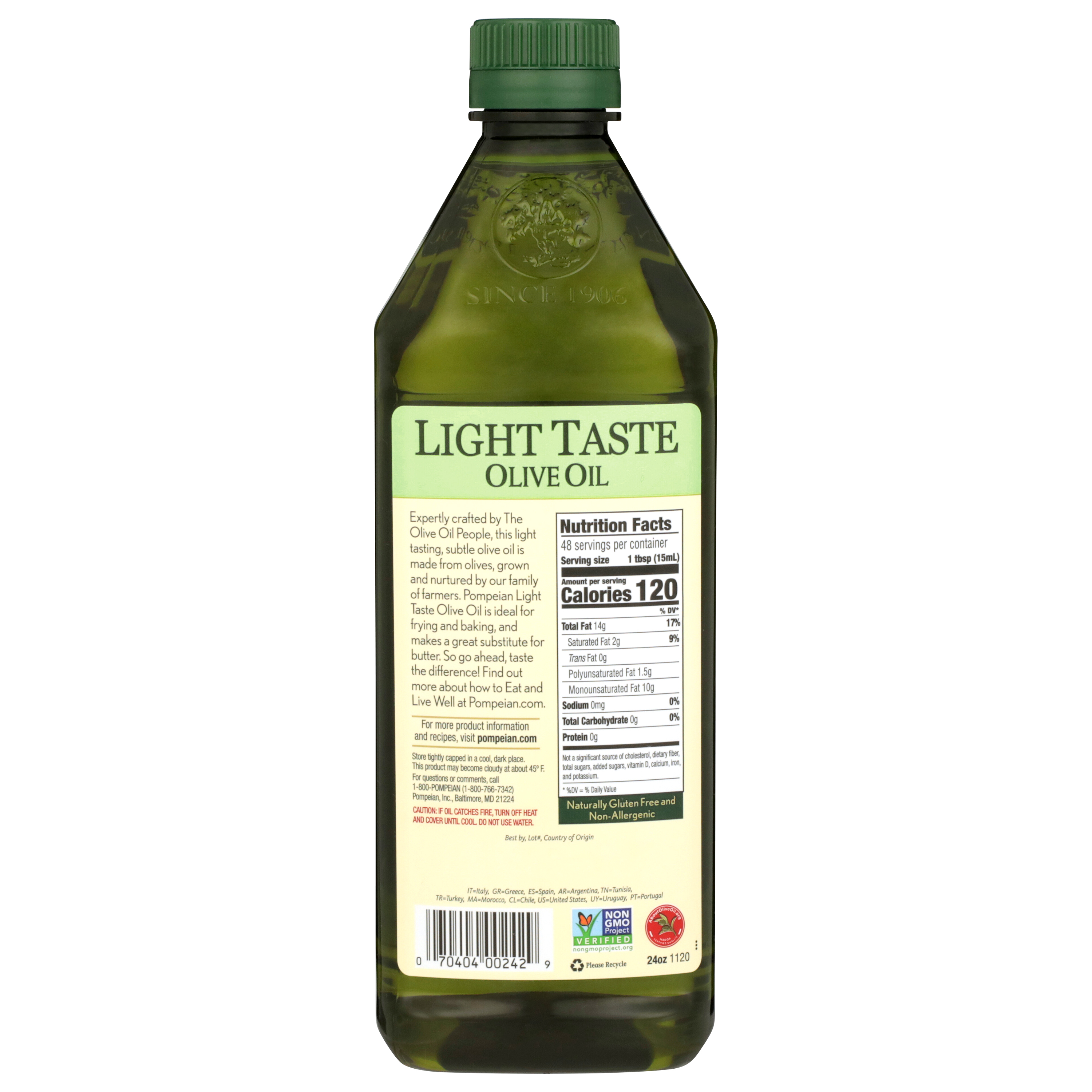 Feature Bullets5COMMITTED TO QUALITY: Pompeian Light Taste Olive Oil is Naturally Gluten Free and Non-Allergenic, Kosher, Non-GMO Verified by the Non-GMO Project and Certified for Authenticity by the North American Olive Oil Association (NAOOA).