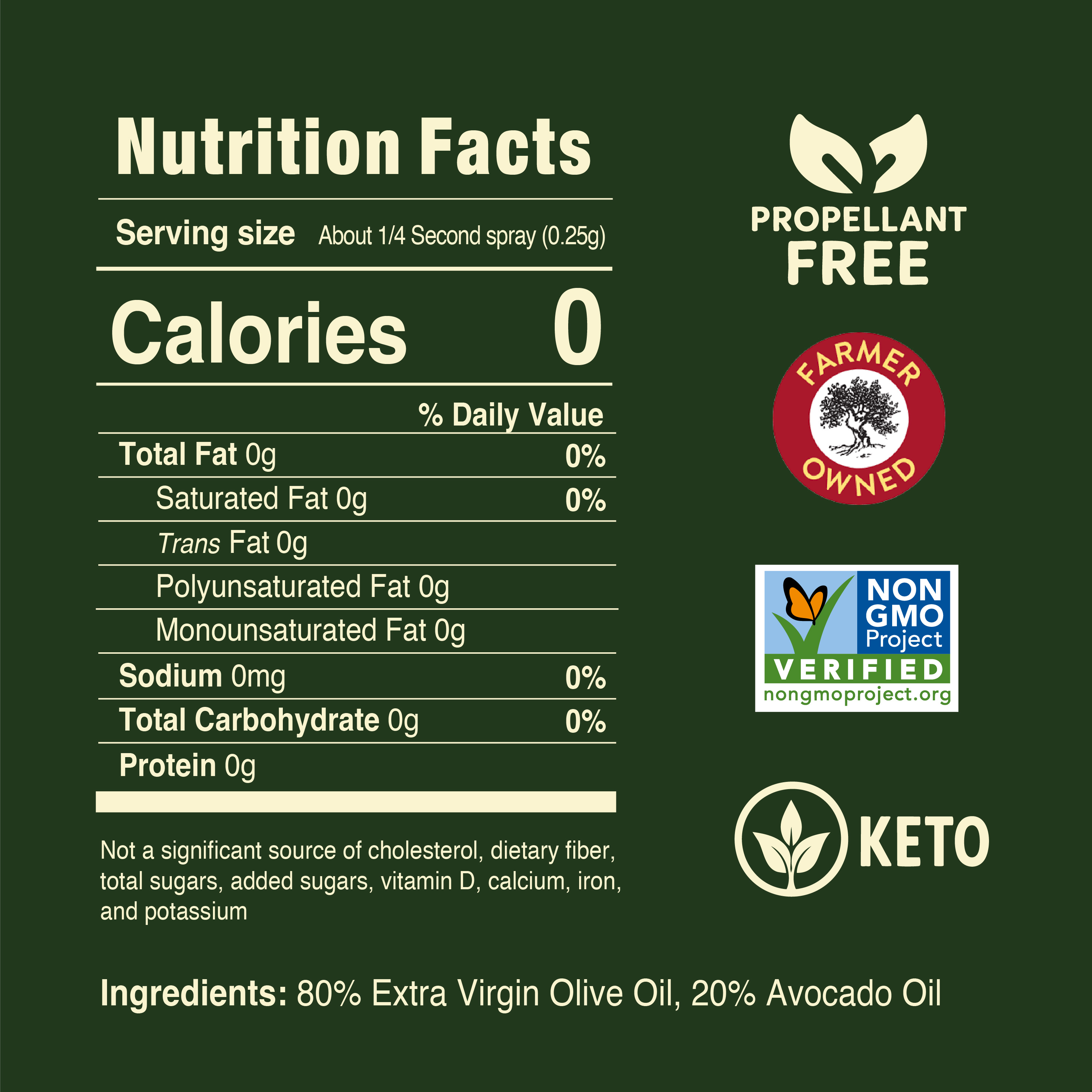 | Feature Bullets2 | BLEND OF EVOO & AVOCADO OIL: This blend of Extra Virgin Olive Oil and 100% Avocado Oil Cooking Spray contains only two ingredients and is keto-friendly |