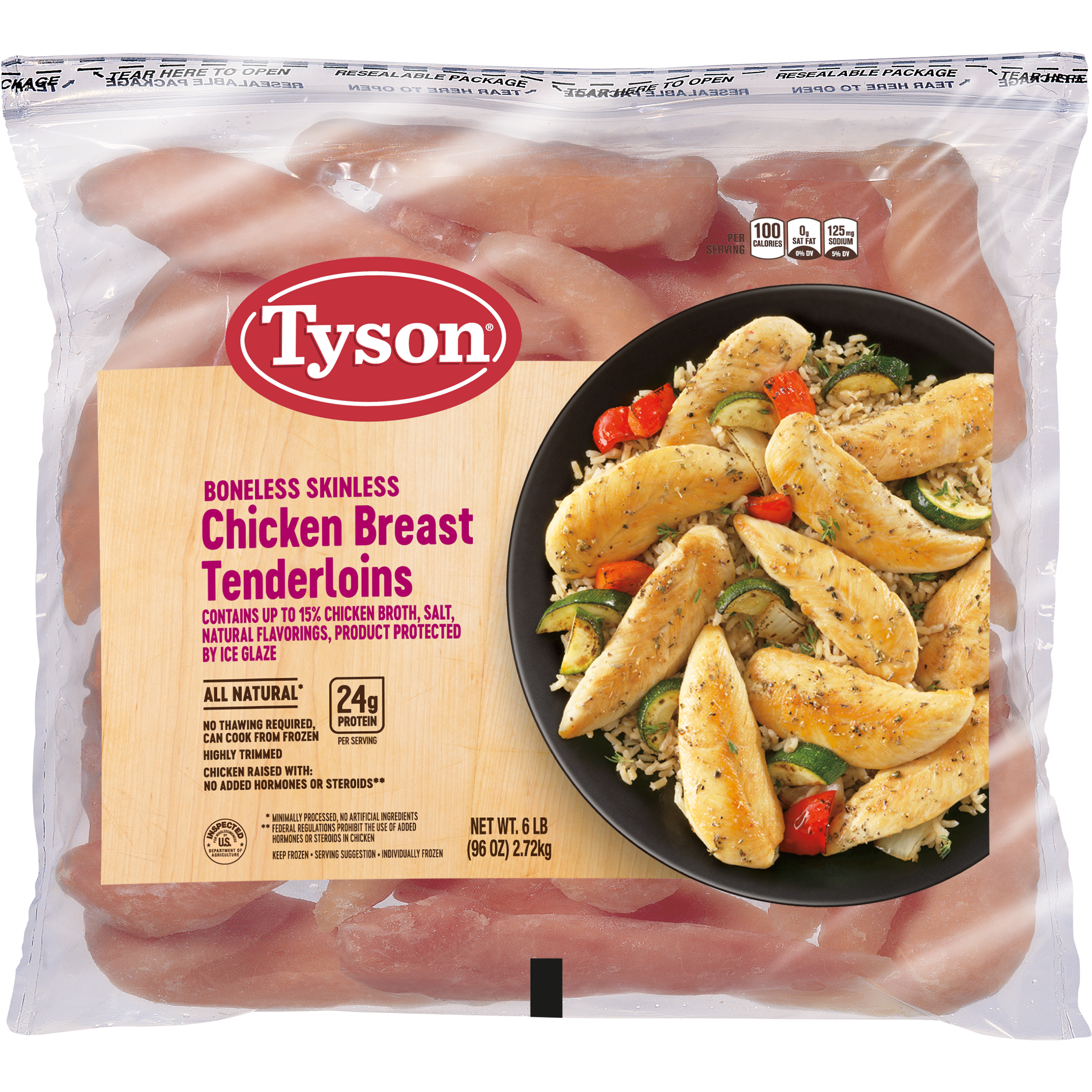 | Retail eCommerce Marketing Message | There's nothing like cooking from scratch, especially when you start with Tyson Individually Frozen Boneless Skinless Chicken Breast Tenderloins. Our all-natural* chicken is juicy and tender with 24 grams of protein and 0 grams of trans fat per serving. Perfect for grilling and frying, simply cook and serve our chicken breast tenderloins with Teriyaki sauce for a quick and delicious weeknight dinner. Includes one 6 lb package of individually frozen chicken. Everything seems to turn out a whole lot better when you just keep it simple. No nonsense. Just stick to the good stuff. The 100% real stuff that makes life, and chicken, great. Keep it real. Keep it Tyson. *Minimally processed, no artificial ingredients. |