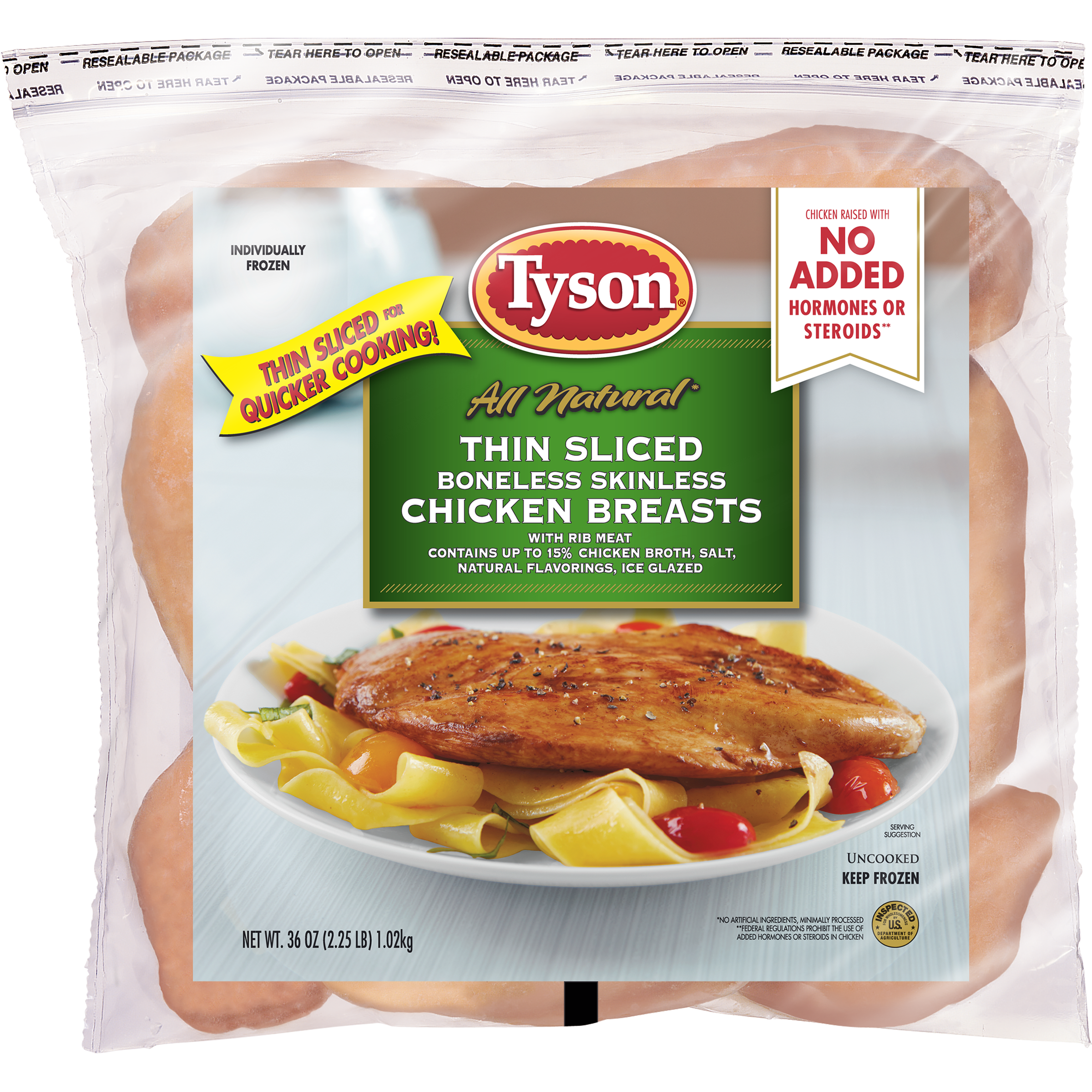 | Retail eCommerce Marketing Message | There's nothing like cooking from scratch, especially when you start with Tyson Individually Frozen Thin Sliced Boneless Skinless Chicken Breasts. Our all-natural* chicken is juicy and tender with 21 grams of protein and 0 grams of trans fat per serving. Perfect for grilling and roasting, simply cook and serve our boneless chicken breasts with BBQ sauce for a quick and delicious weeknight dinner. Includes one 2.25 lb package of individually frozen chicken. Everything seems to turn out a whole lot better when you just keep it simple. No nonsense. Just stick to the good stuff. The 100% real stuff that makes life, and chicken, great. . Keep it real. Keep it Tyson. *Minimally processed, no artificial ingredients. |