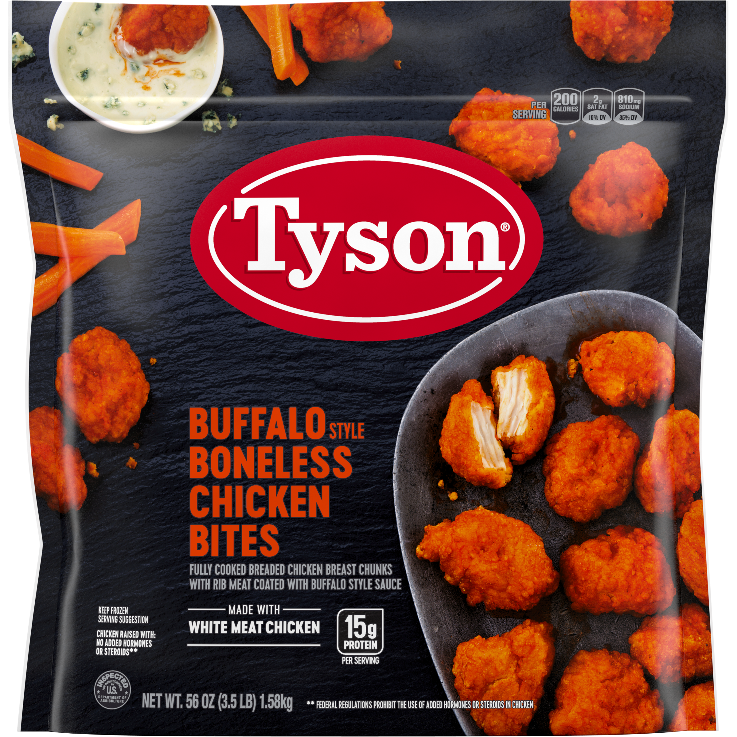 | Retail eCommerce Marketing Message | Bring on the Buffalo. Tyson Any'tizers Frozen Buffalo Style Boneless Chicken Bites are the perfect way to spice up your day. Our fully cooked boneless bites are made with 100% all natural* white meat chicken and are breaded for a satisfying crunch. Glazed in a spicy Buffalo style sauce, our breaded chicken bites are a flavorful snack that is easy to make and enjoy. Whether eaten as an appetizer or as part of your meal, our Buffalo chicken bites have no added hormones or steroids** and have 12g of protein per serving. Keep our breaded white meat nugget bites frozen until ready to prepare, then heat in an air fryer or oven according to the instructions on the pack for warm and tasty Tyson Any'tizers Buffalo Style Boneless Bites. *Minimally processed, no artificial ingredients **Federal regulations prohibit the use of added hormones or steroids in chicken |