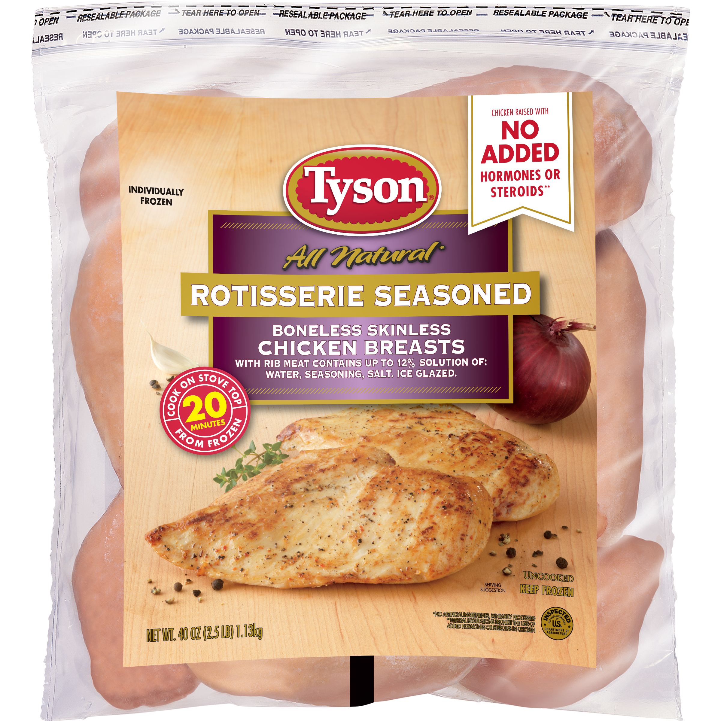 | Retail eCommerce Marketing Message | Set your next home cooked meal up for success with delicious and juicy Tyson Frozen Rotisserie Seasoned Chicken Breasts. These all natural* boneless, skinless chicken breasts come from chicken raised with no added hormones or steroids,** providing 22 grams of protein per serving. Easy to prepare in an oven or on a stove top, these raw chicken breasts cook from frozen in under 20 minutes, already covered in rotisserie seasonings for the ultimate short notice entree that has that savory, roasted, rotiserrie flavor everyone loves. For a flavorful family meal, cook in a skillet and serve with sides of sweet potatoes and sauteed vegetables. Includes one 40 oz (2.5 lb) package of all natural* frozen chicken breasts. *No artificial ingredients, minimally processed **Federal regulations prohibit the use of added hormones or steroids in chicken |