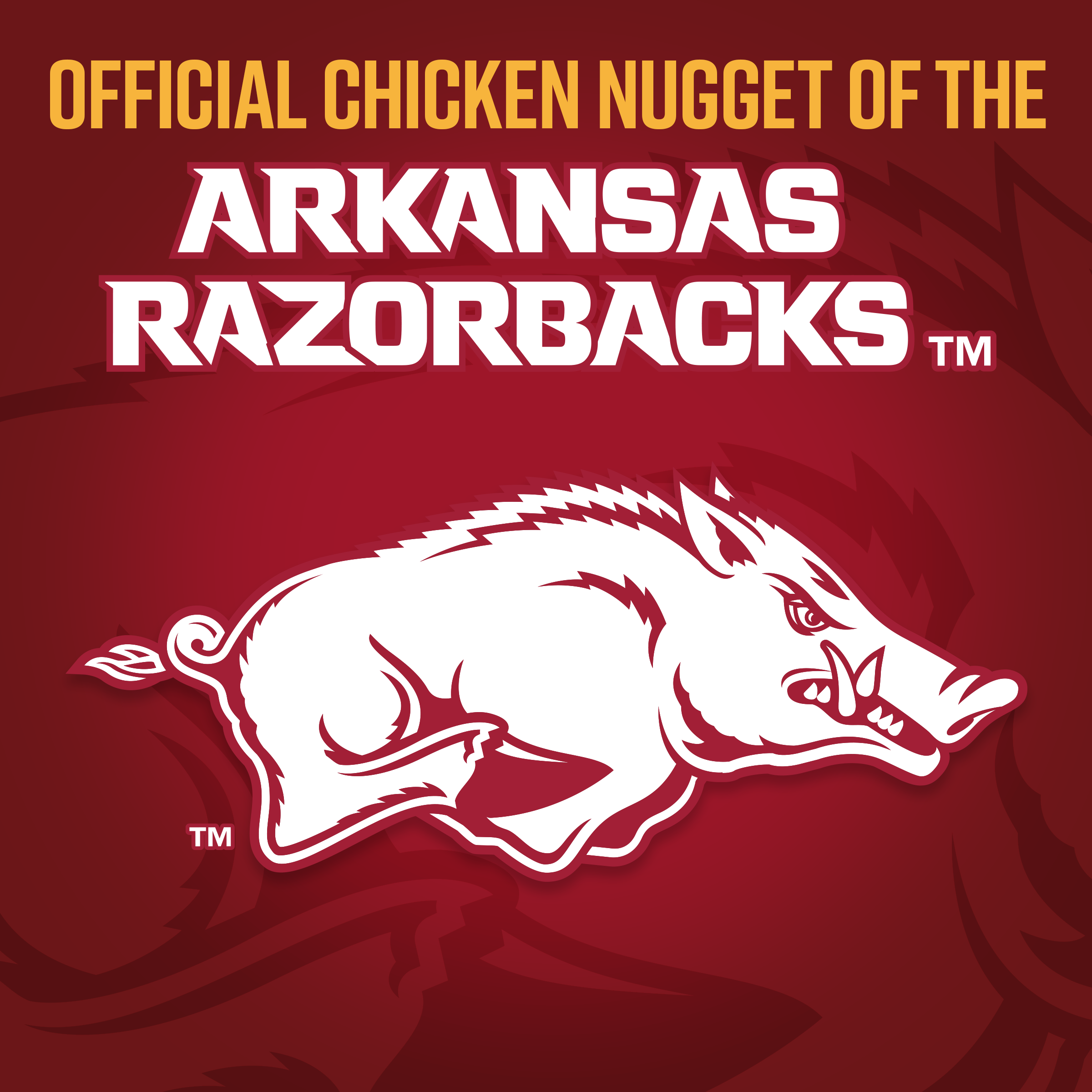 | Retail eCommerce Marketing Message | Whether it's a game day or just a day to show off your Arkansas Razorback spirit, nothing compares to our Tyson Razorback Nuggets. Chow down on tasty breaded chicken in the shape of the iconic running Razorback hog at home, tailgates or just for a snack. Score big with flavor and team pride with our chicken nuggets as a winning addition. Our nuggets are pre-cooked and can be easily heated in a microwave, air fryer or oven until they get warm and crispy. With 20 servings per bag and 13g of protein, you can dip them in ketchup and sauces or eat them plain, but most importantly, serve them up with spirit. It's game time - "Let's Call Those Hogs" Wooo Pig Sooie |