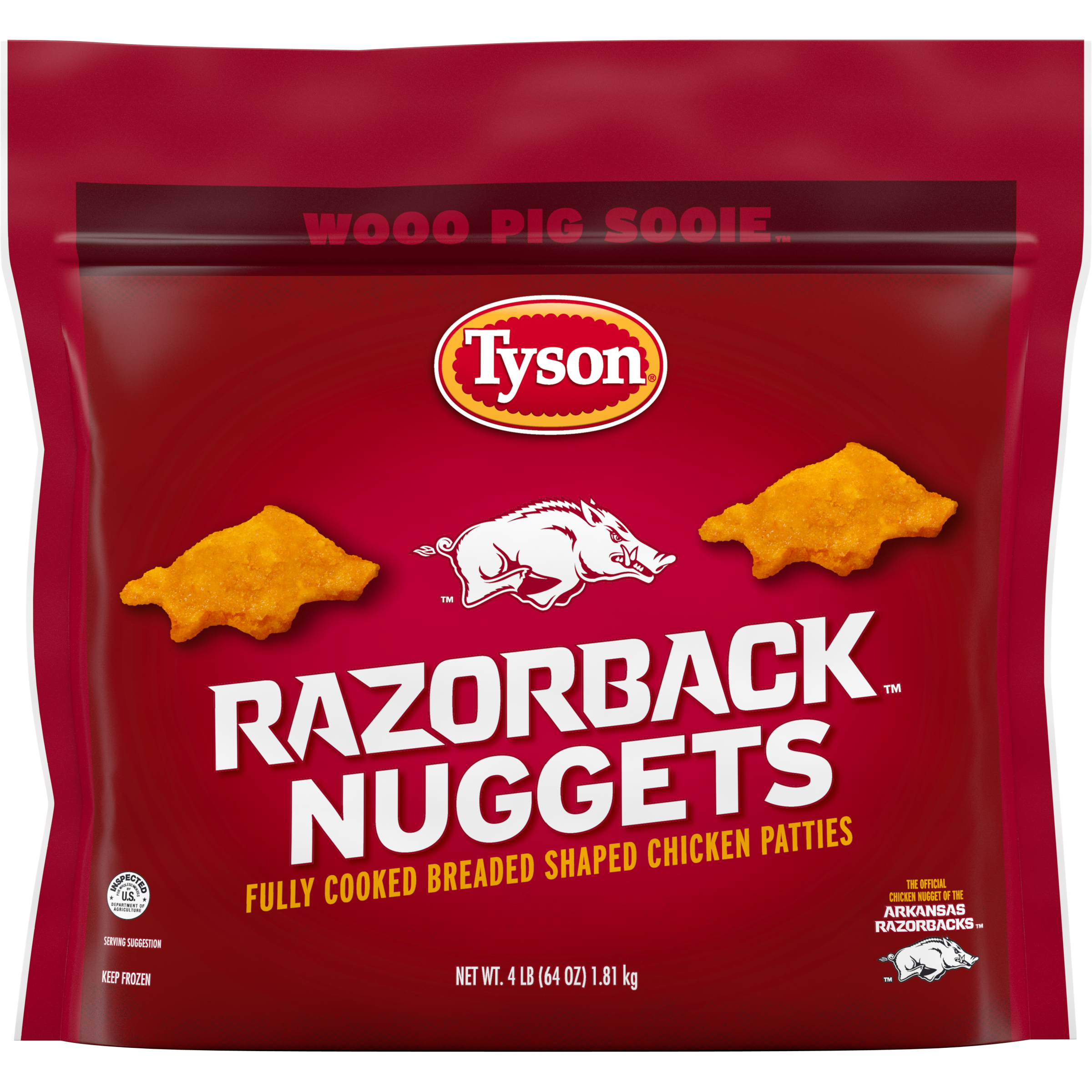 | Catalog Keywords | chicken nugget, chicken, frozen chicken nuggets, tailgating food, air fryer, tyson chicken nuggets, white meat chicken, breaded chicken, tyson white meat chicken, running razorback, tyson razorback chicken nuggets, arkansas, arkansas razorbacks, team pride, wooo pig sooie, game day, pre-cooked, resealable bag, 4lbs, bulk, easy, crispy, protein, white meat chicken nuggets |
