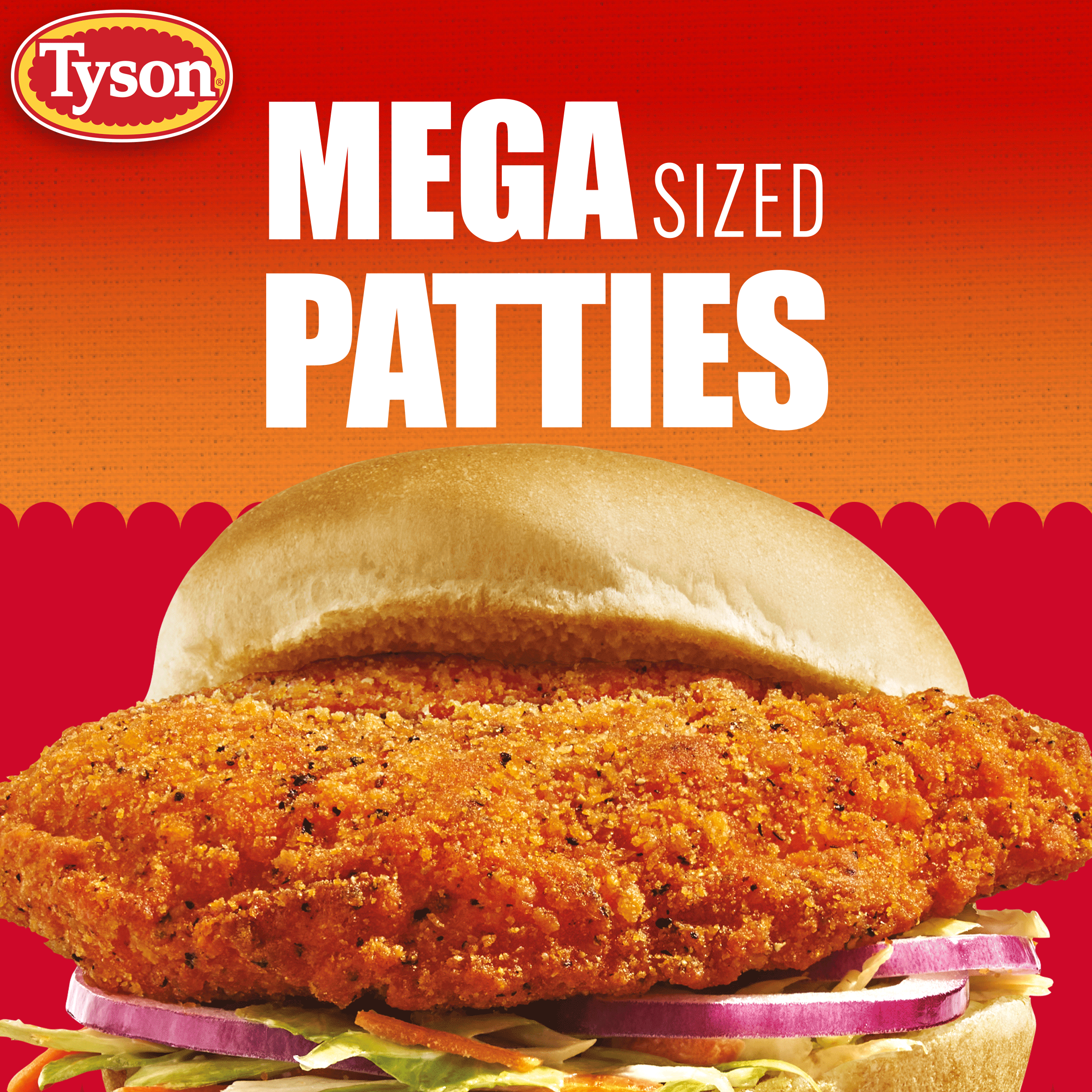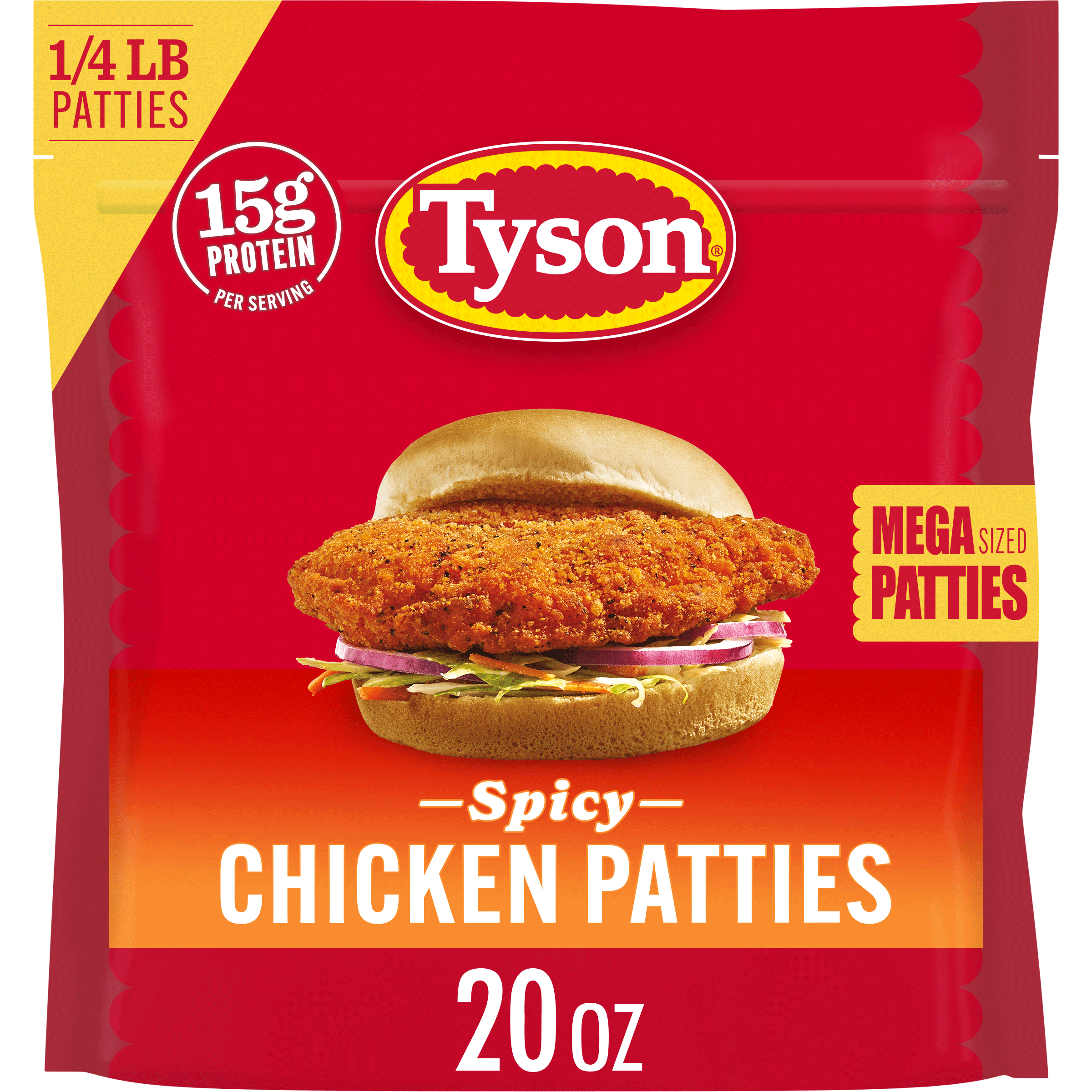 | Retail eCommerce Marketing Message | Upgrade mealtime favorites with Tyson Spicy Mega Chicken Patties. Each 20 oz bag is packed with mega-sized, quarter-pound patties, each offering a bold kick of spicy flavor that's sure to delight taste buds. Perfectly crispy and crafted from 100% all-natural* white meat chicken. Each chicken patty has 15g of protein. Plus, feel good about serving them to the family since they're made without any added hormones or steroids**. Whether crafting the ultimate spicy chicken sandwich or serving them as a mouth-watering main dish, these patties are versatile and easy to prepare in an air fryer, oven, or microwave. Keep them stashed in the freezer and always be ready to whip up a satisfying meal that's as nutritious as it is delicious. Try Tyson Spicy Mega Chicken Patties today and turn up the heat on the mealtime routine! *Minimally processed. No artificial ingredients. **Federal regulations prohibit the use of added hormones or steroids in chicken. |