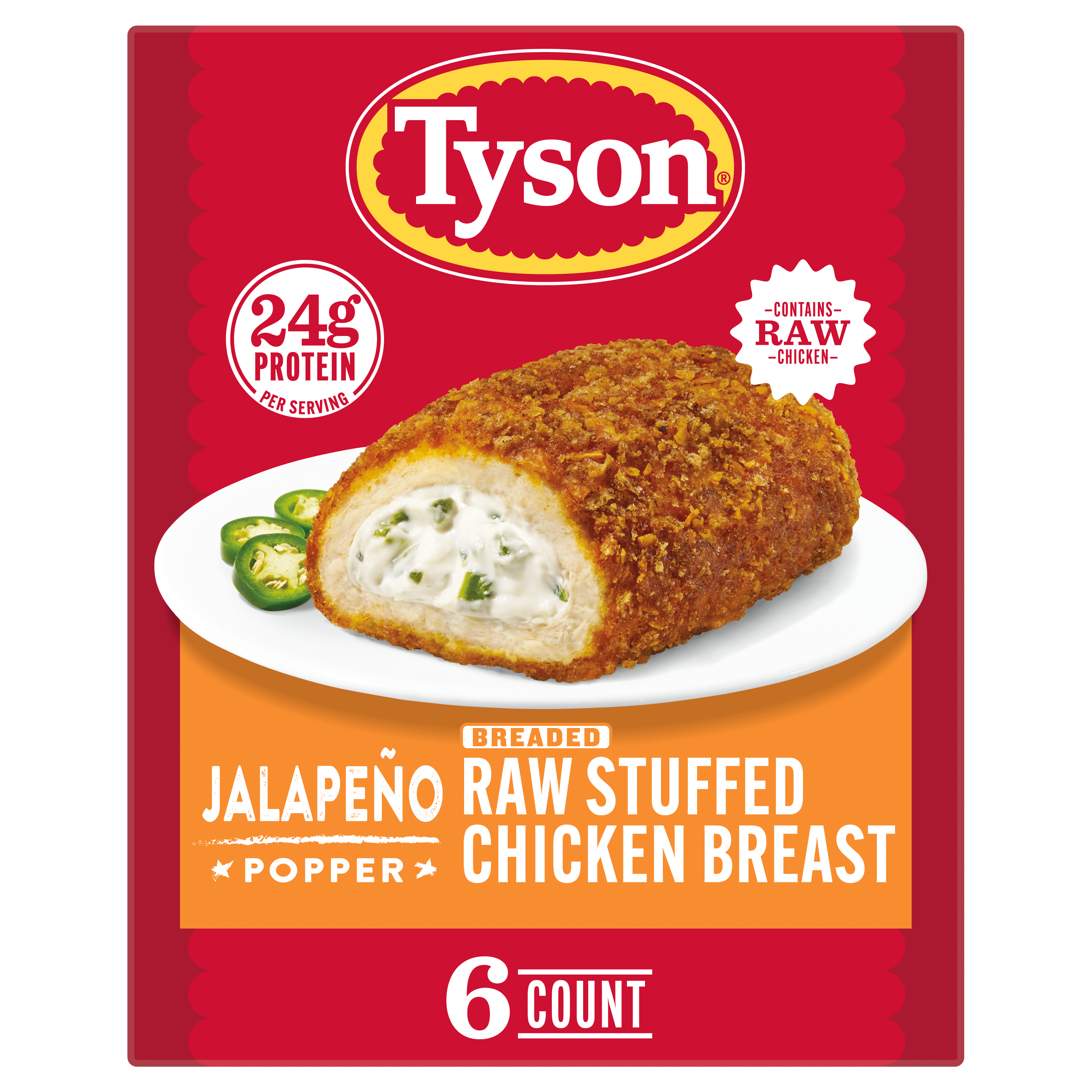 | Retail eCommerce Marketing Message | Tyson Jalapeño Popper Breaded and Stuffed Raw Chicken Breast, 6 Frozen Entrees, 36 oz, offers a premium twist on a bold favorite. Each pack includes six individually wrapped entrées made from 100% All Natural* white meat chicken breast with rib meat, raised with no antibiotics ever. Every entrée is stuffed with a creamy blend of cream cheese, cheddar, and jalapeño peppers, then coated in golden, seasoned tortilla chips for a crunchy, flavorful finish. Each serving provides 24g of protein, offering satisfying portions that elevate everyday meals with ease.