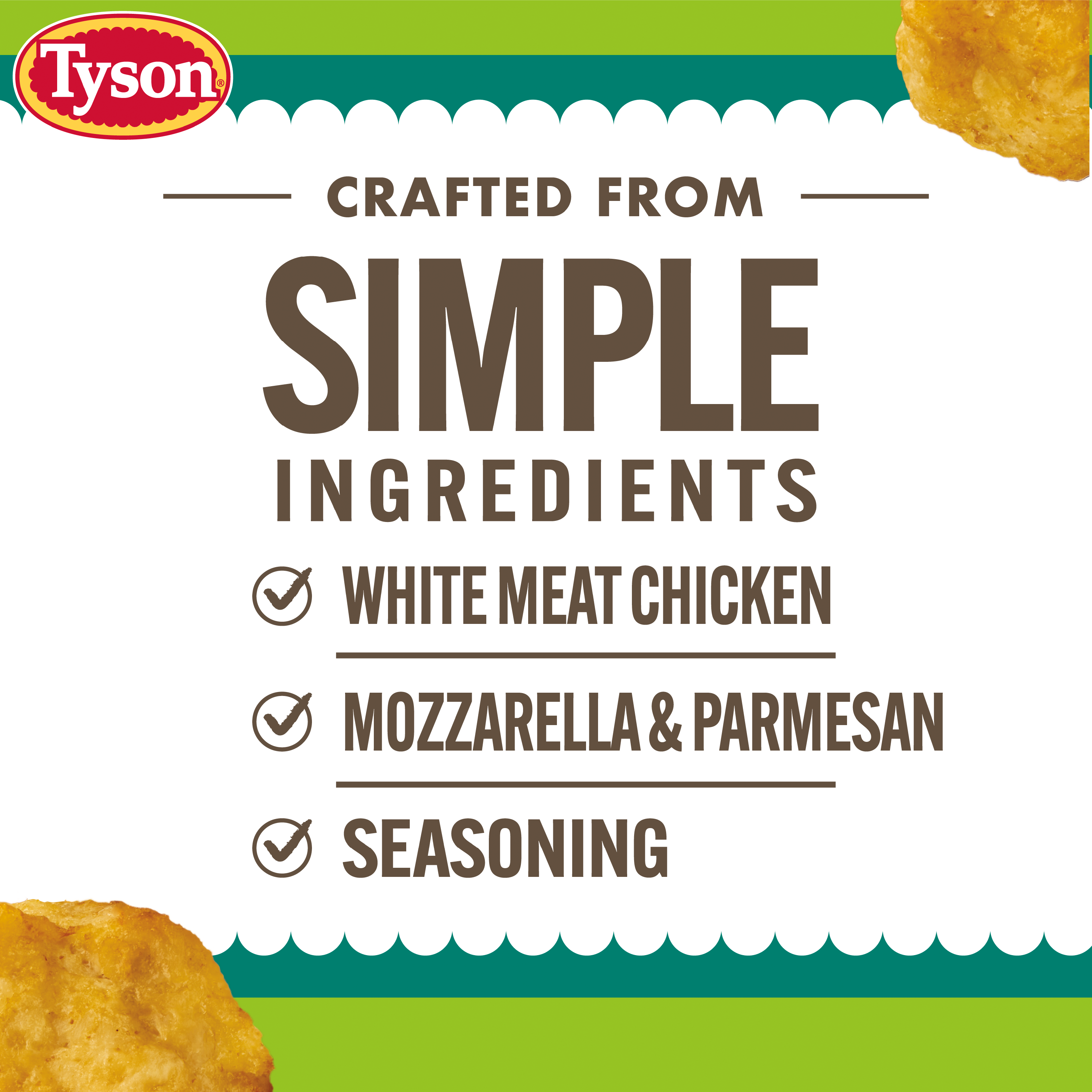 | Catalog Keywords | Tyson High Protein Chicken Nuggets, tyson, chicken nuggets, tyson chicken nuggets, high protein, high protein chicken nuggets, all natural white meat chicken, all natural, white meat, white meat chicken, fully cooked, white meat chicken patties, cheese, seasoning, gluten free, gluten free chicken nuggets, snack, meal, frozen, frozen chicken nuggets, no added sugar, air fryer, no artificial ingredients, dipping, snacking |
