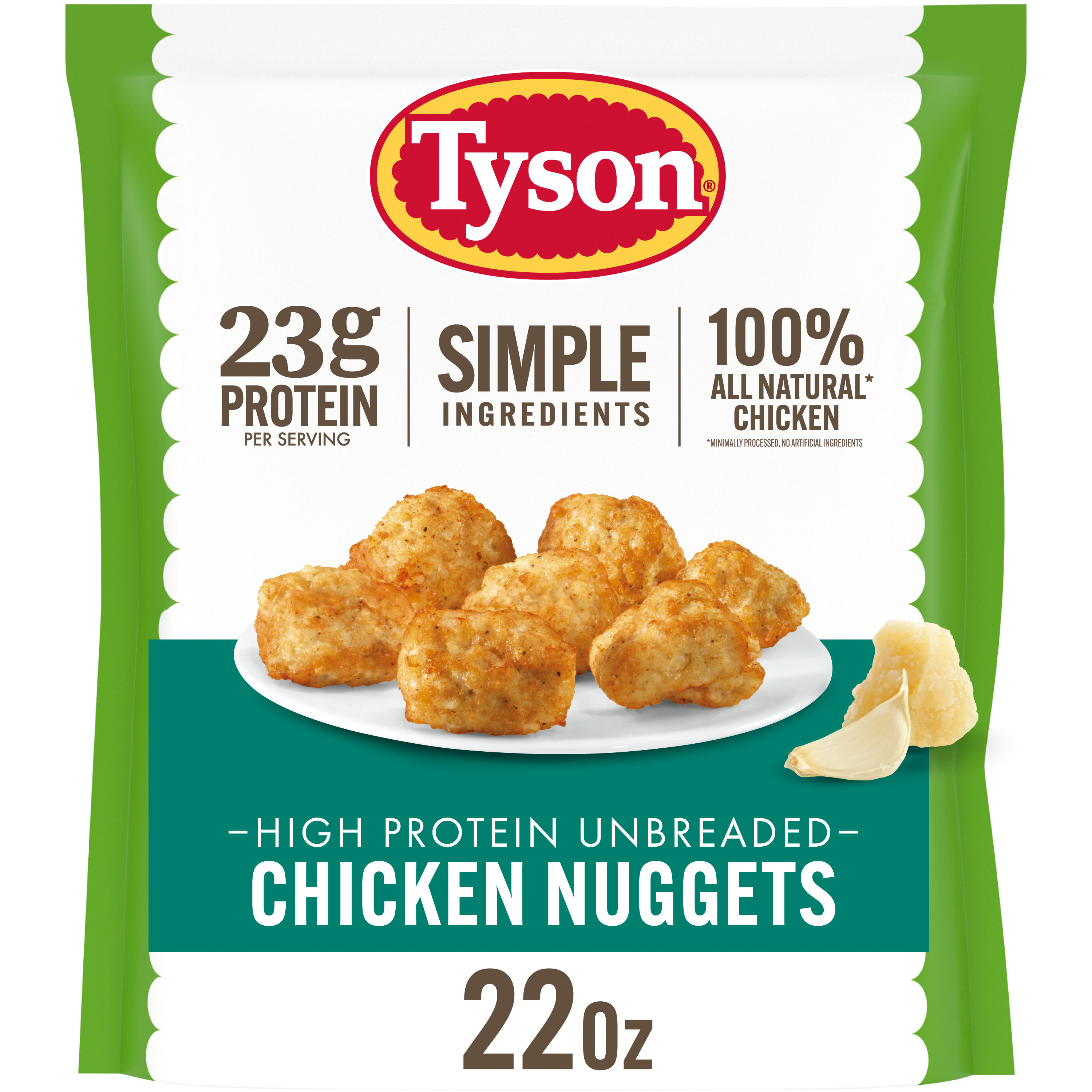 | Retail eCommerce Marketing Message | Looking for a delicious chicken nugget that's packed with protein? Made with 100% all-natural* white meat chicken, Tyson High Protein Unbreaded Simple Ingredients Chicken Nuggets contain 23 grams of protein per serving. Crafted from simple ingredients, our fully cooked shaped white meat chicken patties with cheese and seasoning are great for snacking, dipping, adding to salads and more. Made with no sugar added, our tasty high-protein chicken nuggets are gluten-free and contain 1g total carbs per serving. Keep our nuggets frozen until you're ready to prepare as part of a meal that's both quick and satisfying. Ready in just minutes, you can cook our nuggets in an air fryer, oven or microwave, giving you flexibility and convenience without sacrificing taste. Grab a 22-ounce bag of our Tyson High Protein Unbreaded Simple Ingredients Chicken Nuggets and fuel your day deliciously. *Minimally processed, no artificial ingredients **Not a low calorie food, see nutrition panel for sugar and calorie content |