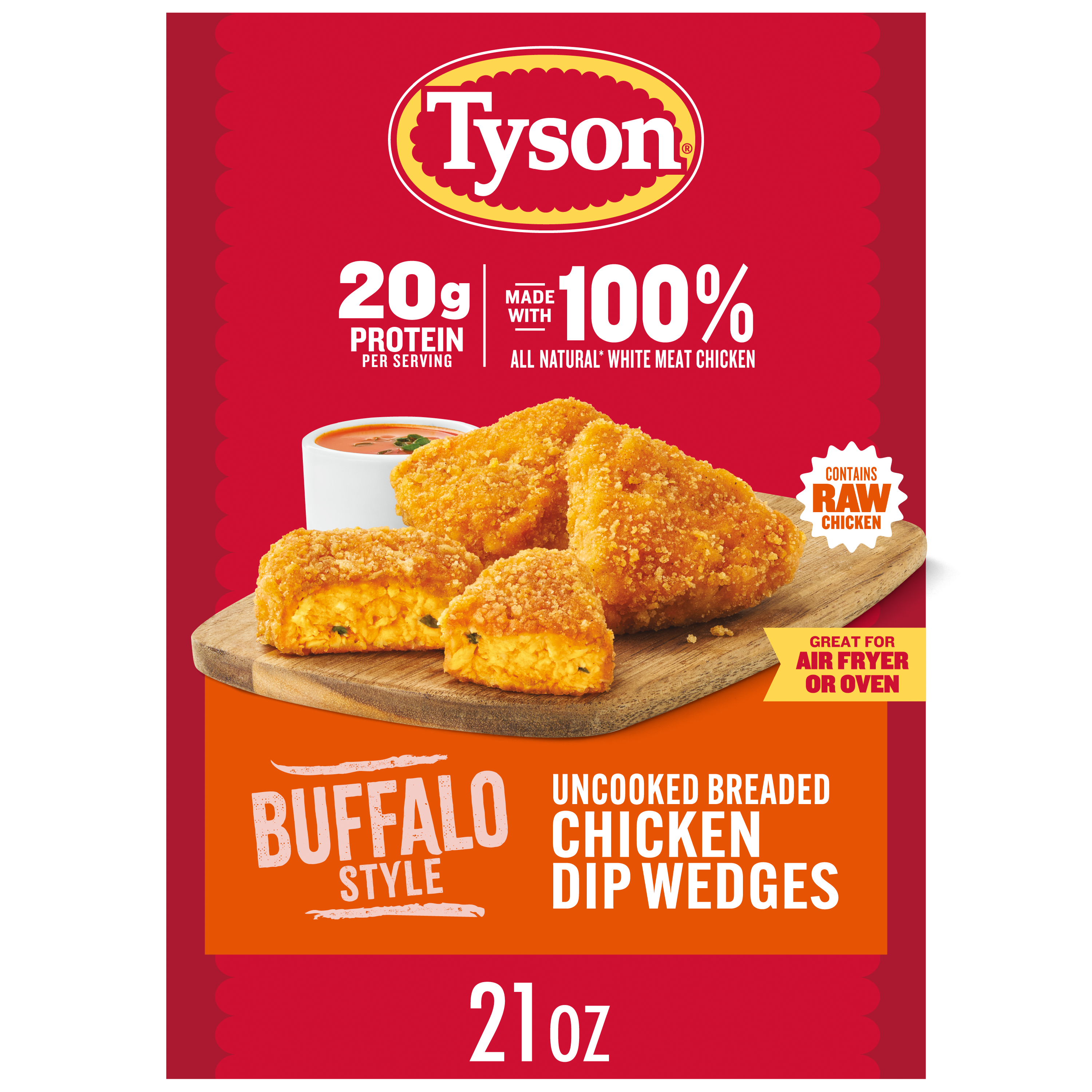 | Retail eCommerce Marketing Message | Tyson® Buffalo Style Uncooked, Breaded Chicken Dip Wedges, 21 oz, deliver bold, craveable snacking. Made with 100% All Natural* white meat chicken raised with no added hormones or steroids**, crafted into shaped, breaded patties. Every wedge features a creamy blend of provolone cheese and buffalo style seasoning inside a golden, crispy coating, offering 20g of protein per 3-piece serving. Perfect for busy parents, college students in dorms, party hosts, and sports enthusiasts. Cook straight from frozen, no prep required. Air fry at 390°F for 13 minutes or oven-bake at 375°F for 22 minutes, heating to a minimum internal temperature of 165°F. Do not microwave and do not stack while cooking. Ideal for home kitchens, Sunday football, holiday parties, or late-night snacking, they pair easily with dips, sauces, fries, or sides. *Minimally processed, no artificial ingredients. **Federal regulations prohibit the use of added hormones or steroids in chicken. |