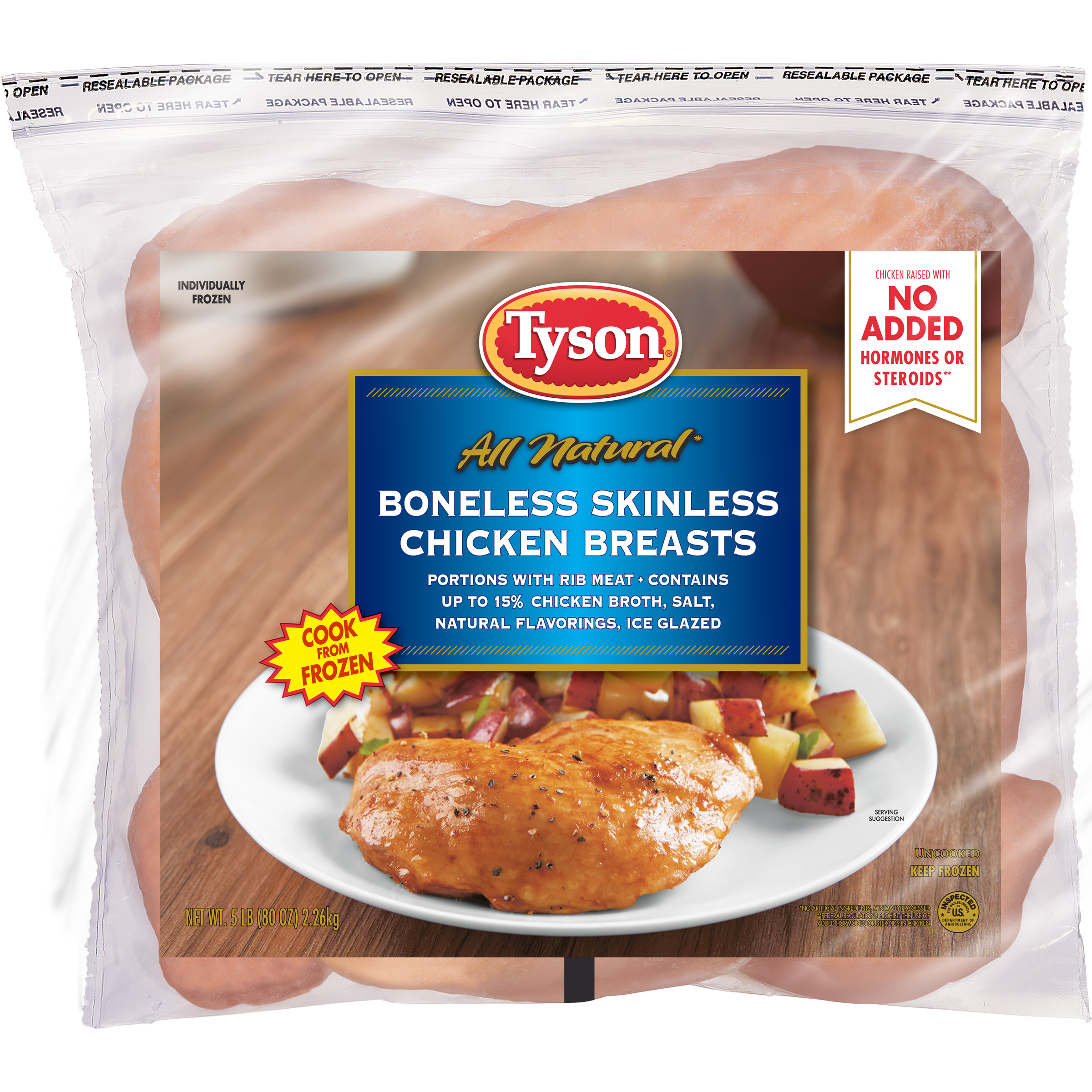 | Retail eCommerce Marketing Message | There's nothing like cooking from scratch, especially when you start with Tyson Individually Frozen Boneless Skinless Chicken Breasts. Our all-natural* chicken is juicy and tender with 20 grams of protein and 0 grams of trans fat per serving. Perfect for grilling and roasting, simply cook and serve our boneless chicken breasts with BBQ sauce for a quick and delicious weeknight dinner. Includes one 5 lb. package of individually frozen chicken. Everything seems to turn out a whole lot better when you just keep it simple. No nonsense. Just stick to the good stuff. The 100% real stuff that makes life, and chicken, great. . Keep it real. Keep it Tyson. *Minimally processed, no artificial ingredients. |