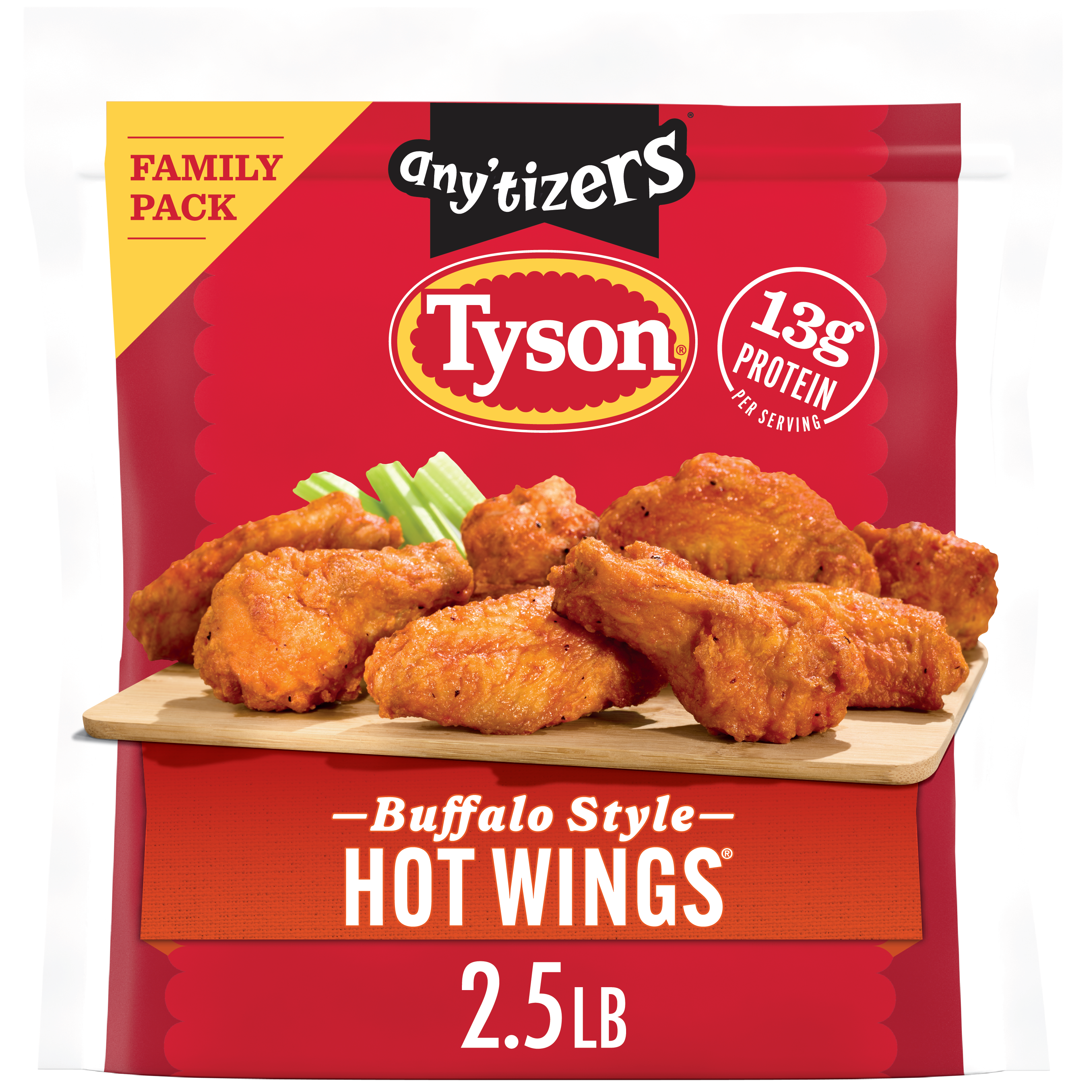 | Retail eCommerce Marketing Message | Tyson Any’tizers Buffalo Style Hot Wings Family Pack is a great way to add some bold flavor to the day. These wings are made from fully cooked 100% all-natural* chicken that is easy to make and enjoy. Perfect for a party, game day, or as an addition to a meal, the Buffalo style Hot Wings bring the flavor with a hot and tangy sauce coating. Whether enjoyed as an appetizer or a snack, these chicken wings have no added hormones or steroids** and contain 13g of protein per serving. Keep frozen until ready to prepare, then pop them in an air fryer or oven for delicious Tyson Any'tizers Buffalo Style Hot Wings. *Minimally processed, no artificial ingredients **Federal regulations prohibit the use of added hormones or steroids in chicken |