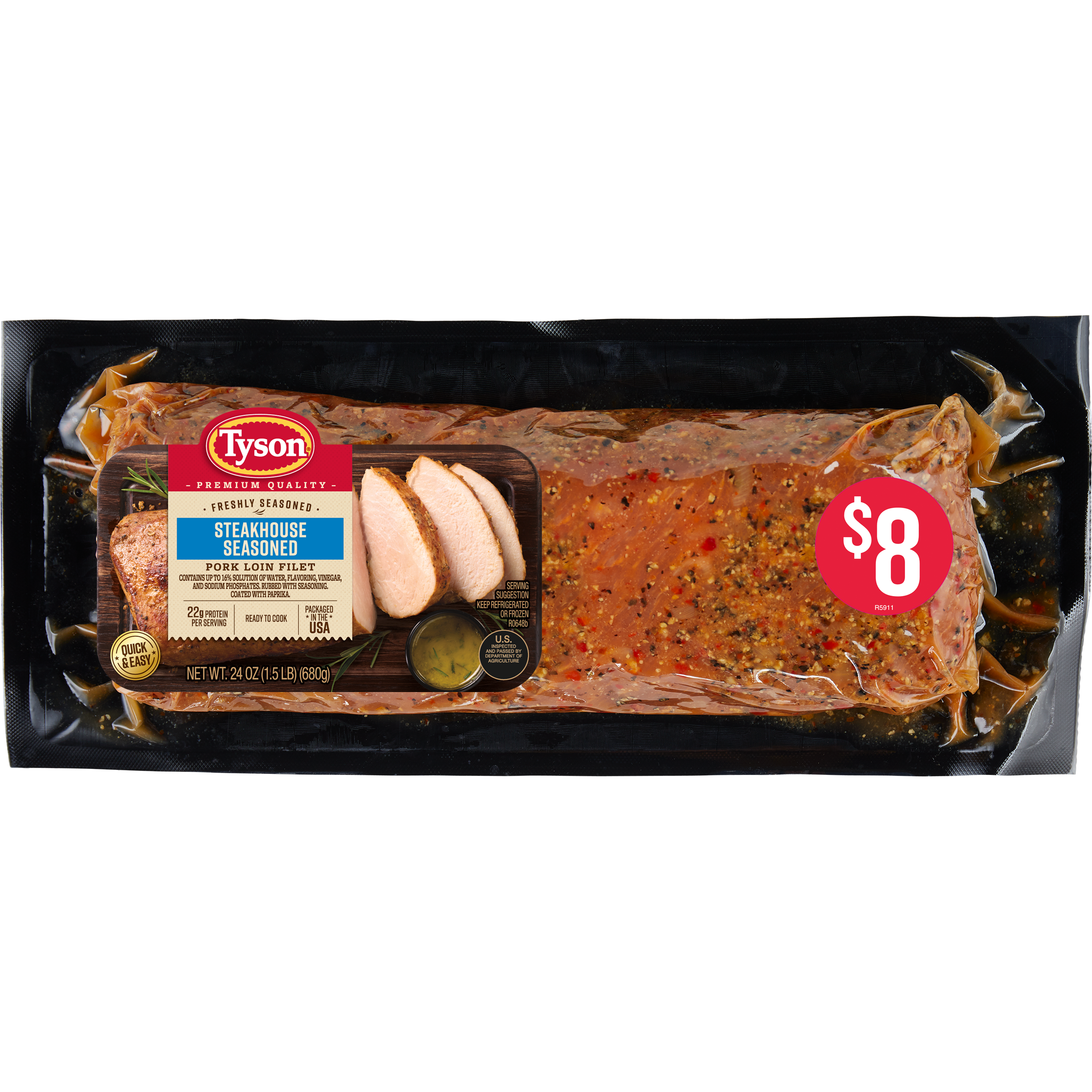 | Retail eCommerce Marketing Message | The Tyson® Steakhouse Seasoned Pork Loin Filet product is a high quality and boneless pork loin cut. This is perfectly seasoned for bold steakhouse flavor and is great for grilling, smoking or baking. Provides 22 grams of protein per serving. |